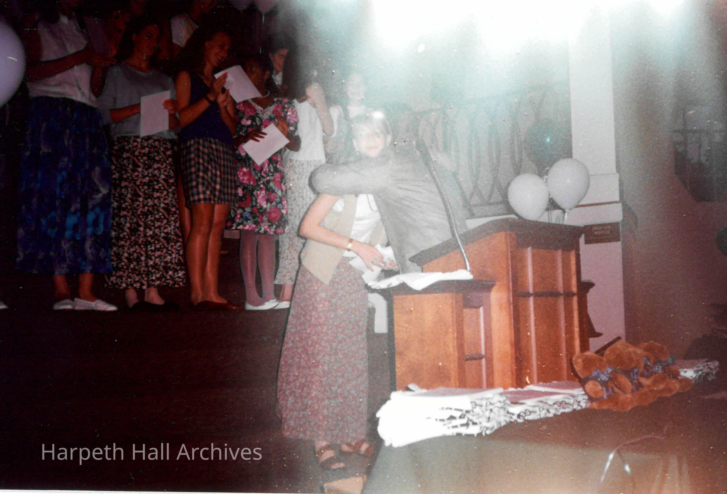 A student hugging a presenter while a group of students are standing on the steps in the Marnie Sheridan Gallery in the McMurry Center. Appears to be some sort of award ceremony.Collection