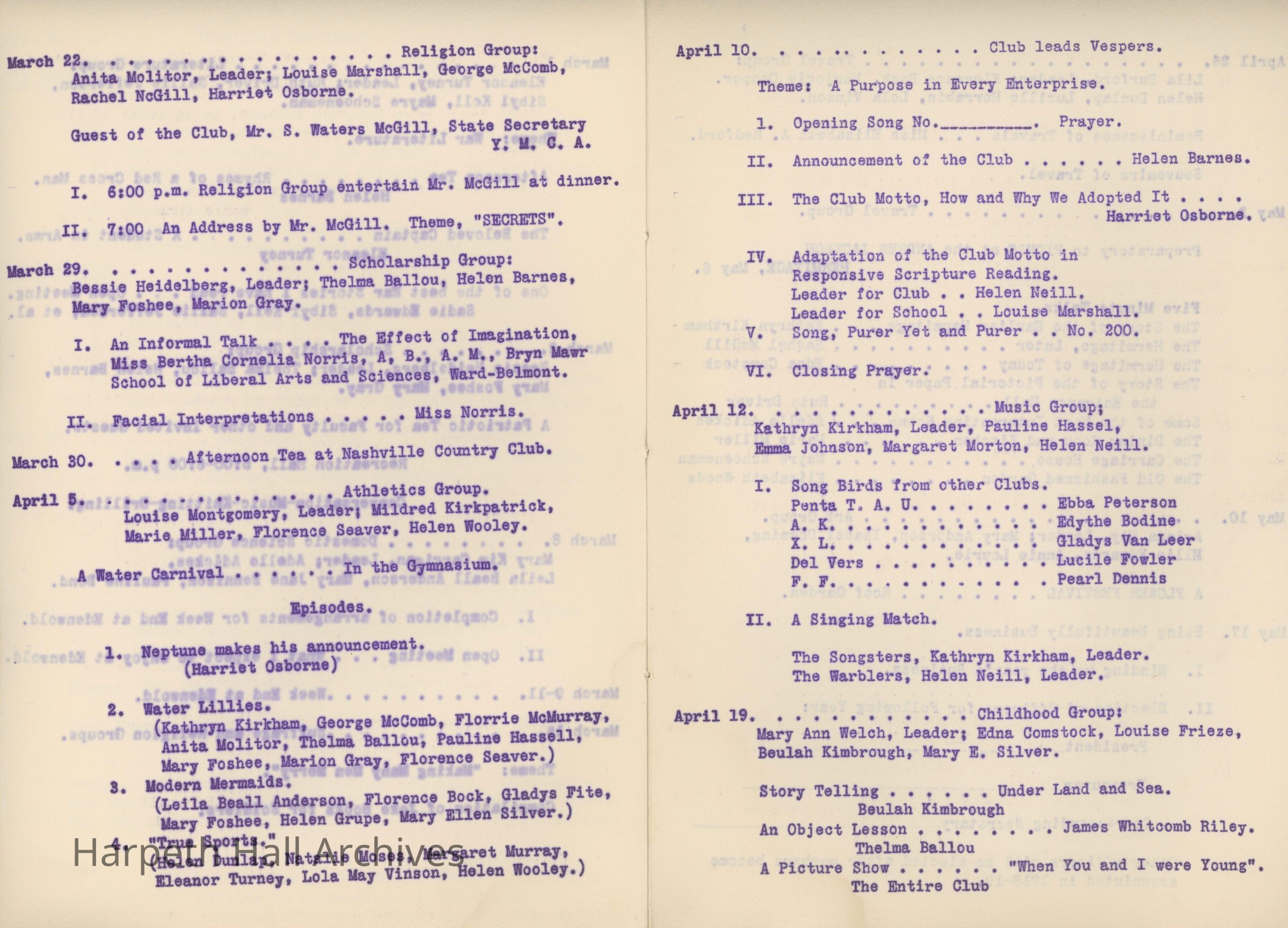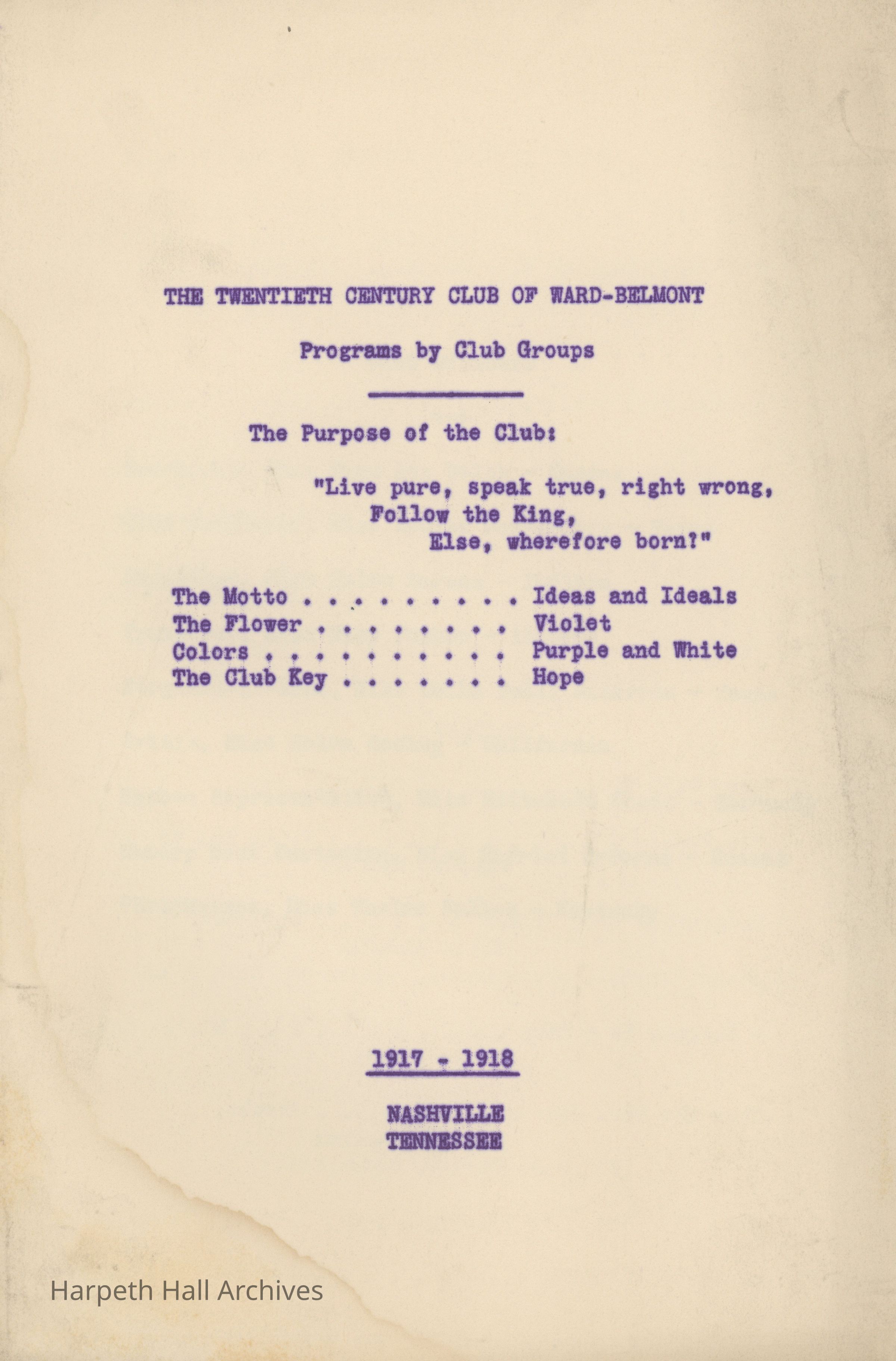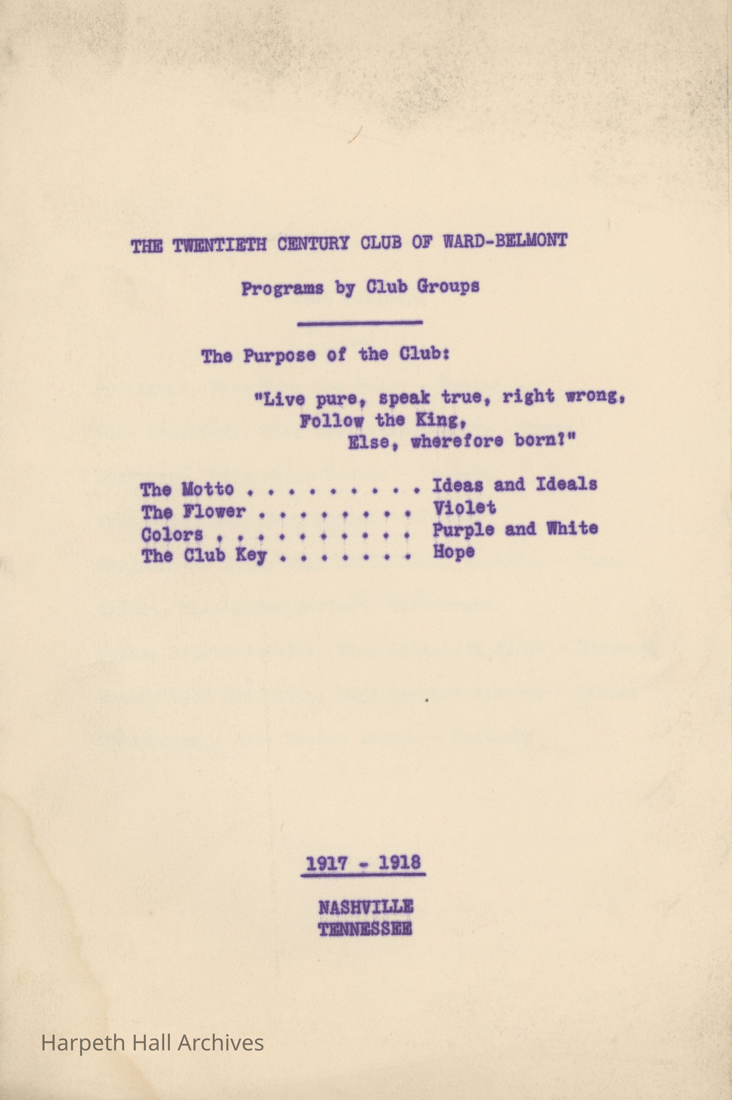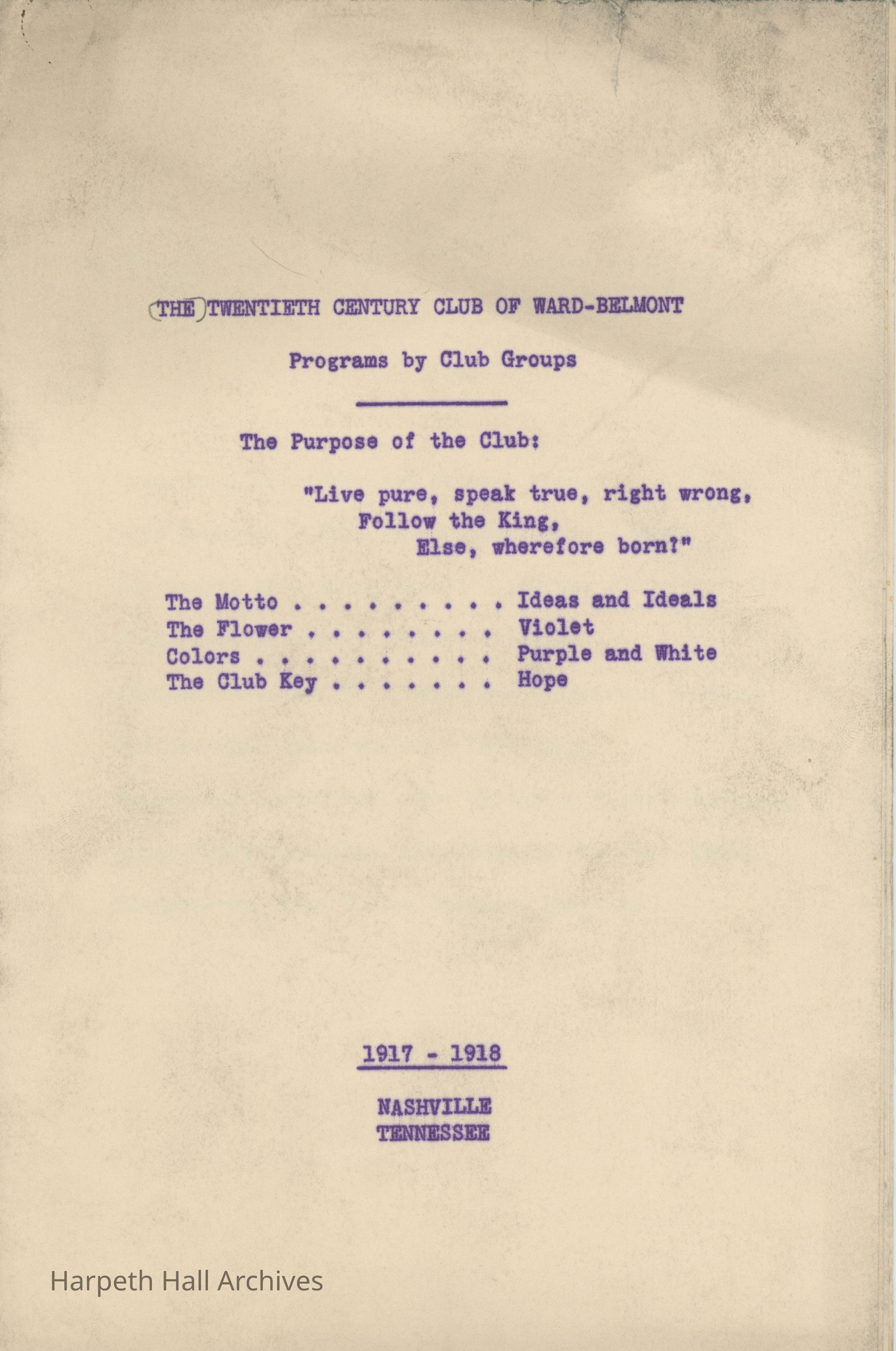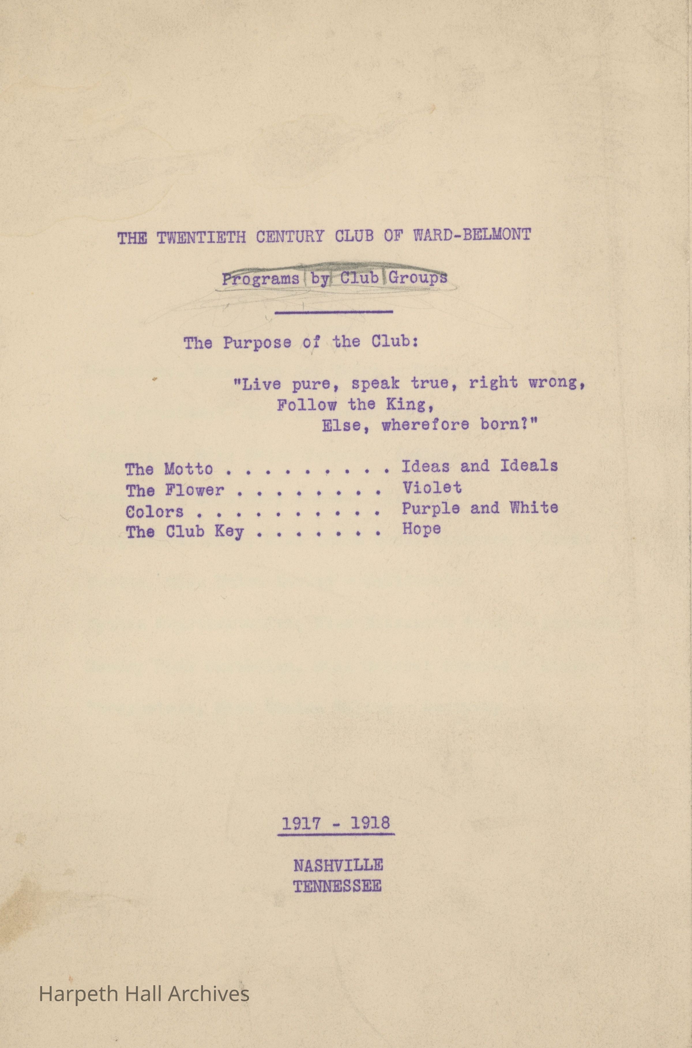 The Twentieth Century Club (T.C.C.) was a student organization and one of ten social clubs at Ward-Belmont, organized November 24, 1916. The club's purpose was an excerpt from English poet Alfred, Lord Tennyson's collection Idylls of the King, specifically “Gareth and Lynette" (1872): "Live pure, speak true, right wrong, follow the King, Else, wherefore born!" The club's motto was "Ideas and Ideals." Per the 1943 Milestones yearbook, club members "strive toward one goal - the maintenance of the high ideals of both their club and their school."Collection
