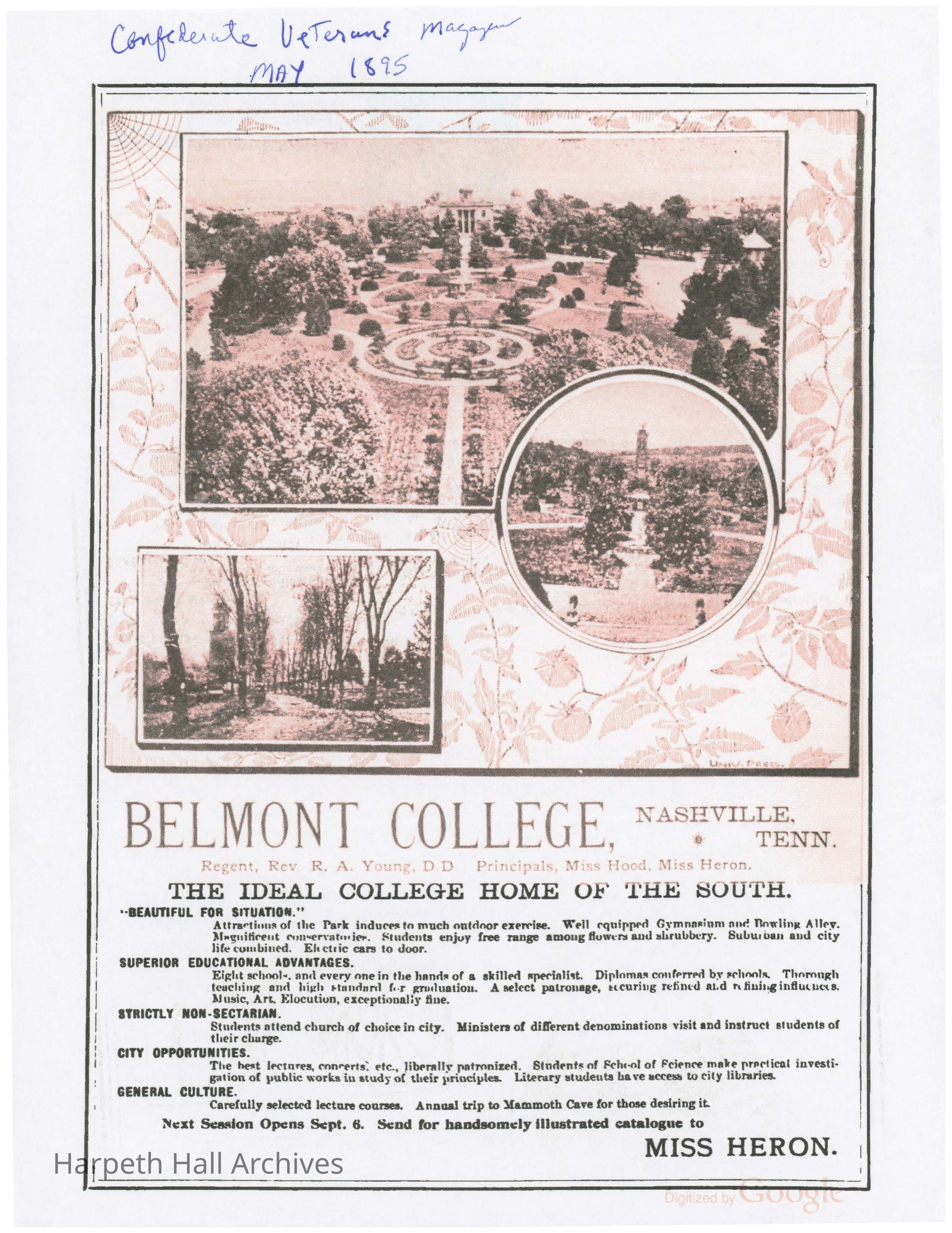 Advertisement for Belmont College which appeared in a May 1895 edition o Confederate Veterans Magazine.Context
