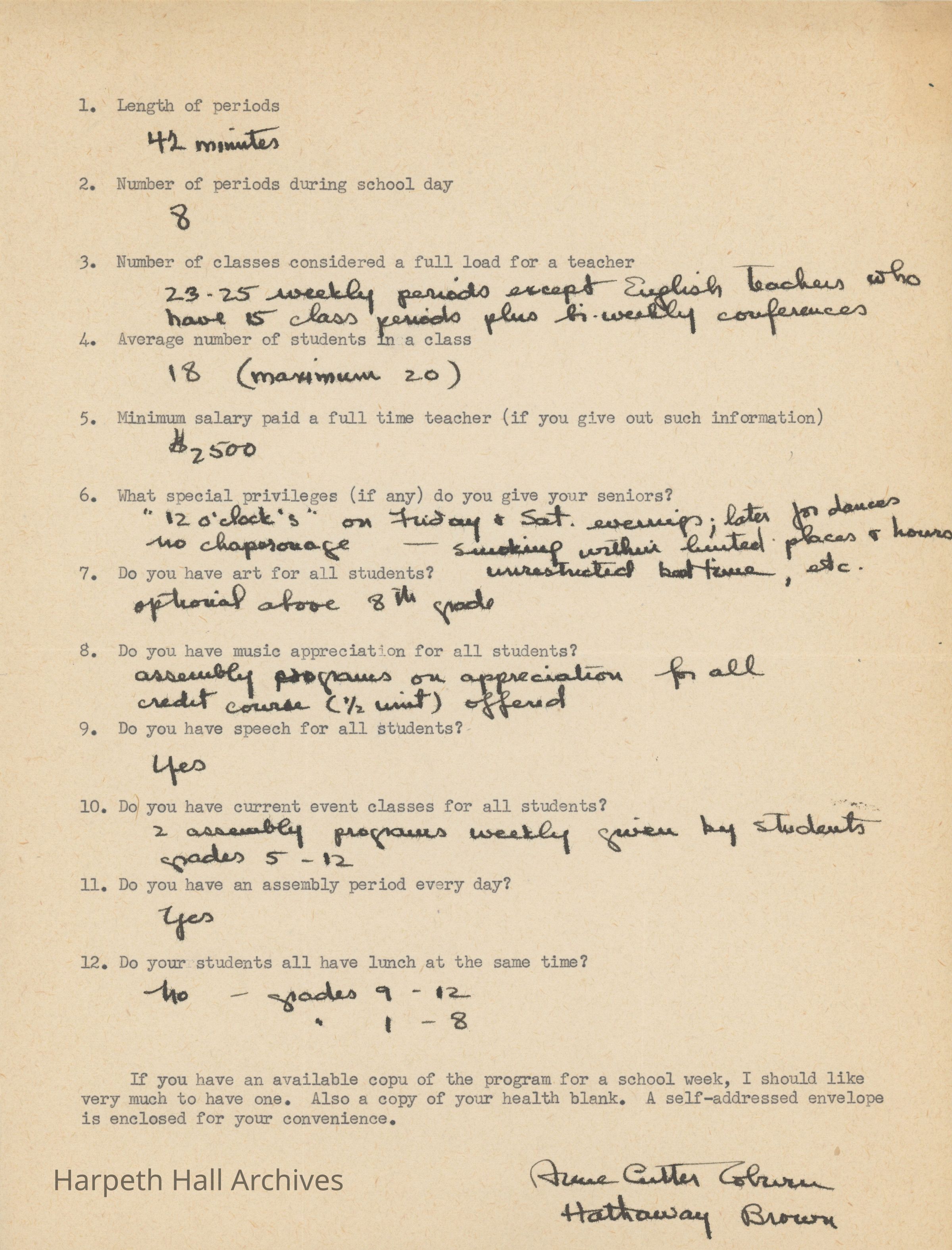 As Harpeth Hall was soon to open in September 1951, Susan Souby sent questionnaires to several preparatory schools across the country, likely to see how other schools operated and to adopt various practices from each to incorporate into Harpeth Hall. It seems that in her original letter, Mrs. Souby requested a copy of the medical cards and schedules the schools used.Collection