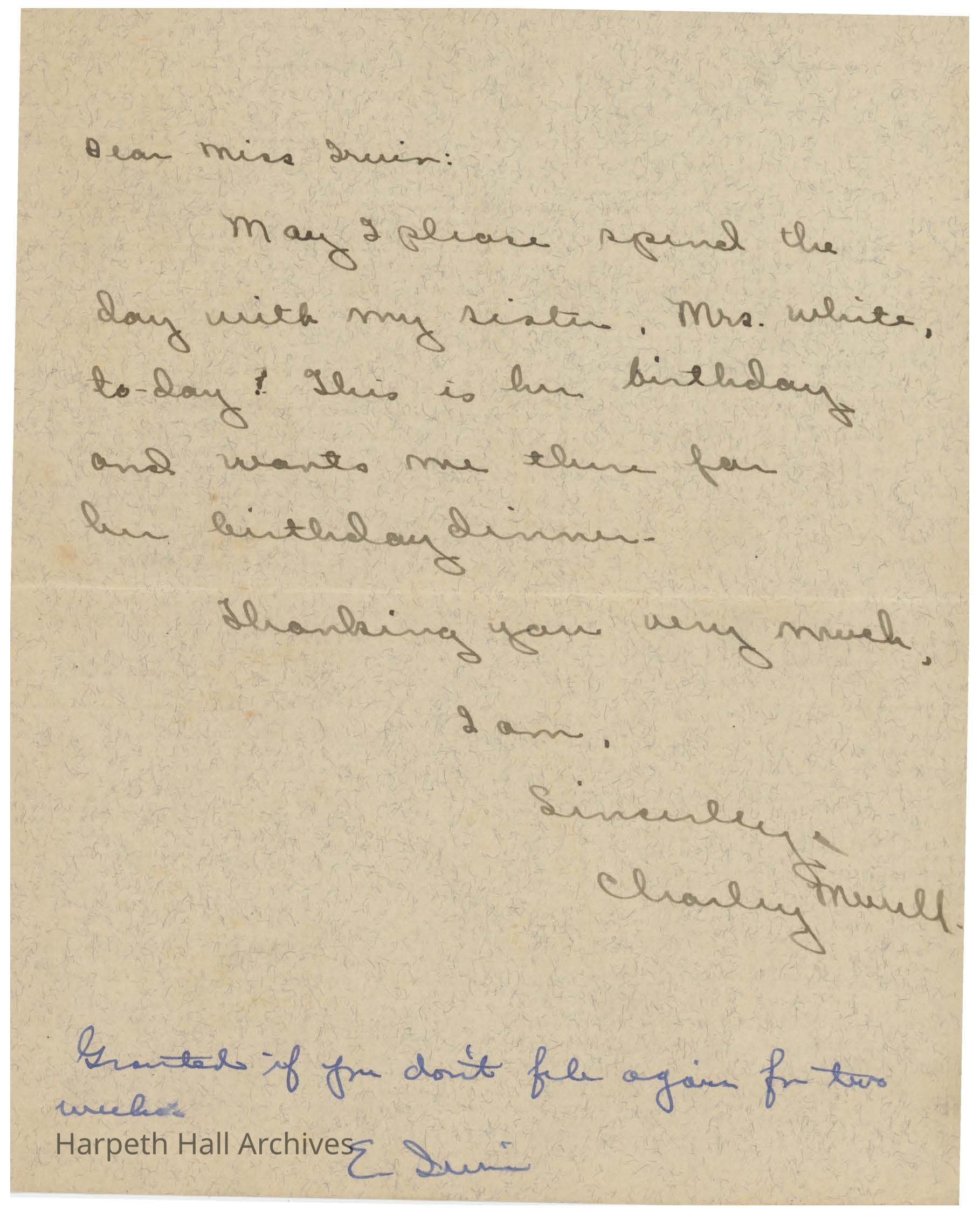 May I please spend the day with my sister, Mrs. White, to-day? This is her birthday and wants me there for her birthday dinner.