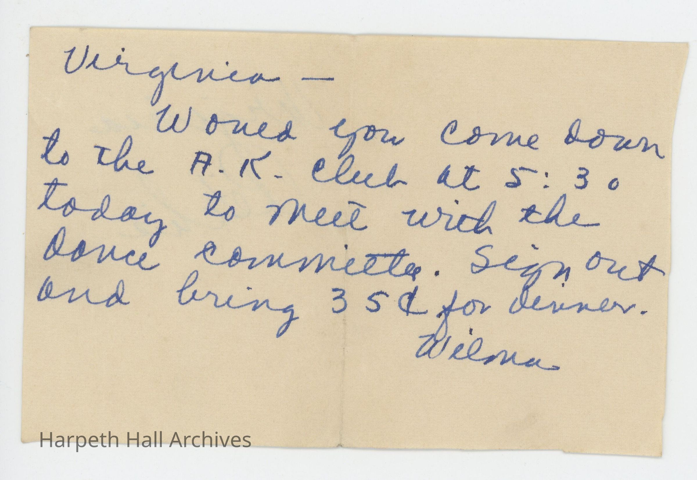 A letter addressed to Virginia Richey inviting her to meet with the AK Club dance committee.Collection
