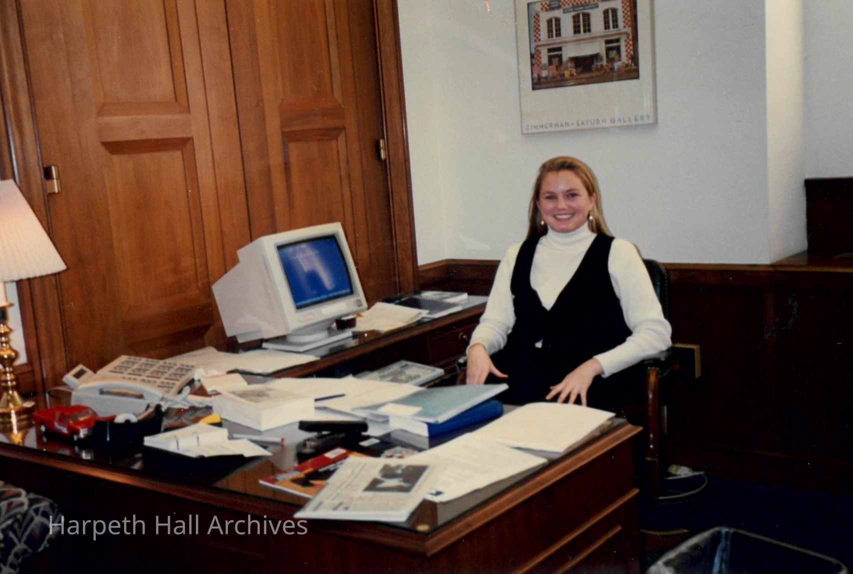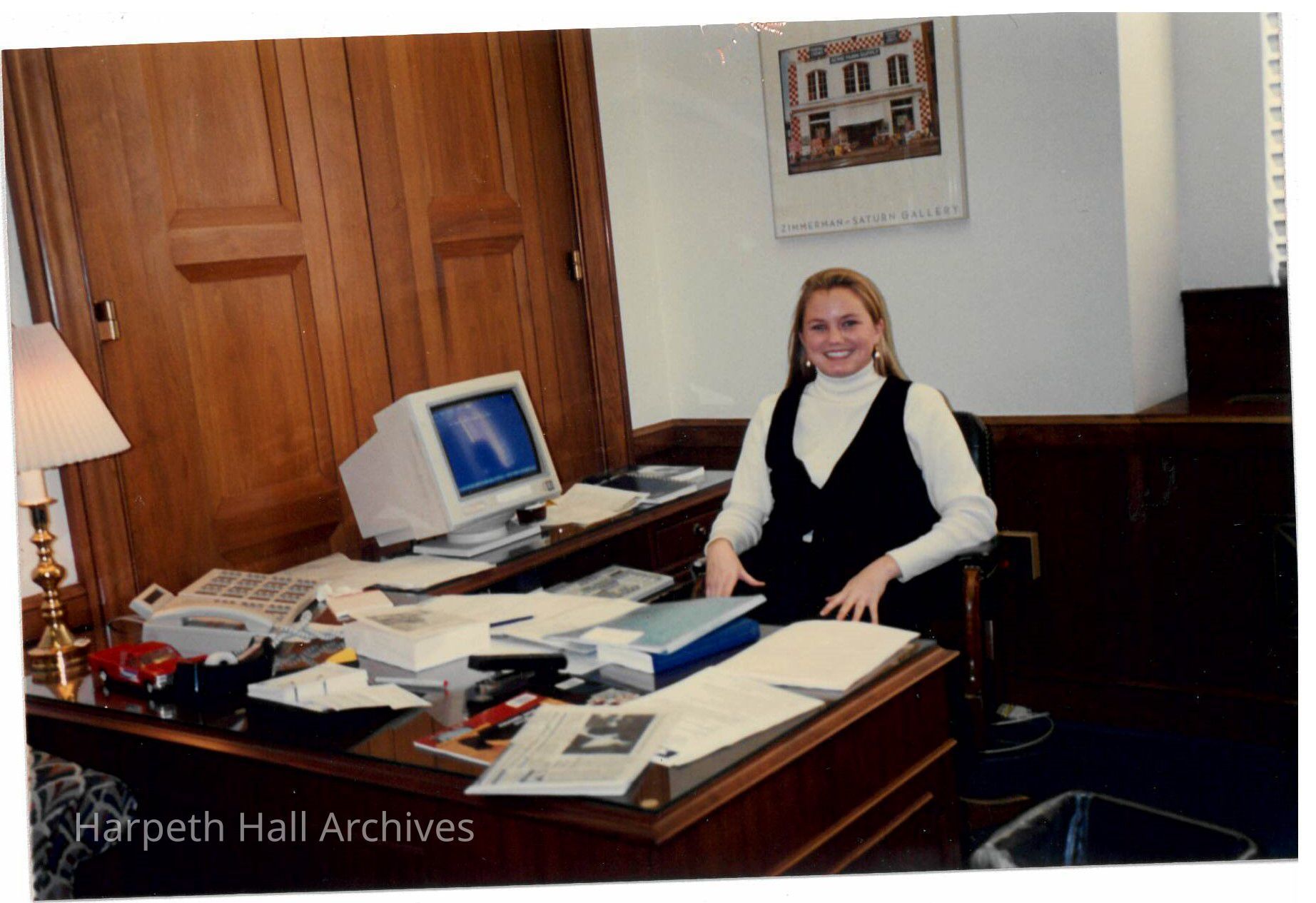 A photo of then-junior Comer Ireland (class of 1996) working in the office of Senator Fred Thompson during Winterim 1995. That year, two political work-study options were offered. Details per the 1995 Winterim course catalog:
