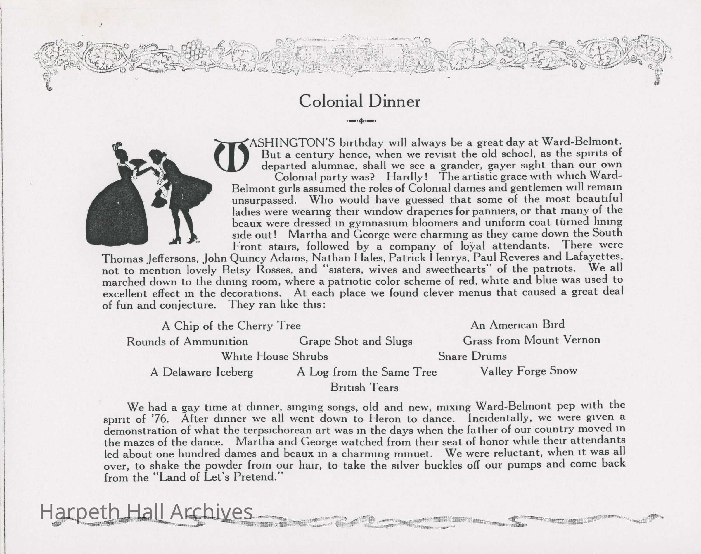 A program from Ward-Belmont's George Washington Celebration in 1920 when the event included a "colonial" dinner.