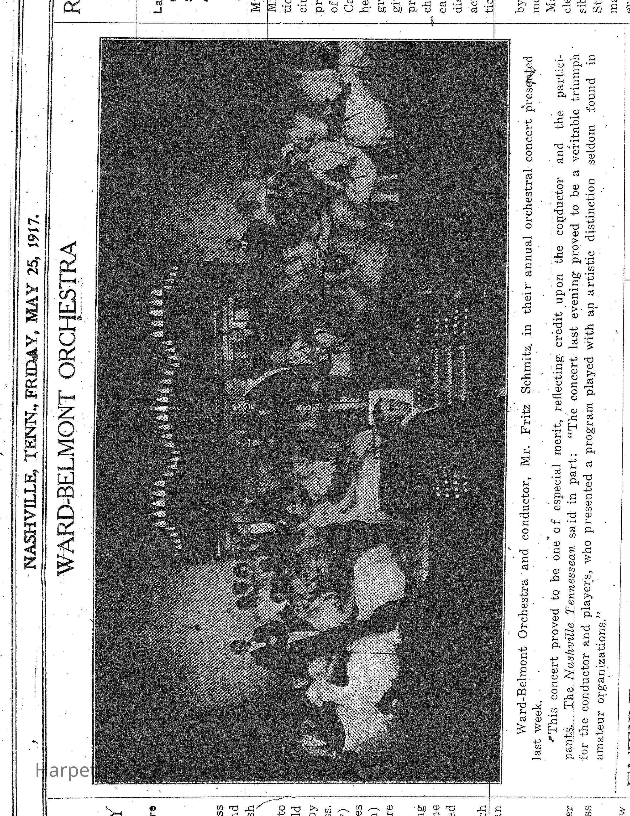 The Ward Belmont Orchestra preforms, directed by Mr. Fritz Schmitz on May 25, 1917