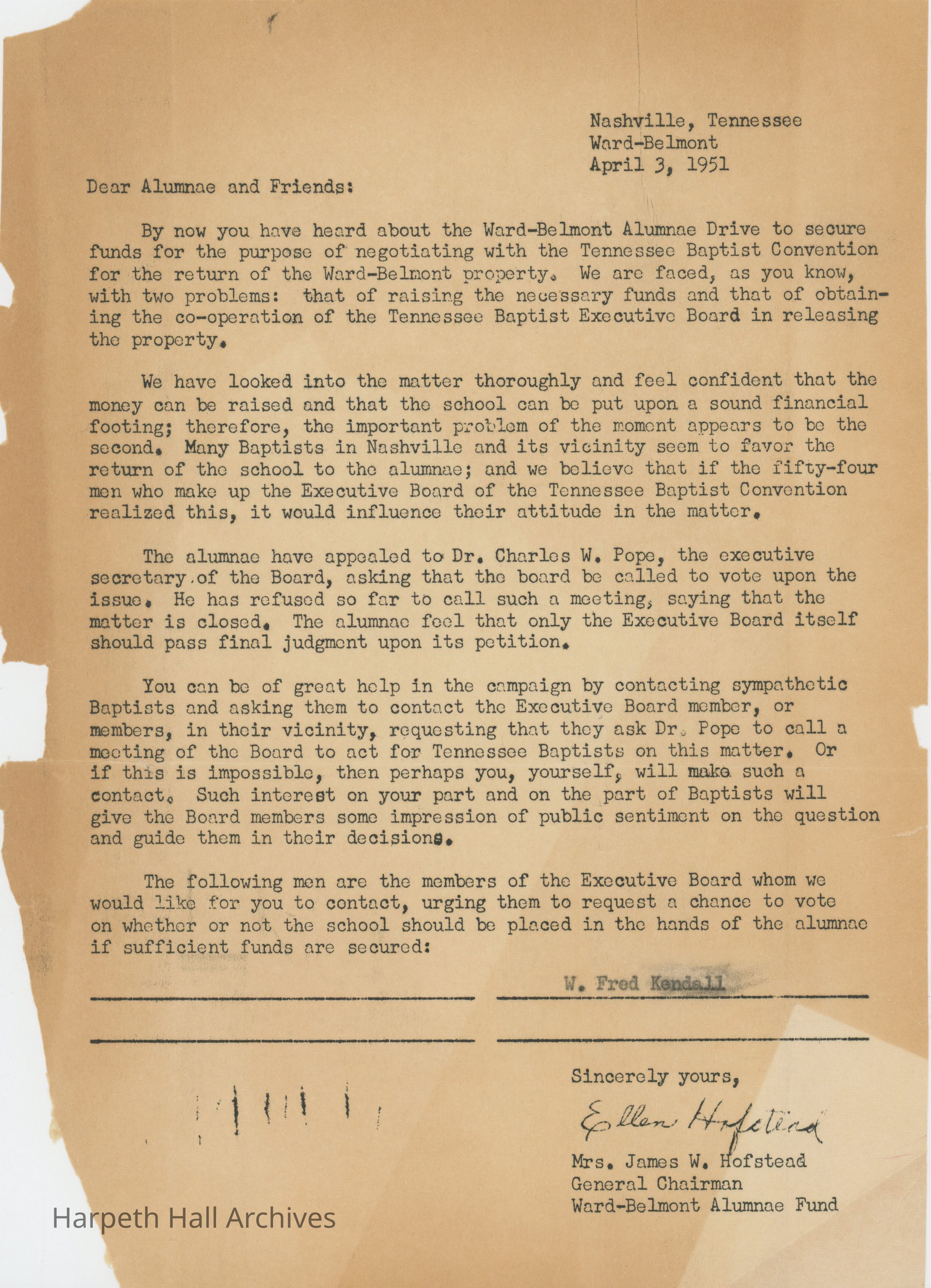 Letter encouraging Ward-Belmont alumnae to contact the Tennessee Baptist Executive Board to show the public support for returning Ward--Belmont to the alumnae. The letter states that they believe the money can be raised to support them in negotiations, but public support could be incredibly persuasive to the TBC board in convincing them to relinquish control of WB.Collection
