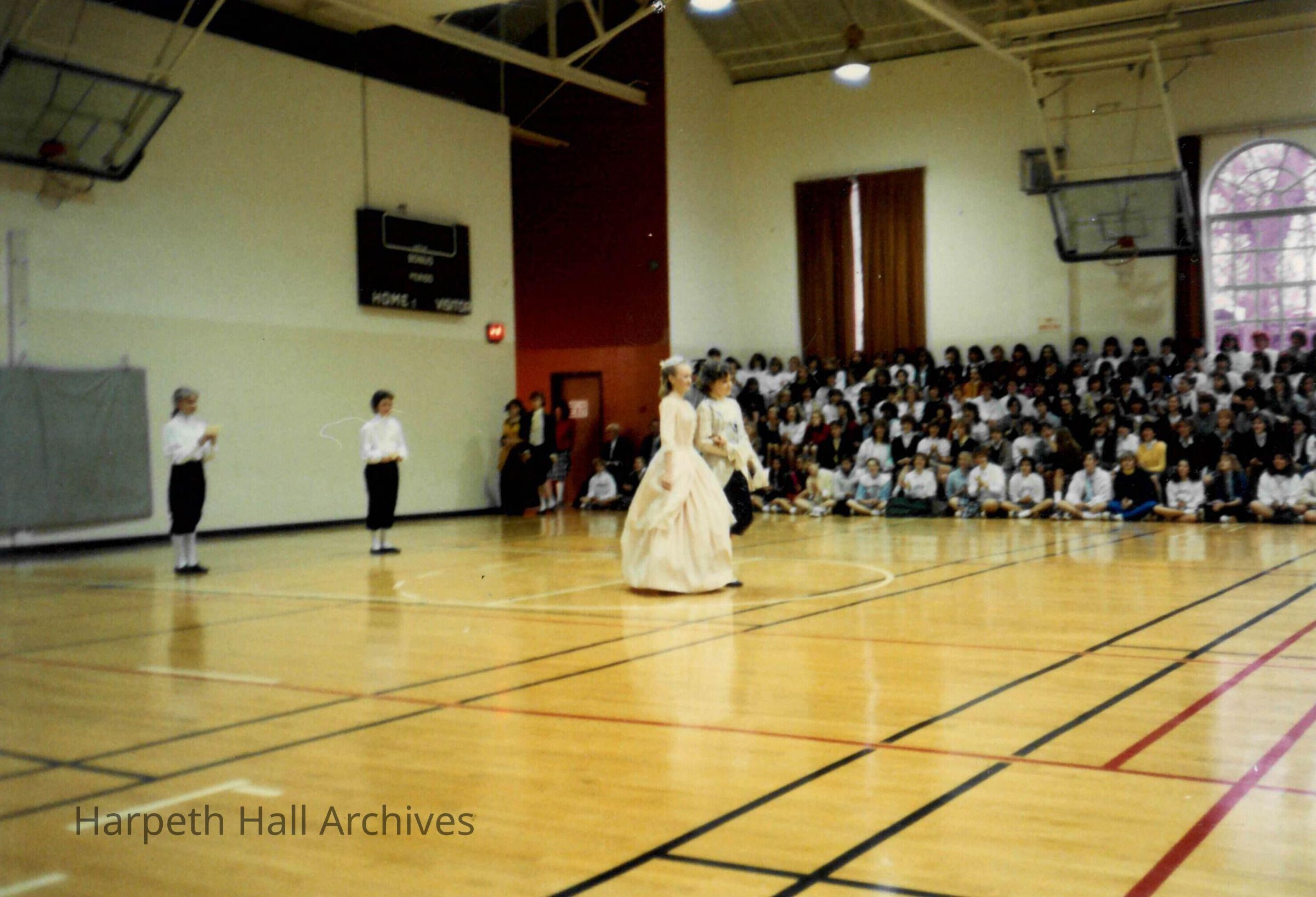 Two students dressed as a lady and a gentleman entering as the Pages introduce them during the George Washington Day Celebration. The photo is taken in Morrison Gym in the McMurry Center.Context