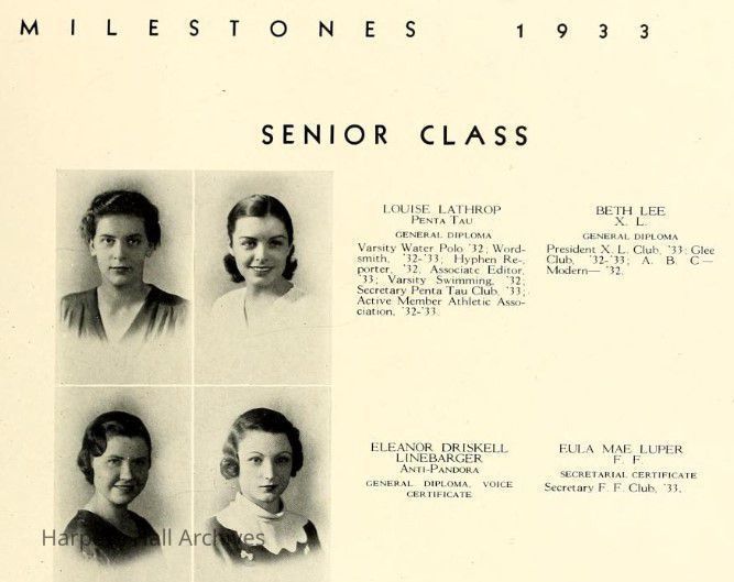 From the 1933 Milestones: "Eleanor Driskell Linebarger, Anti-Pandora, General Diploma, Voice Certificate"Collection