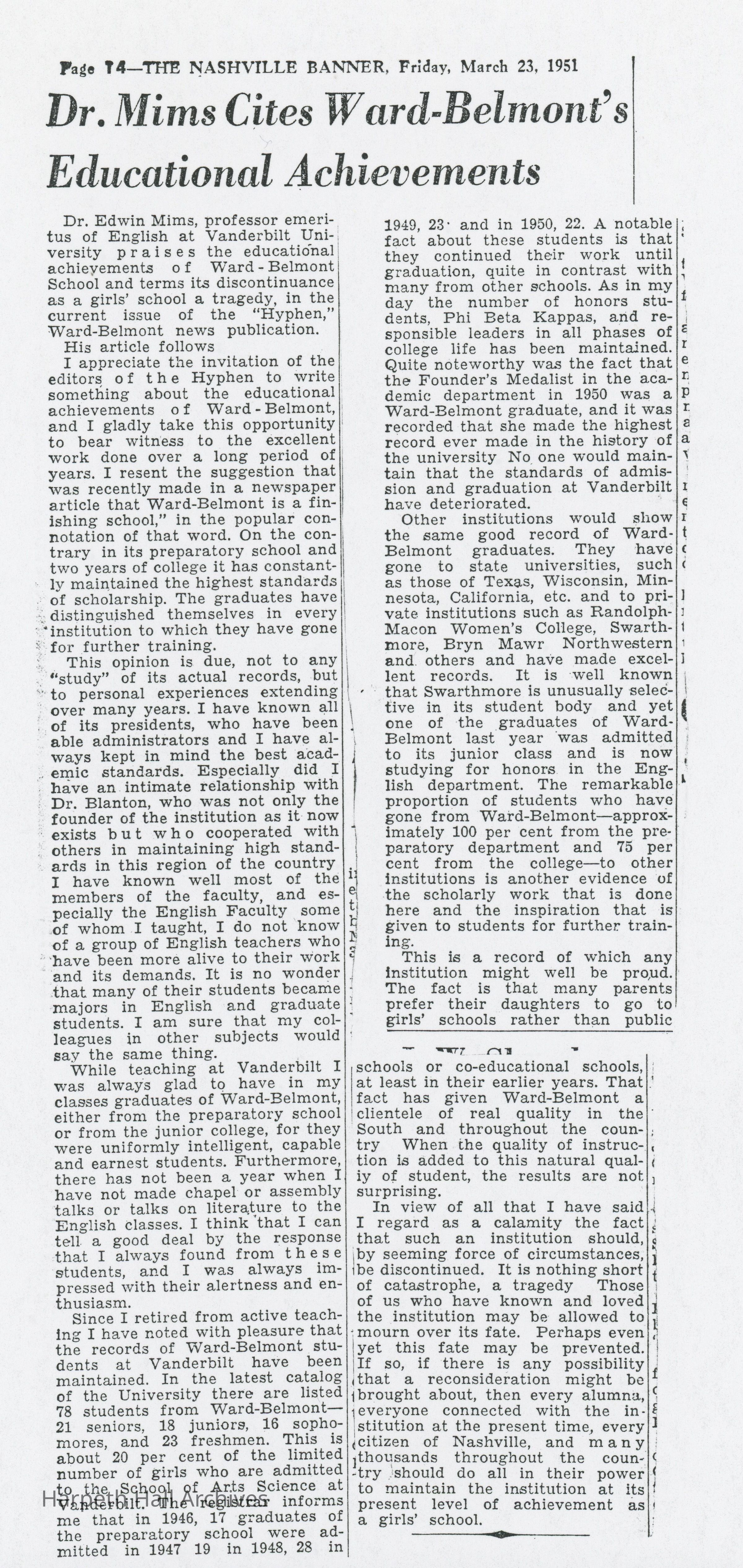 Article citing Dr. Mims who praises Ward-Belmont's education of girls and young women.