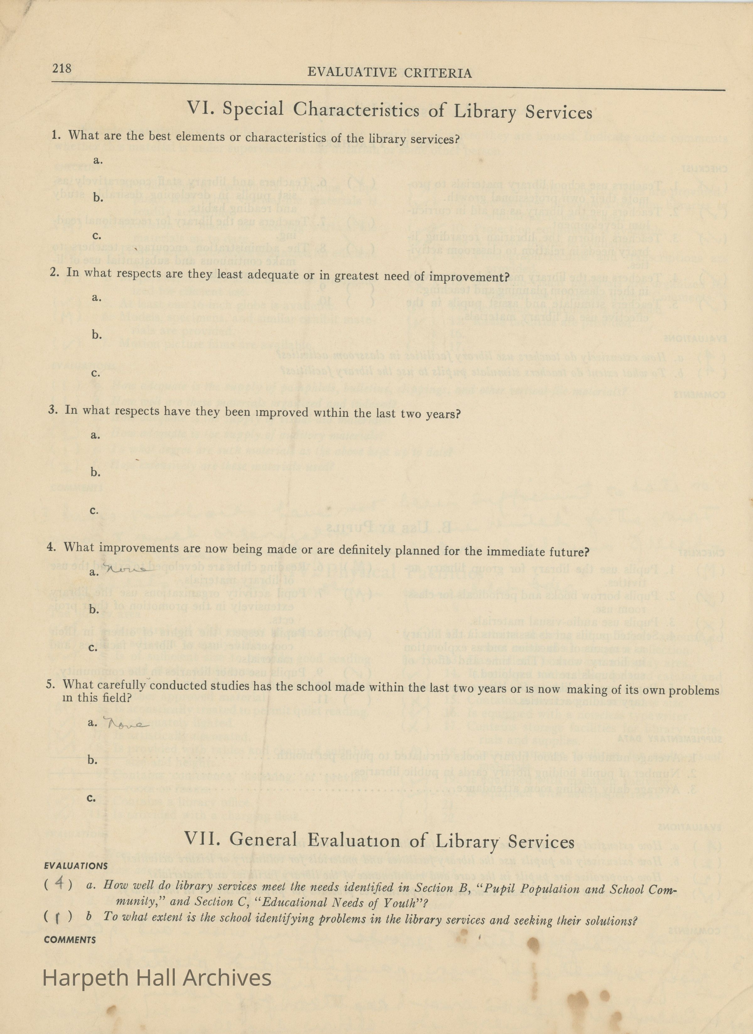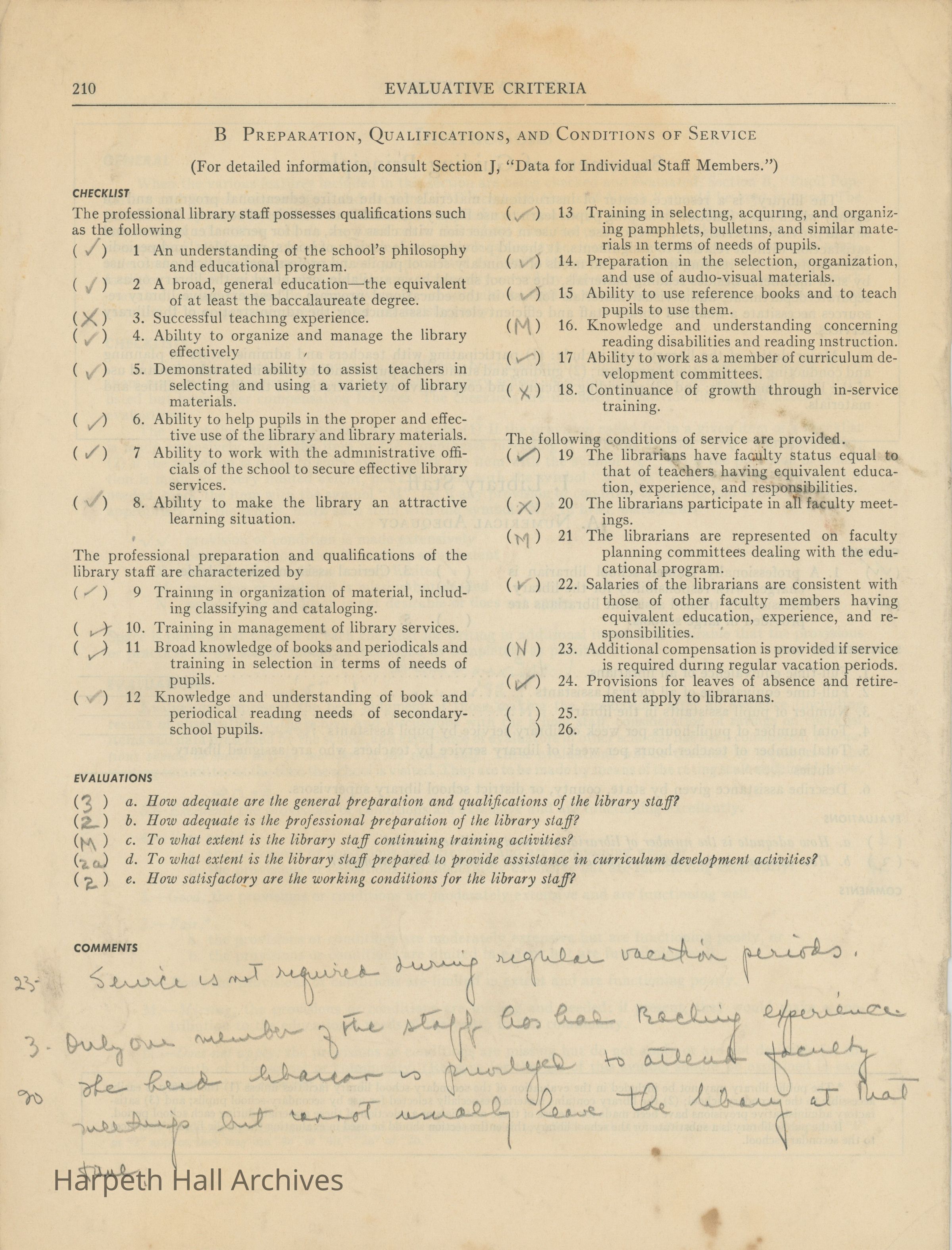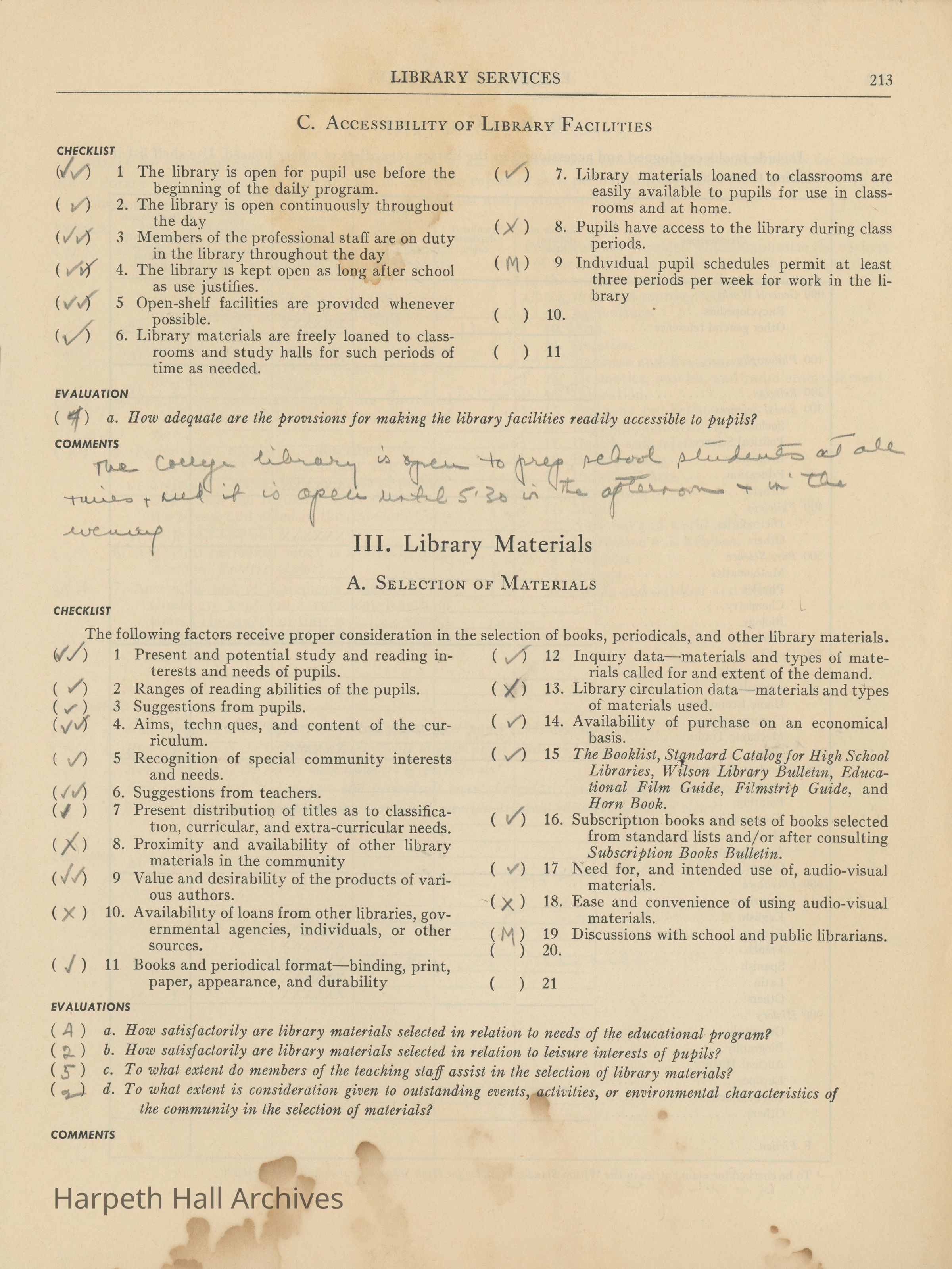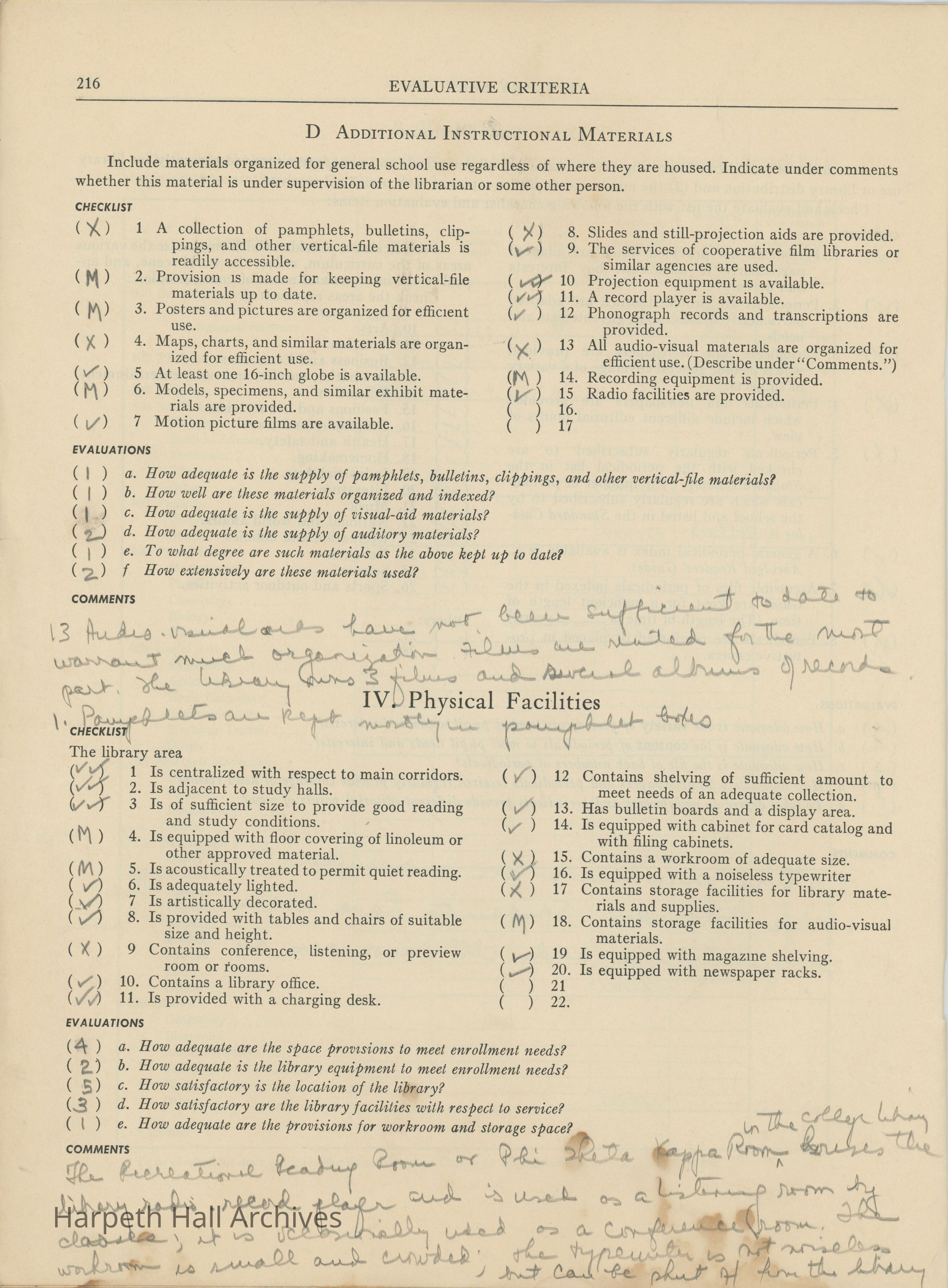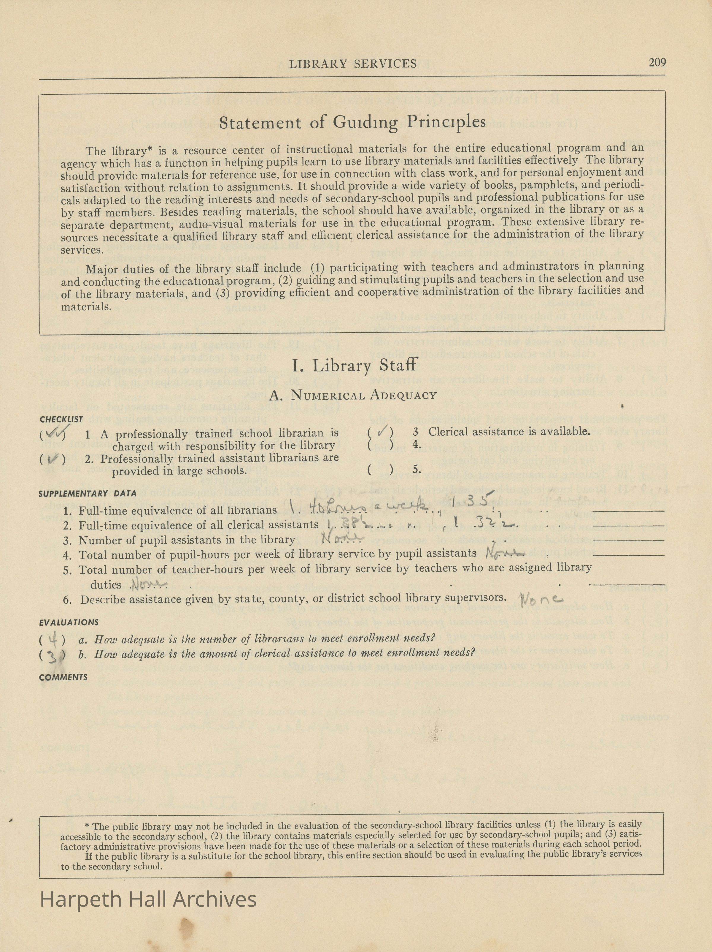 Library Services, Section F of "Evaluative Criteria". The evaluation covers library staff, organization and management, library materials, physical facilities, use of library, special characteristics of library services, and a general evaluation of library services.Collection