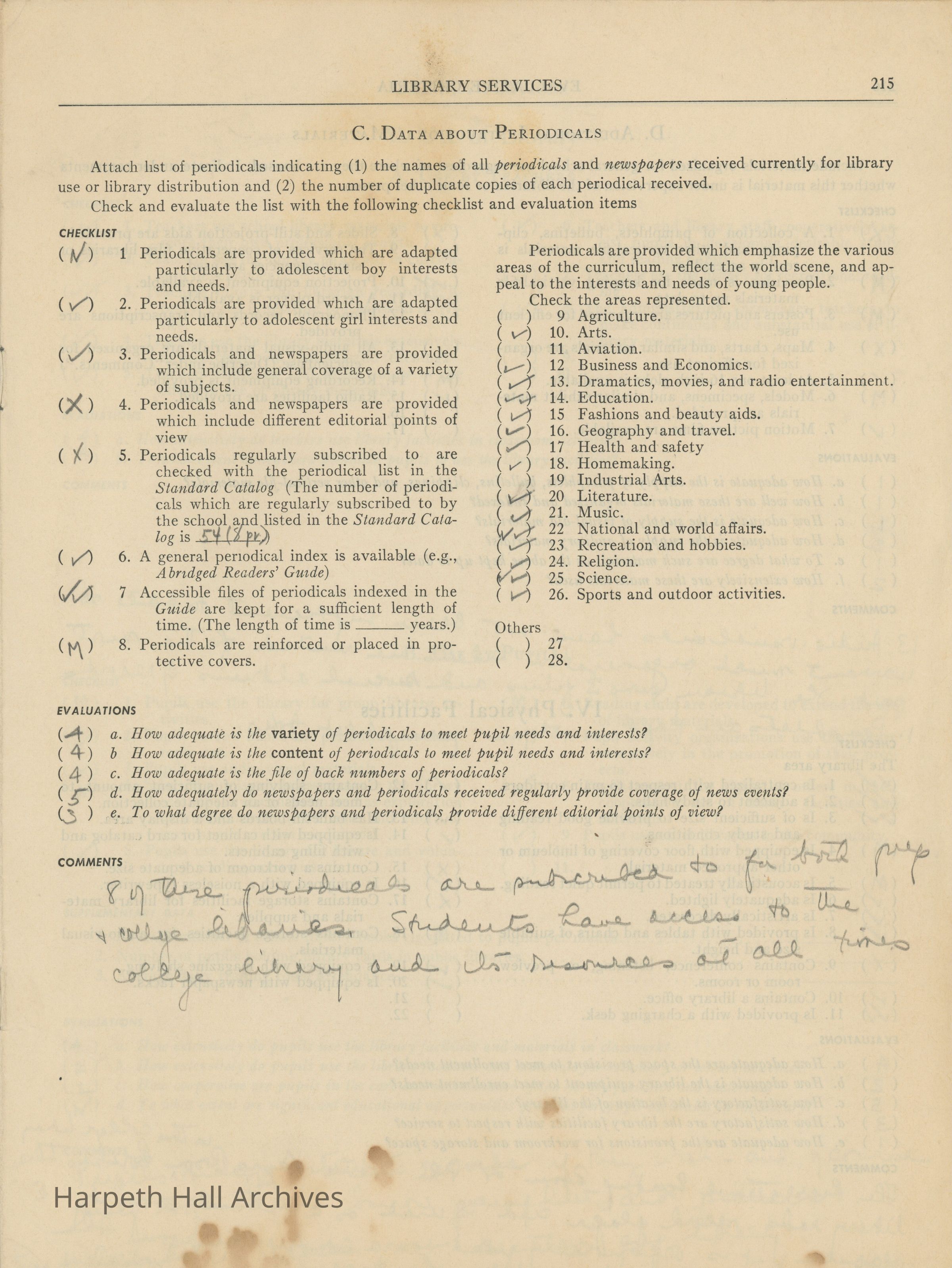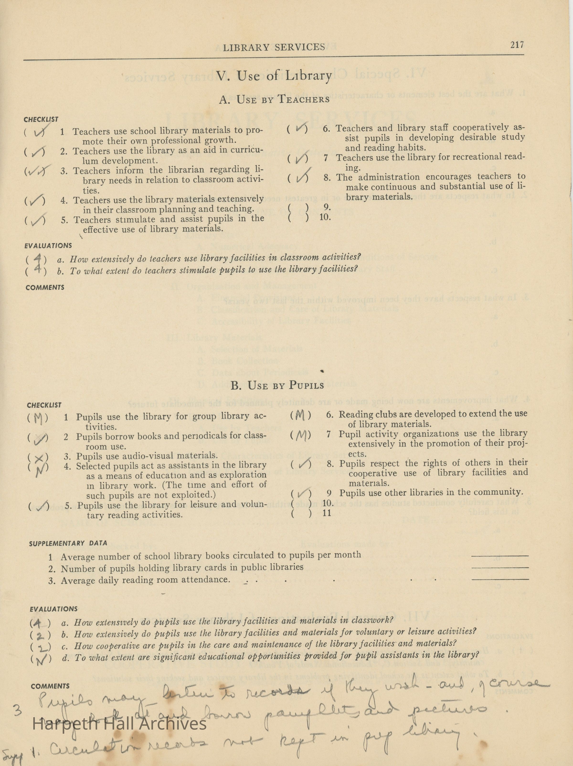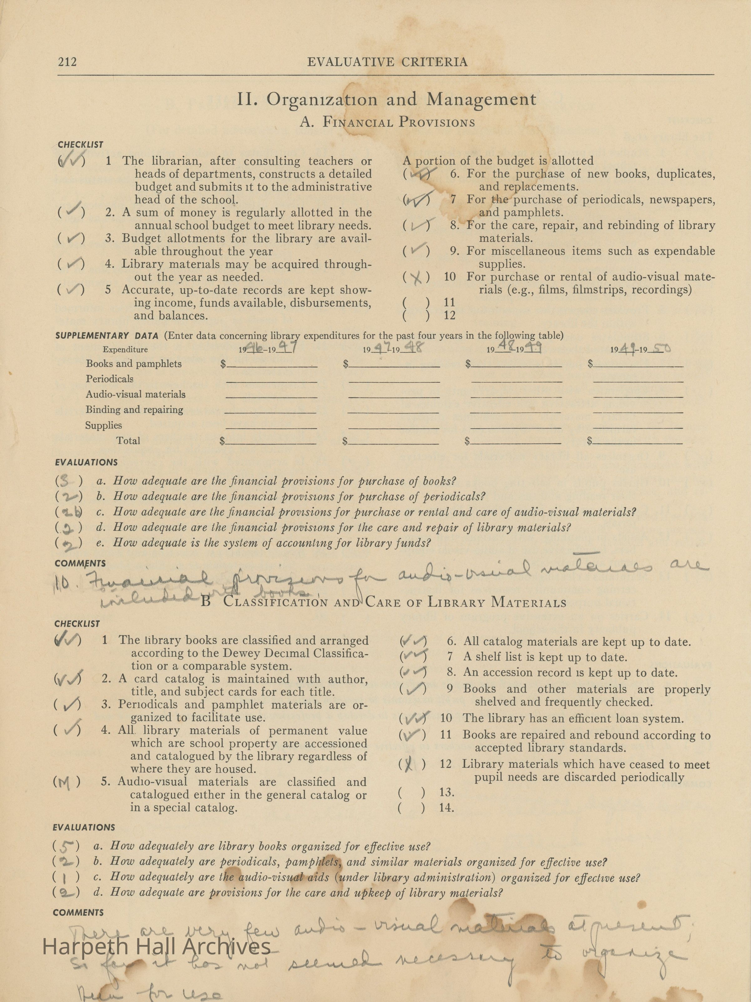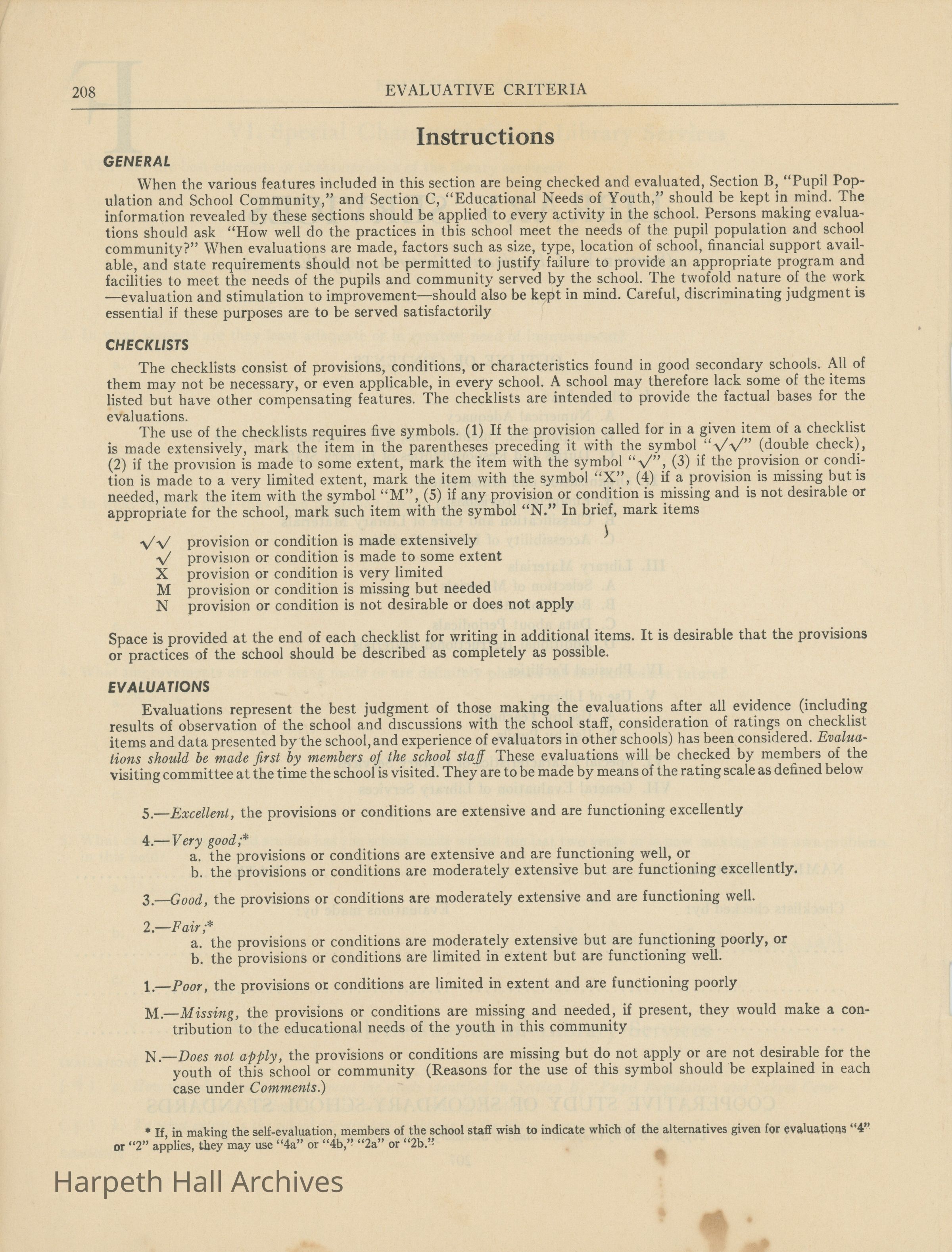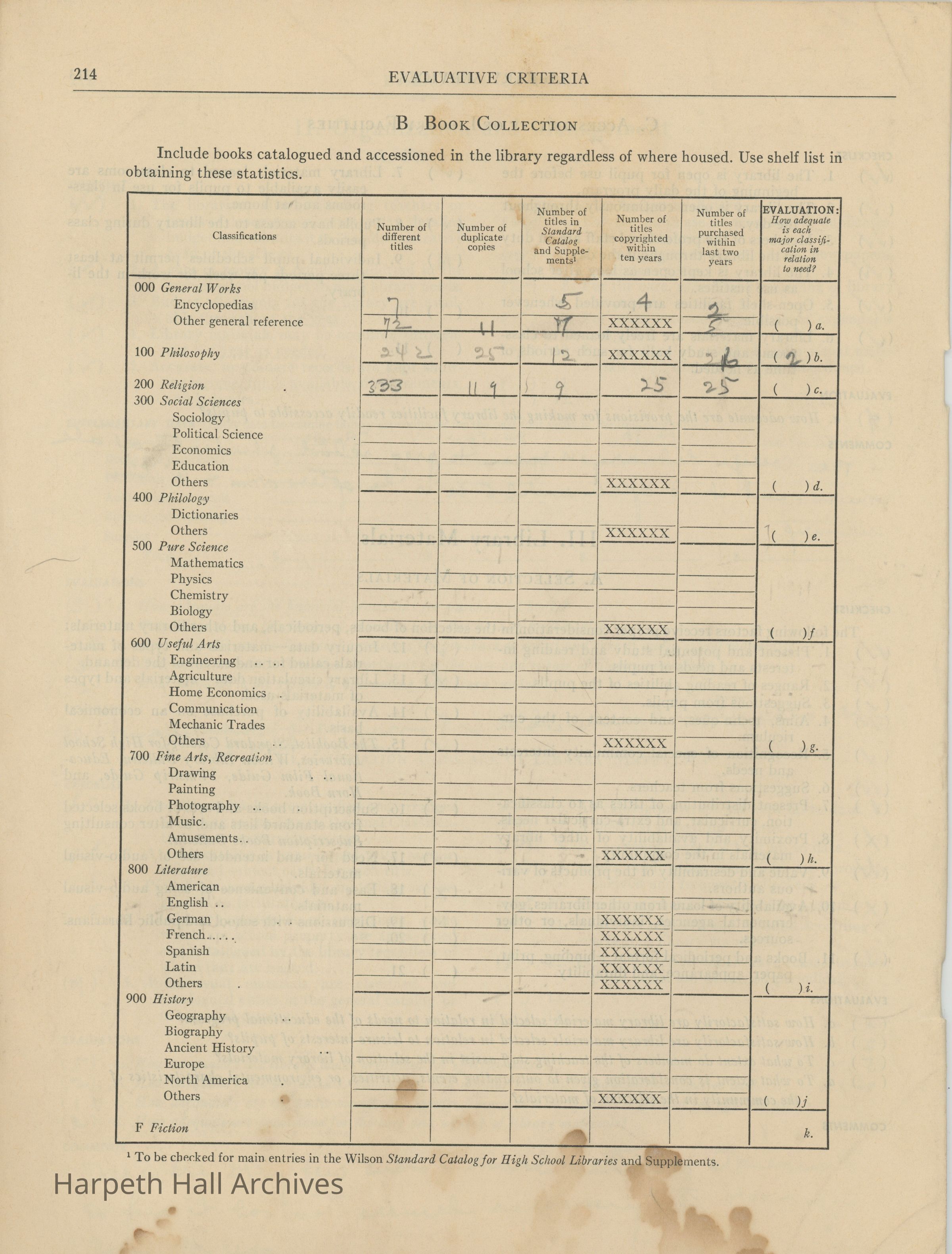 Library Services, Section F of "Evaluative Criteria". The evaluation covers library staff, organization and management, library materials, physical facilities, use of library, special characteristics of library services, and a general evaluation of library services.Collection