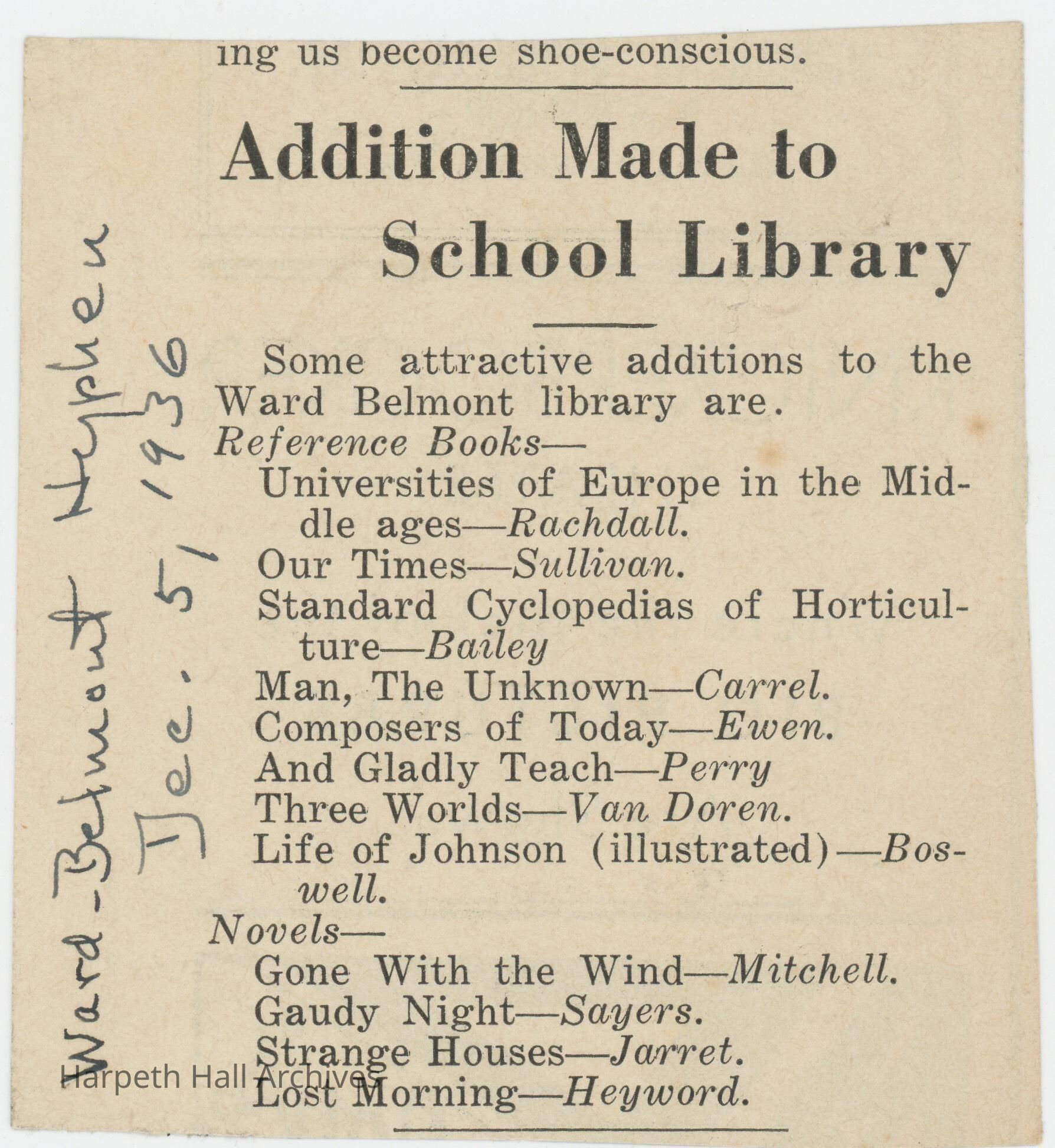 A clipping from the school newspaper, the Ward-Belmont Hyphen, discussing new book additions to the school library (8 reference books and 4 novels). Dated December 5, 1936.Collection