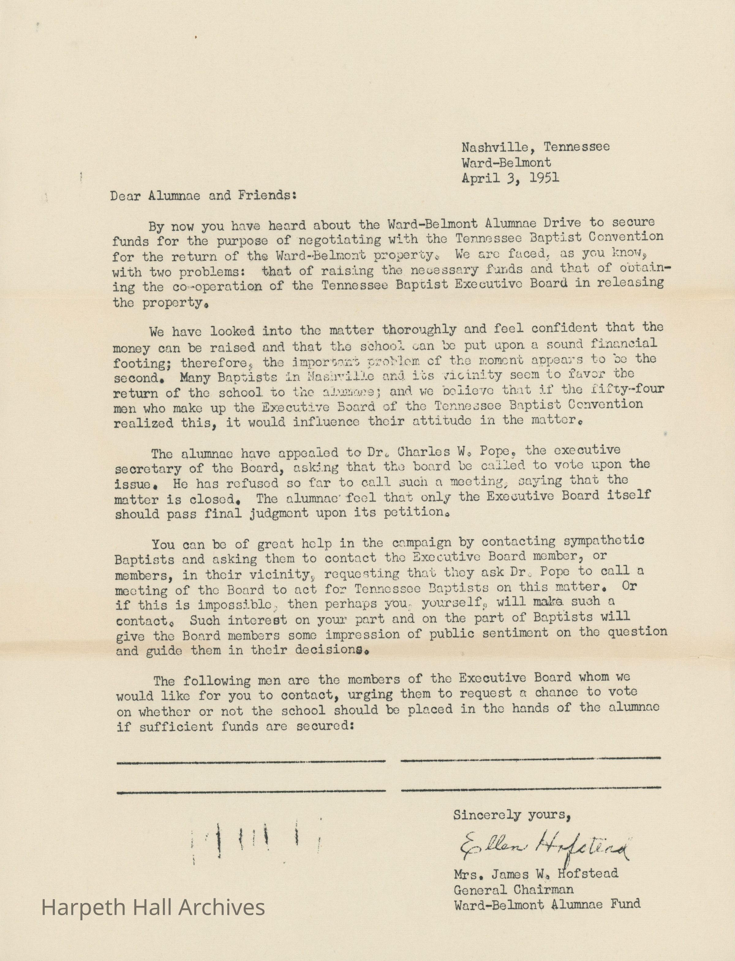 A letter to Ward-Belmont community members addressing the Ward-Belmont Alumnae Fund and their appeals to the TBC and Dr. Pope. It encourages alumnae and supporters to contact the Board themselves as a way of showing the large community support behind the WB alumnae acquiring the property.Collection