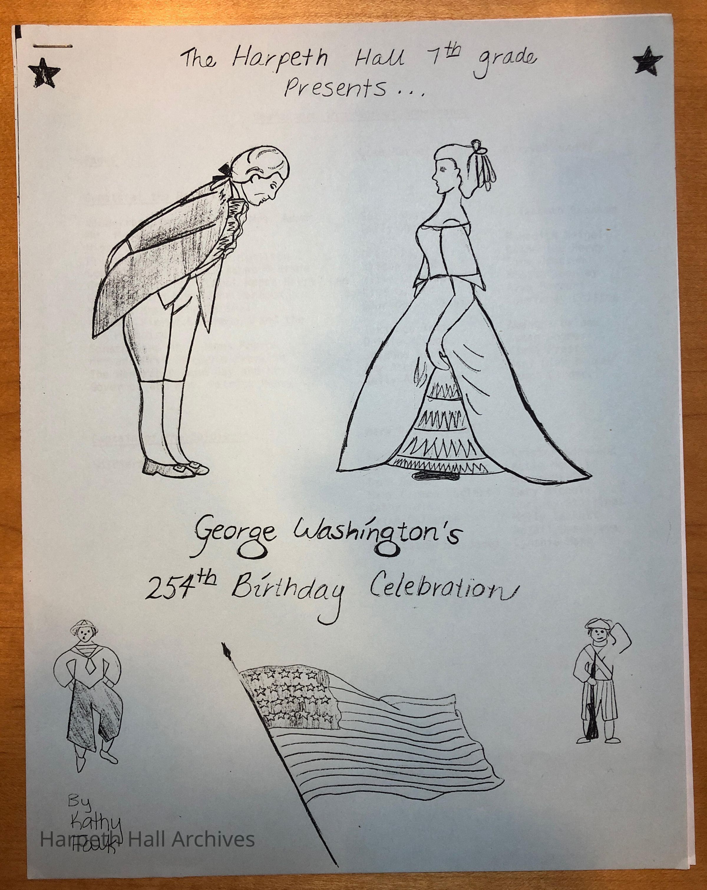 The 1986 program for the George Washington Day Celebration put on by the class of 1991 when they were in the seventh grade. George Washington was played by eighth grader Anne "Courtney" Coker (1990) and Martha Washington was played by eighth grader Julia Sutherland (1990). Front cover design by Katherine "Kathy" Falk Carpenter (1991).Context