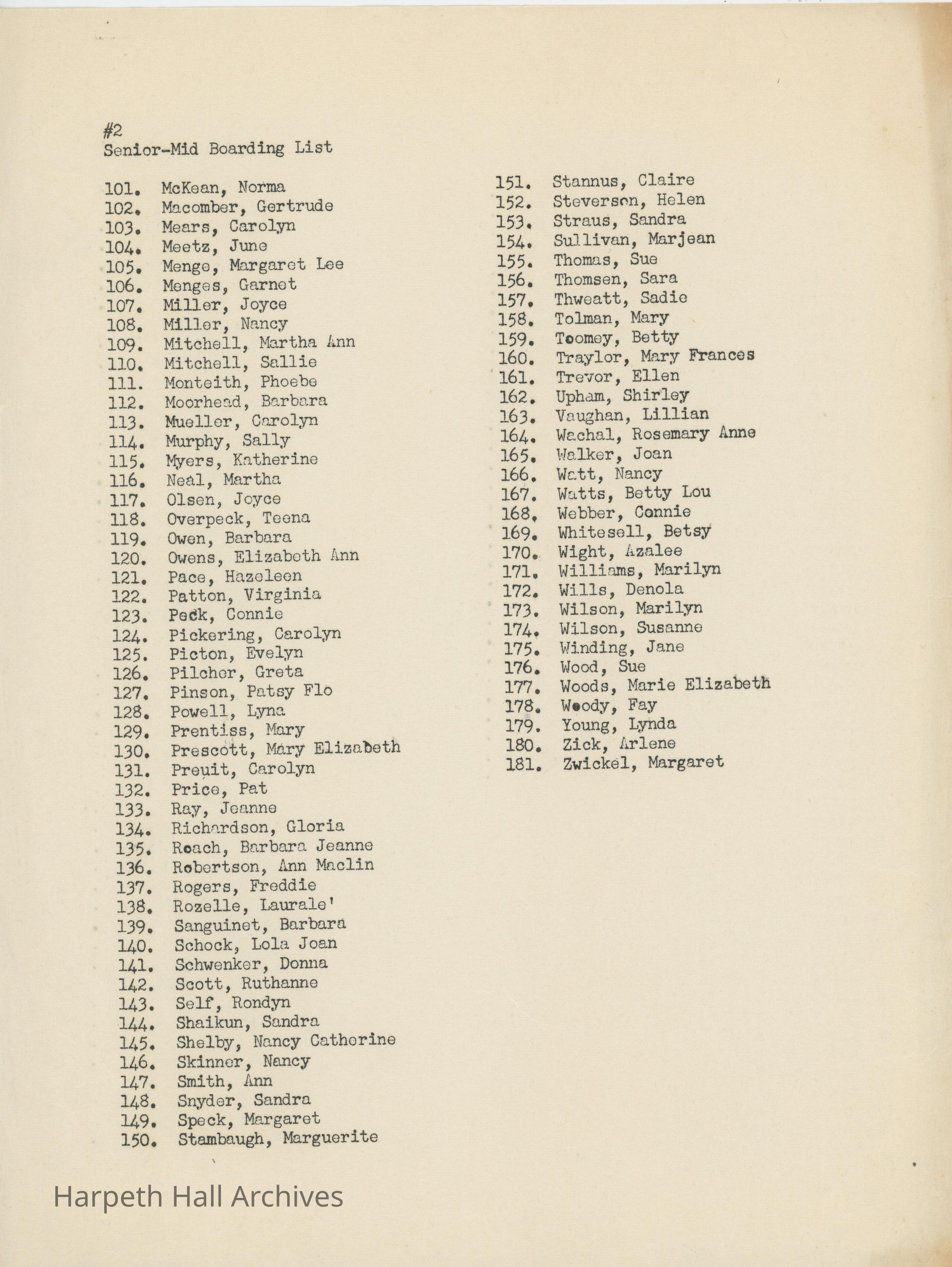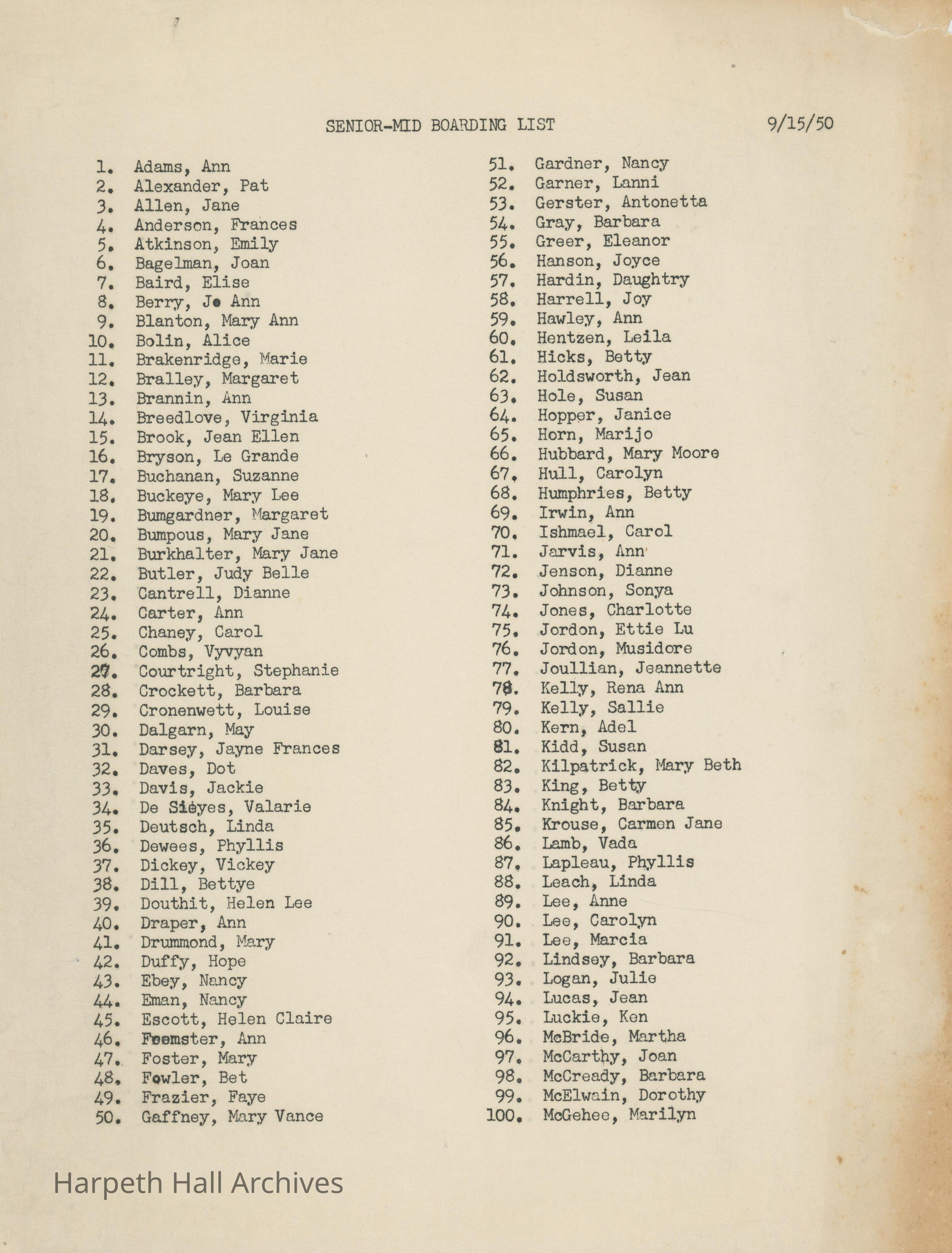 The Ward-Belmont senior-mid boarding list dated September 15th, 1950. It is two pages long consisting of 181 students.