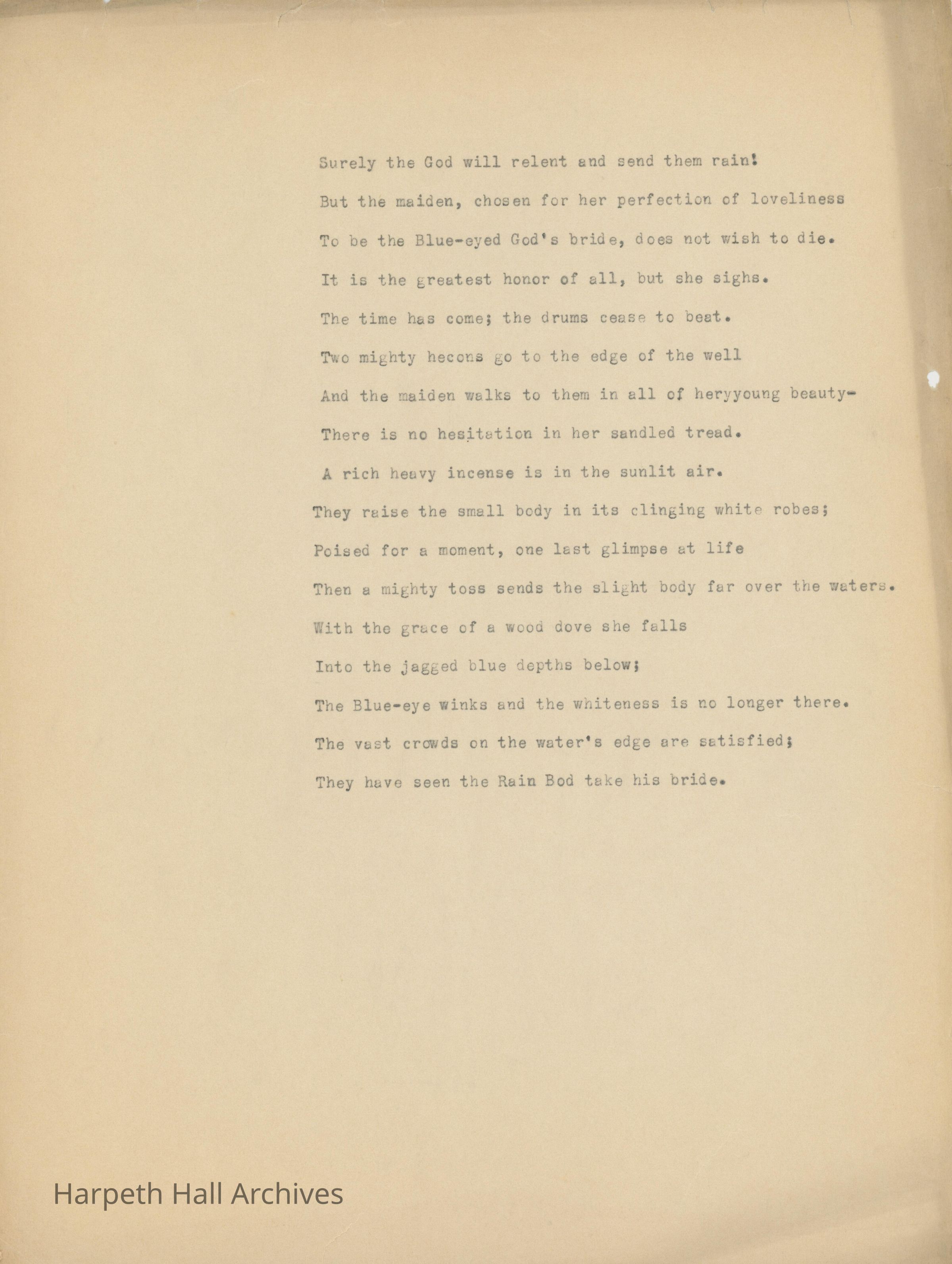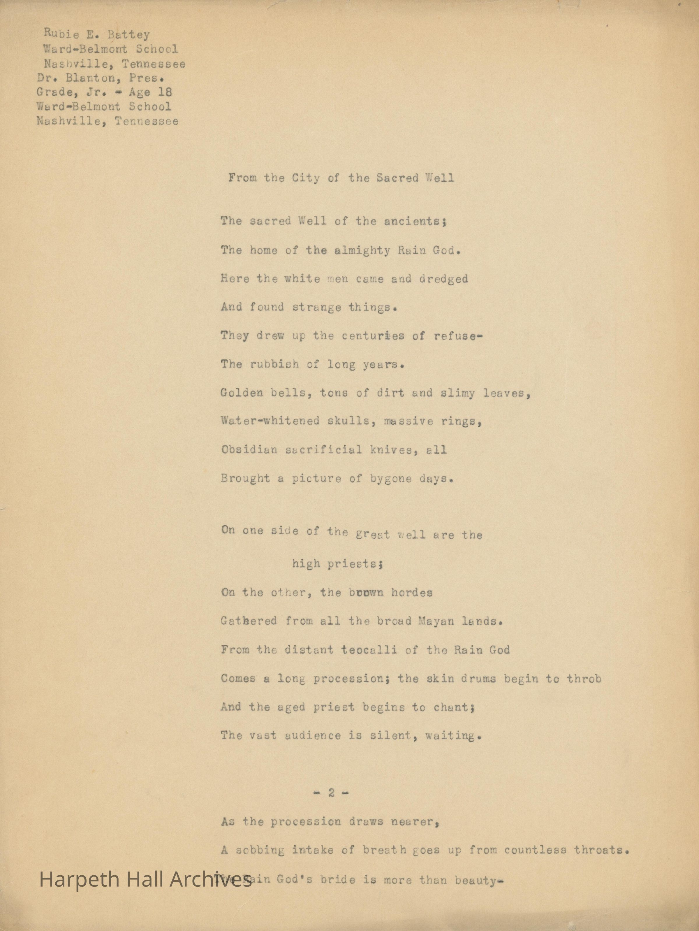 A poem entitled, "From the City of the Sacred Well" written by Ward-Belmont junior Rubie Battey (1933).Collection