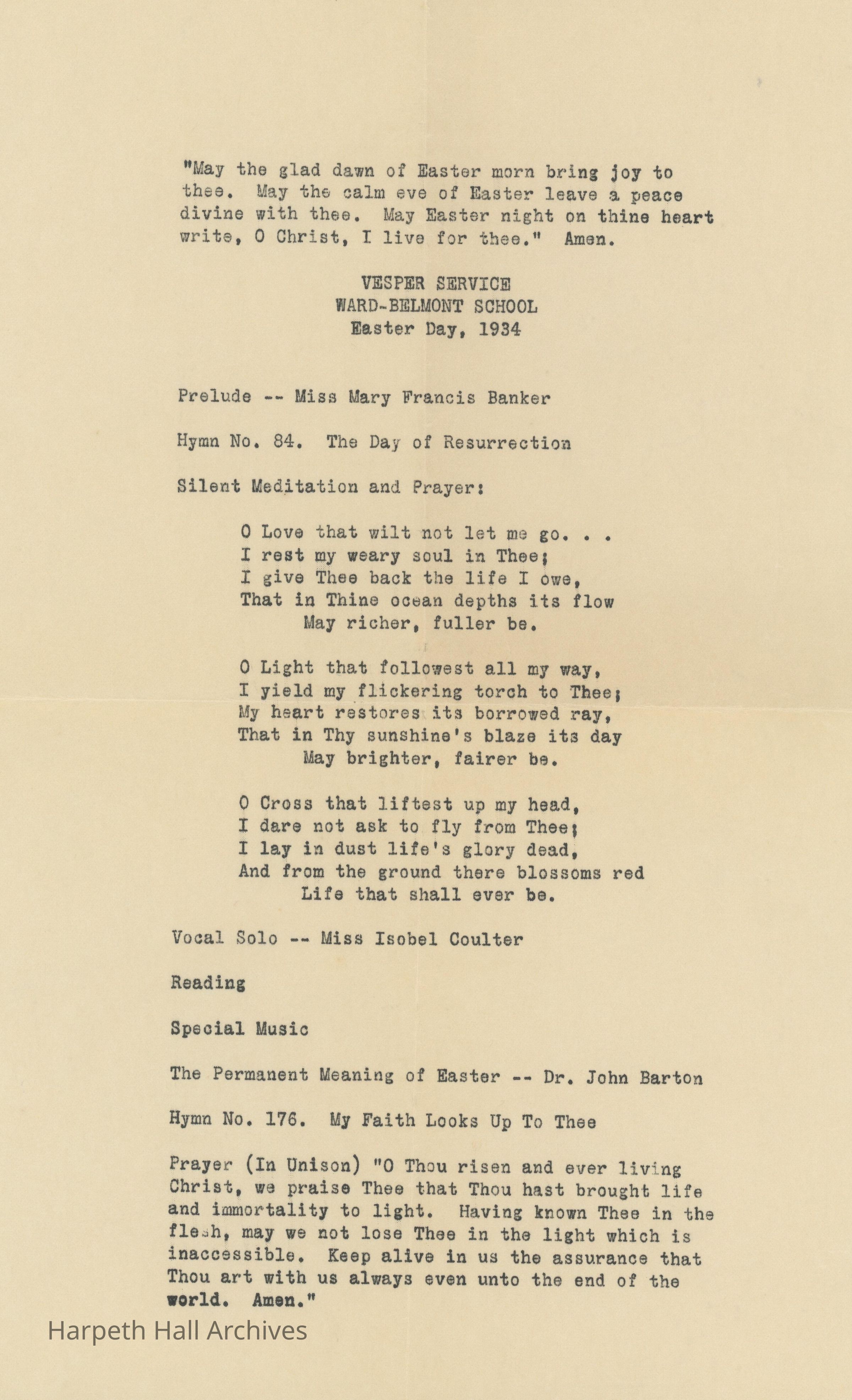 The program for the Ward-Belmont Vesper Service on Easter Sunday (April 1st) in 1934.Collection