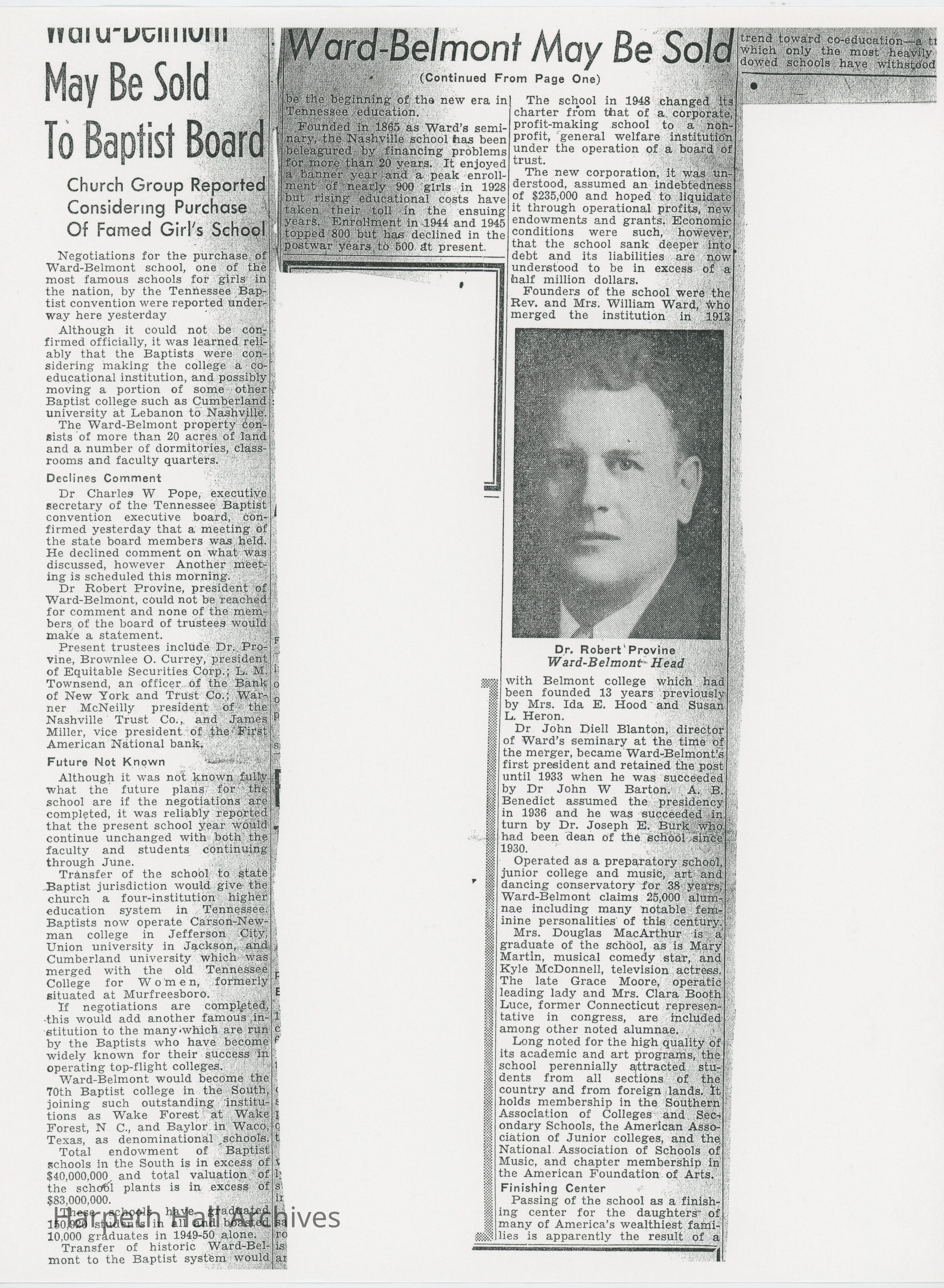 Article reporting early speculation about Tennessee Baptist Convention rumored to be purchasing Ward-Belmont.