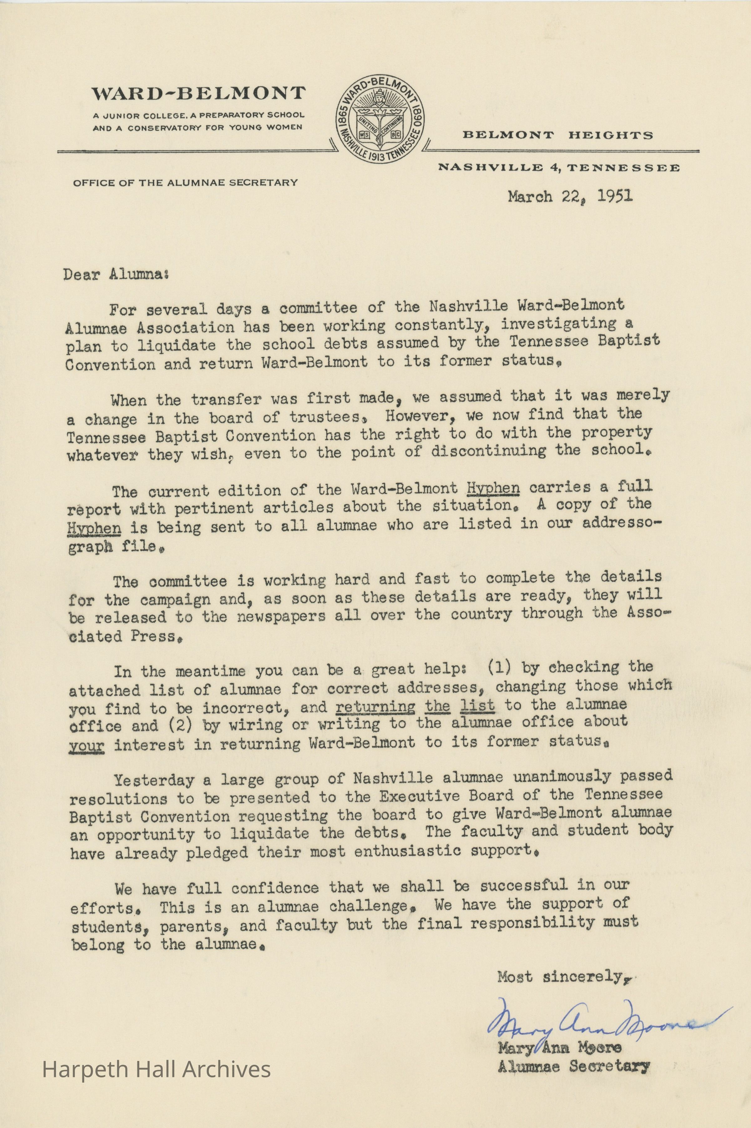 Letter to Ward-Belmont alumni updating them on news of the school's sale.
