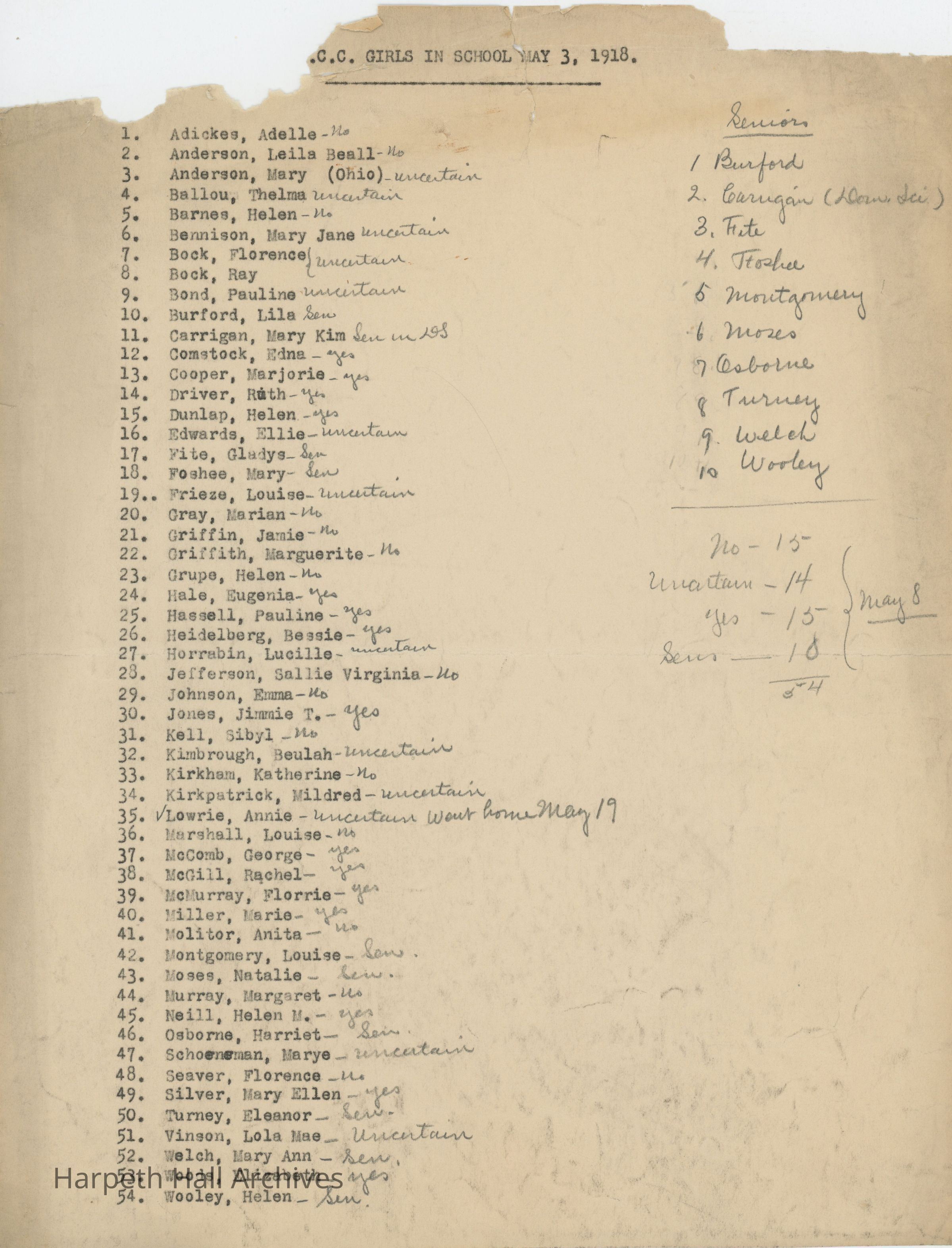 A list of fifty-four members of the Ward-Belmont Twentieth Century Club, marked by whether or not they were in school on May 3, 1918. Fifteen members were marked as "no," fourteen as "uncertain," fifteen as "yes," and ten as being seniors (as of May 8, 1918 per handwritten note). One member, Annie Lowrie, is checked off of the list and noted to have returned home from Ward-Belmont on May 19, 1918.Context
