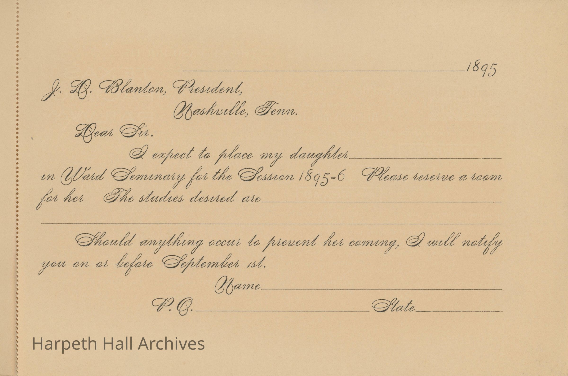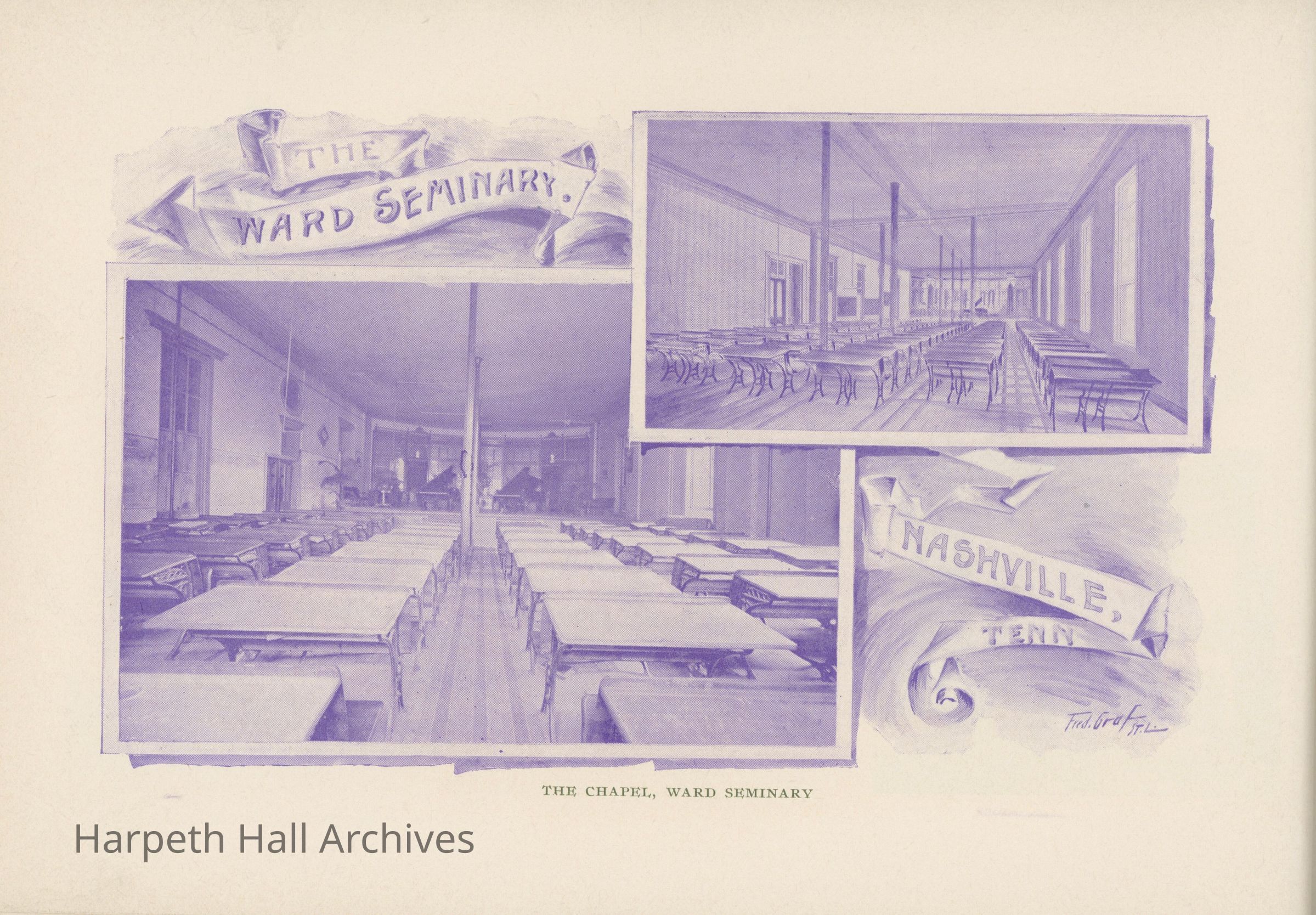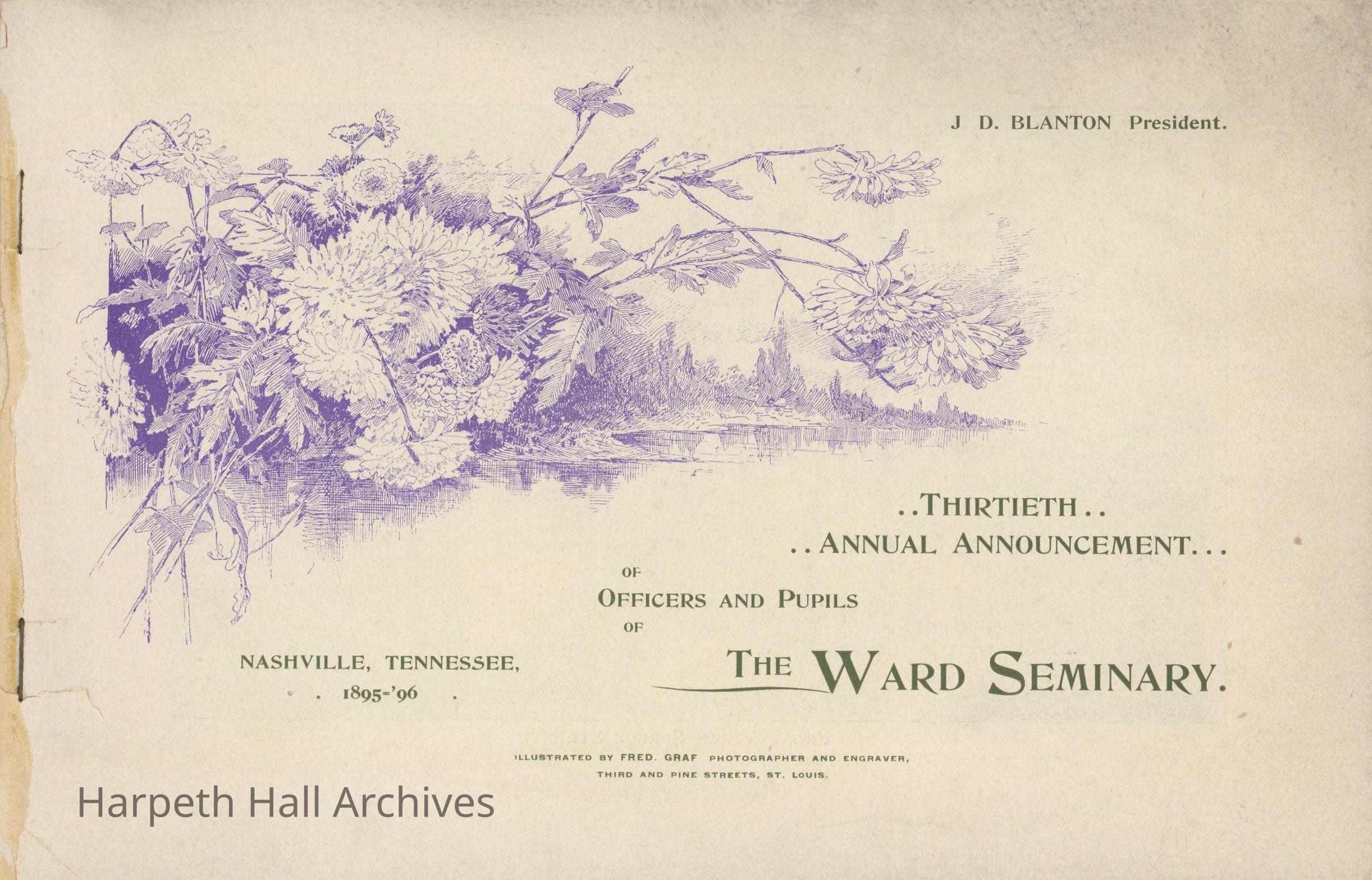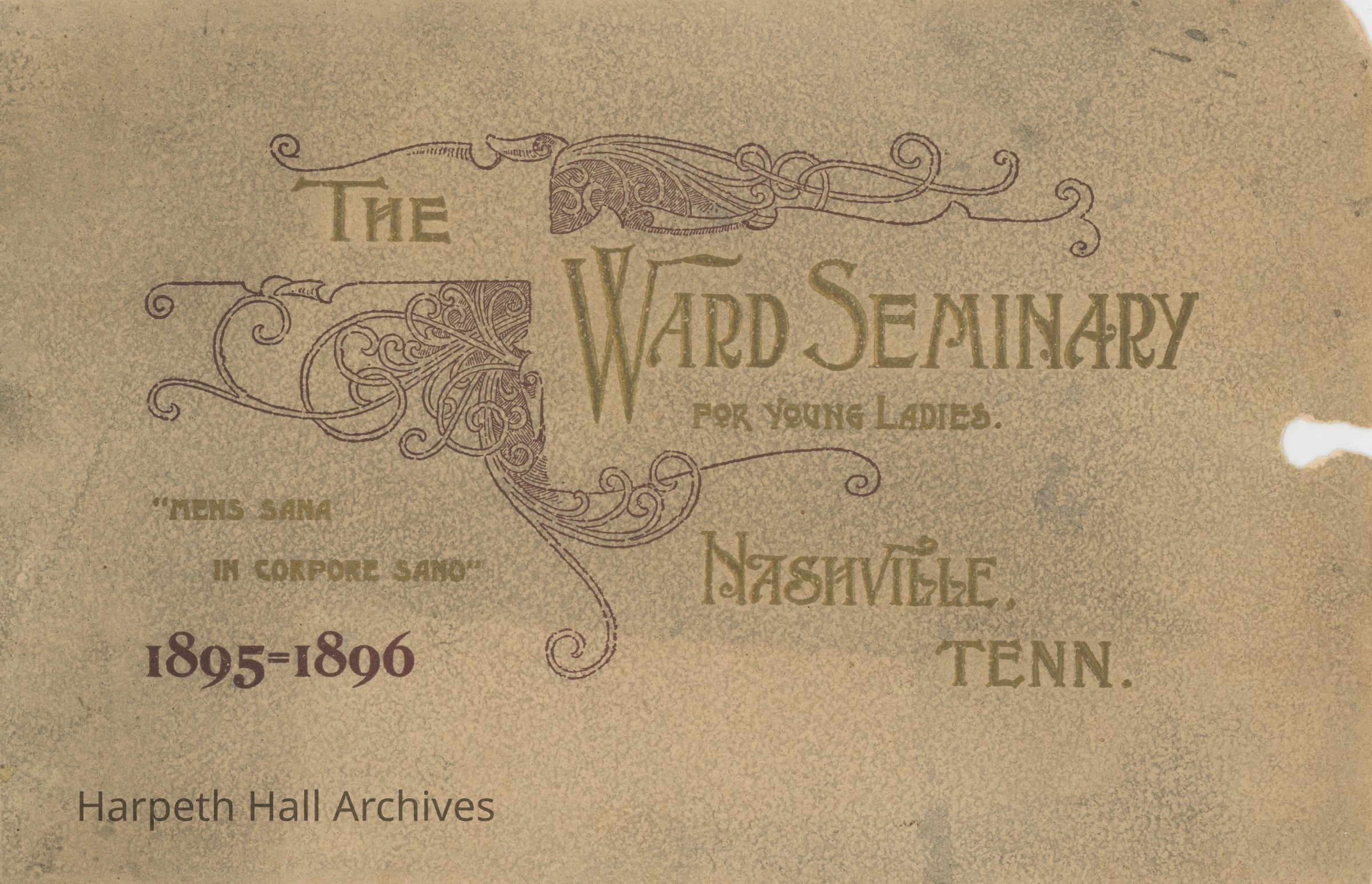 Booklet published in 1895-1896 by Ward Seminary with information about the school for prospective students and families. The sixty page publication provides details about the school history, students, including uniforms, curriculum, entertainment, and room and board at the school along with images of the main building, Ward Place (a residence with eleven acres for room and board), and Nashville attractions.Collection
