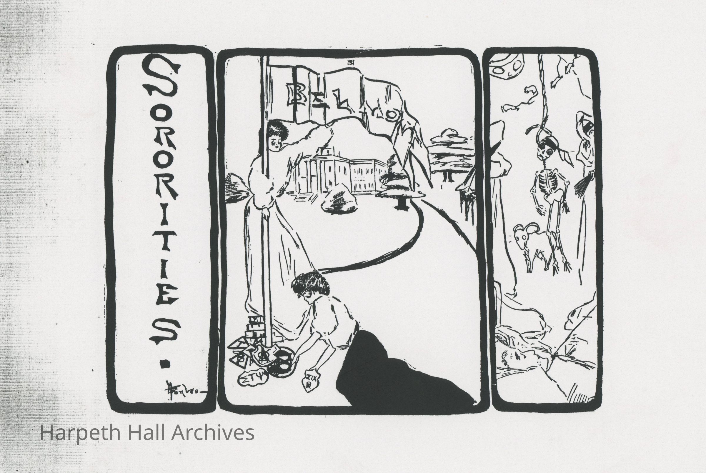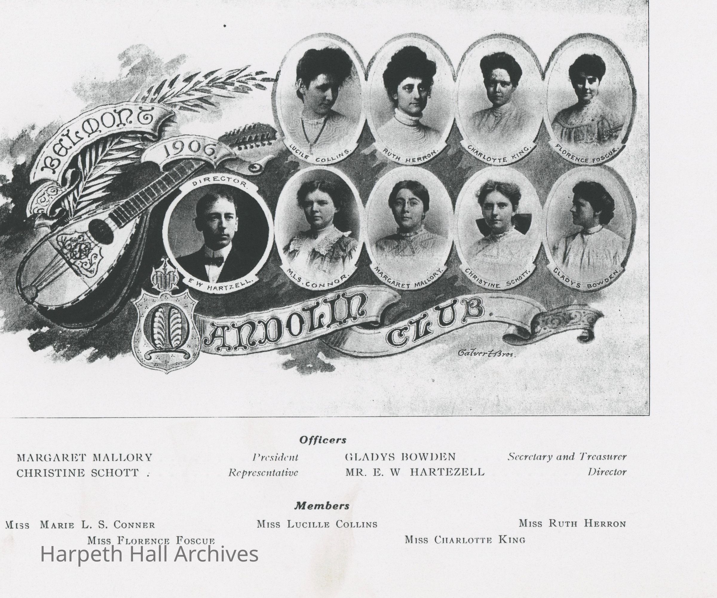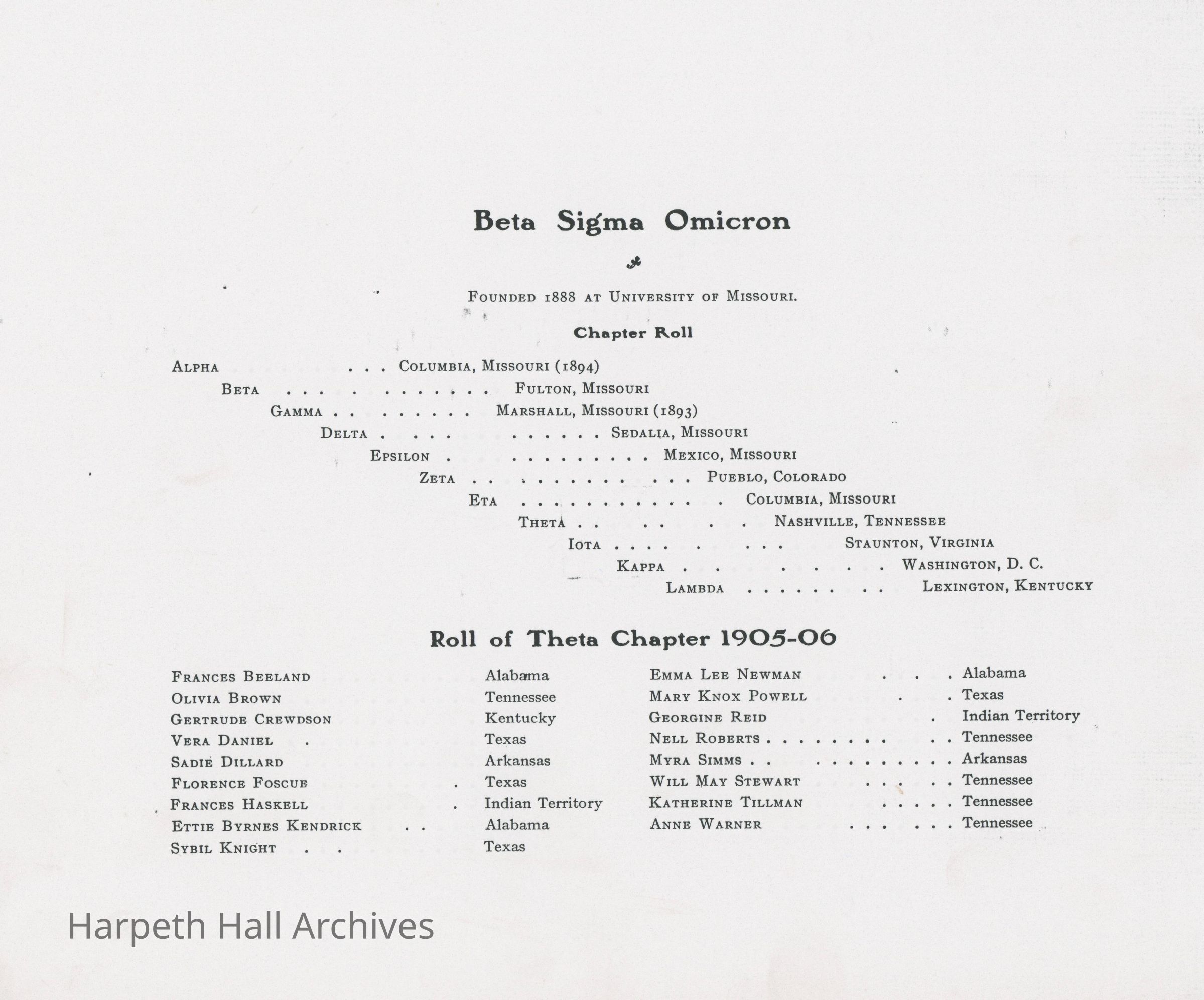 An excerpt of the 1906 Milady Yearbook. The excerpt includes clubs such as Andolin Club, Glee Club, Tennis Club, Basketball Team, Ensemble Club, and Hesselberg Class. It also includes sororities such as Beta Sigma Omicron and Roll of Theta Chapter.Collection