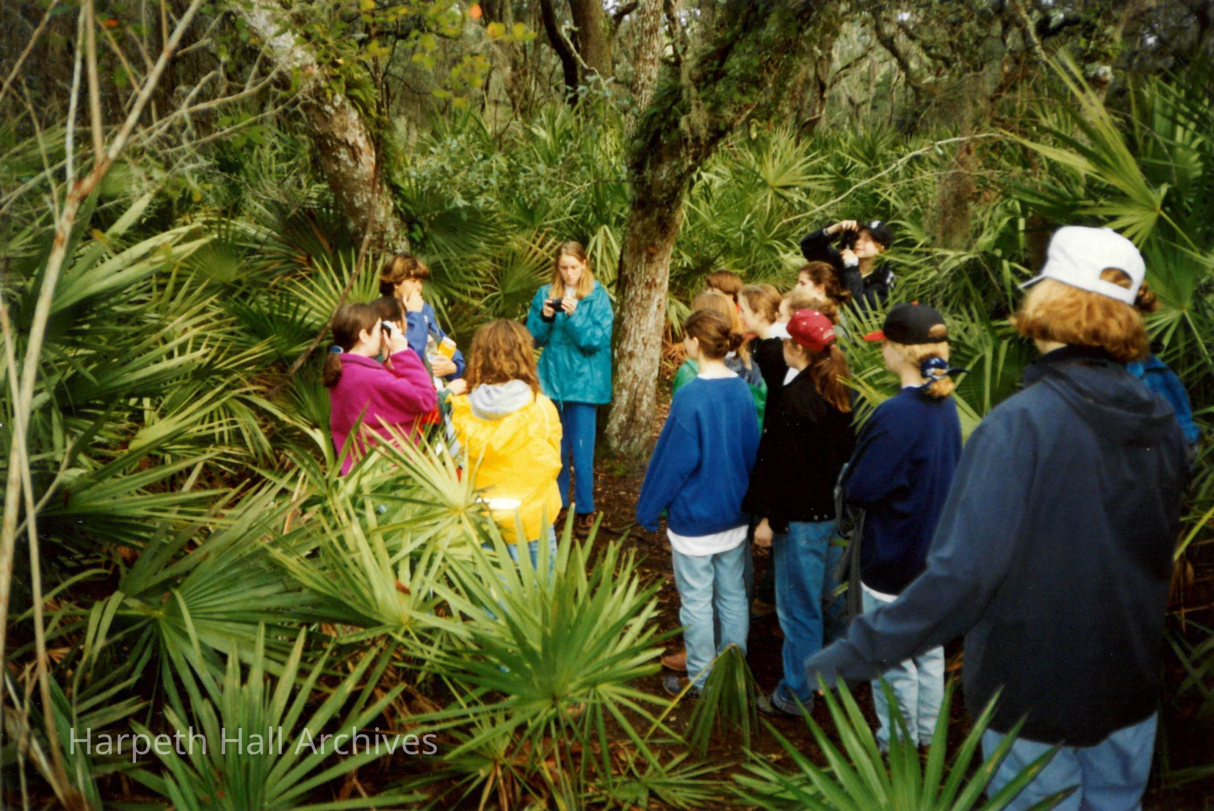 A group of students huddled around looking at plants on a field trip.