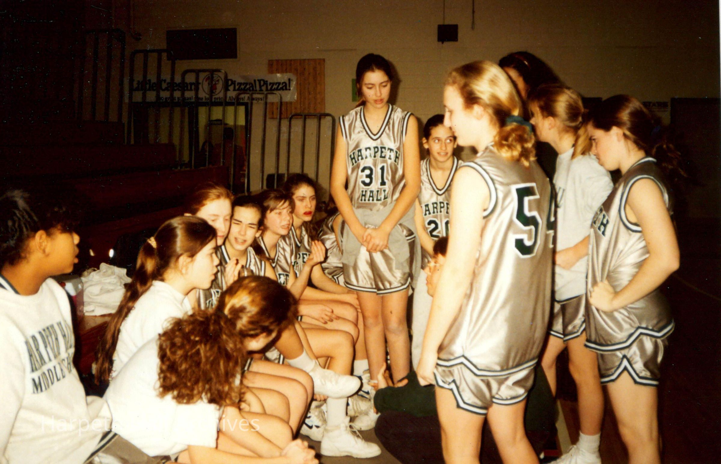 The middle school basketball team in a huddle during a game.