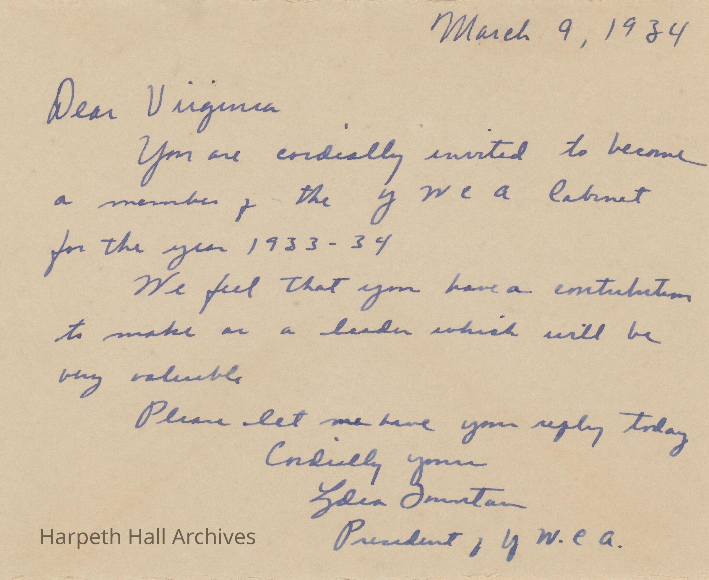 A letter to Virginia Richey (1935) inviting her to be a member of the 1933-34 YWCA Cabinet from the YWCA President. The letter is dated March 9th, 1934. YWCA was a club at Ward-Belmont.Collection