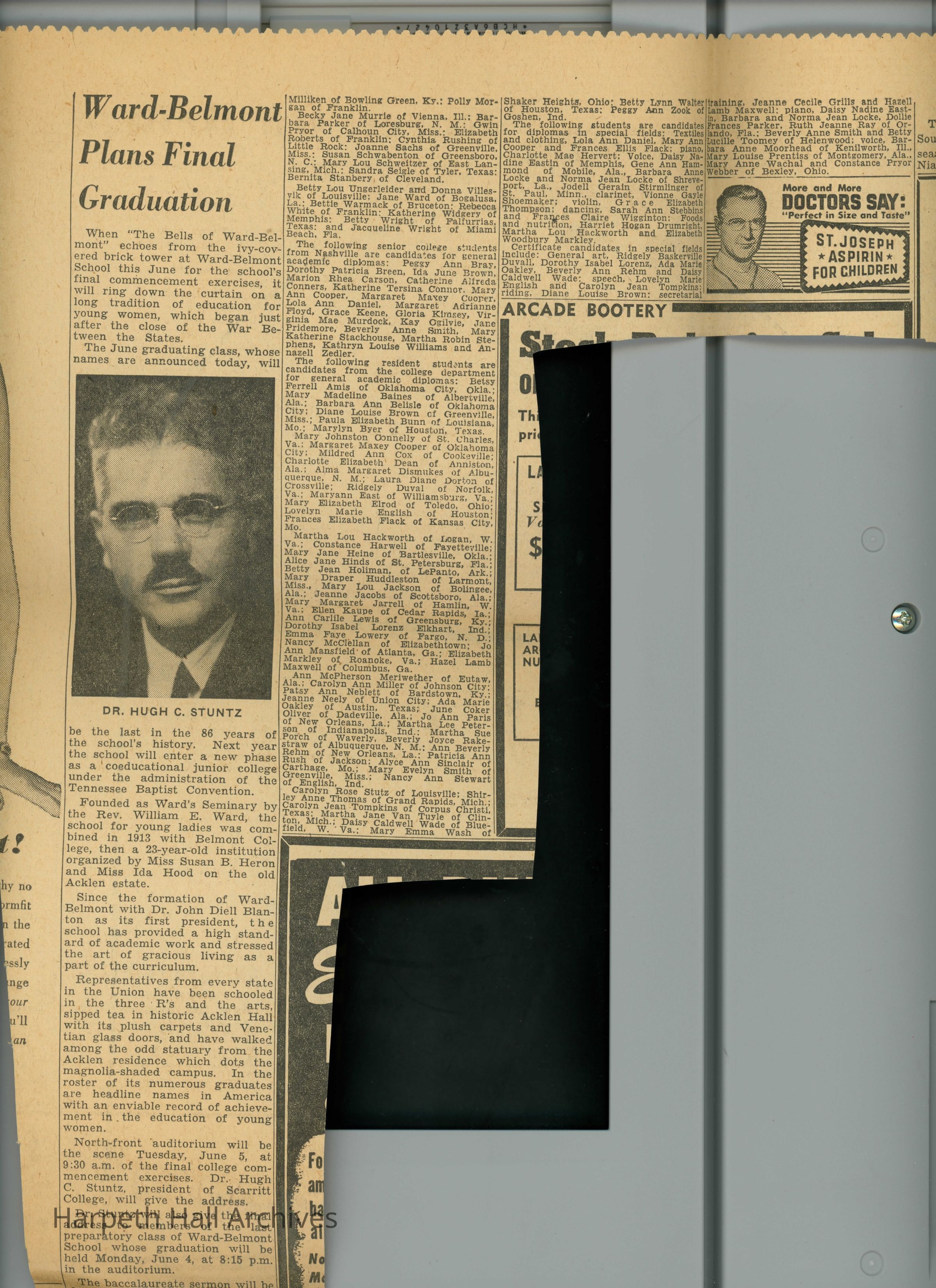 Newspaper clipping that details the final graduation of Ward-Belmont and names the graduates.Collection