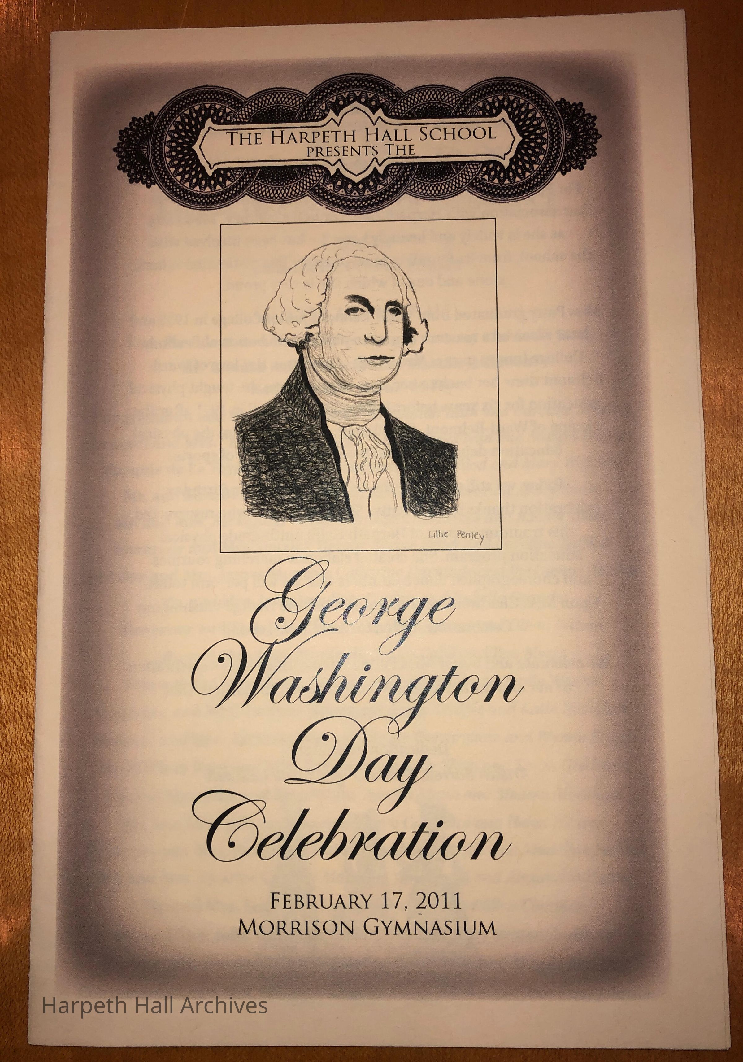 The 2011 program for the George Washington Day Celebration put on by the class of 2016 when they were in the seventh grade. The celebration was dedicated to Miss Patty Litton Chadwell (1935). George Washington was played by eighth grader Anna Kate Rader Lowry (2015) and Martha Washington was played by eighth grader Lark Morrison (2015). Front cover design by Lillie Penley (2016).Context