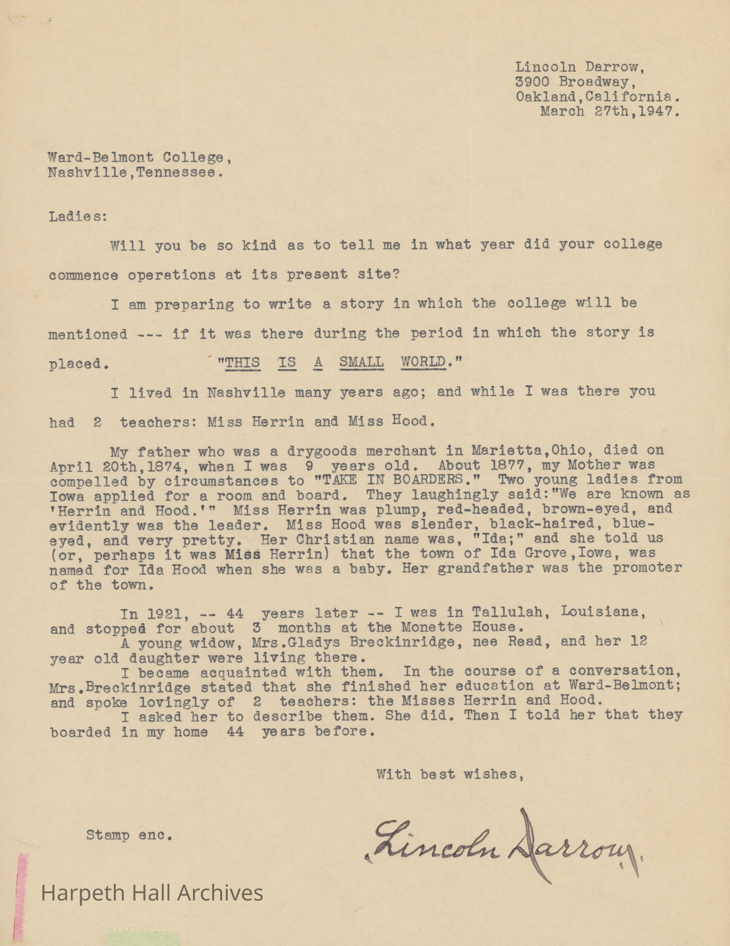 Letter, 1947, Ward-Belmont, Belmont College, Susan Heron, Ida Hood