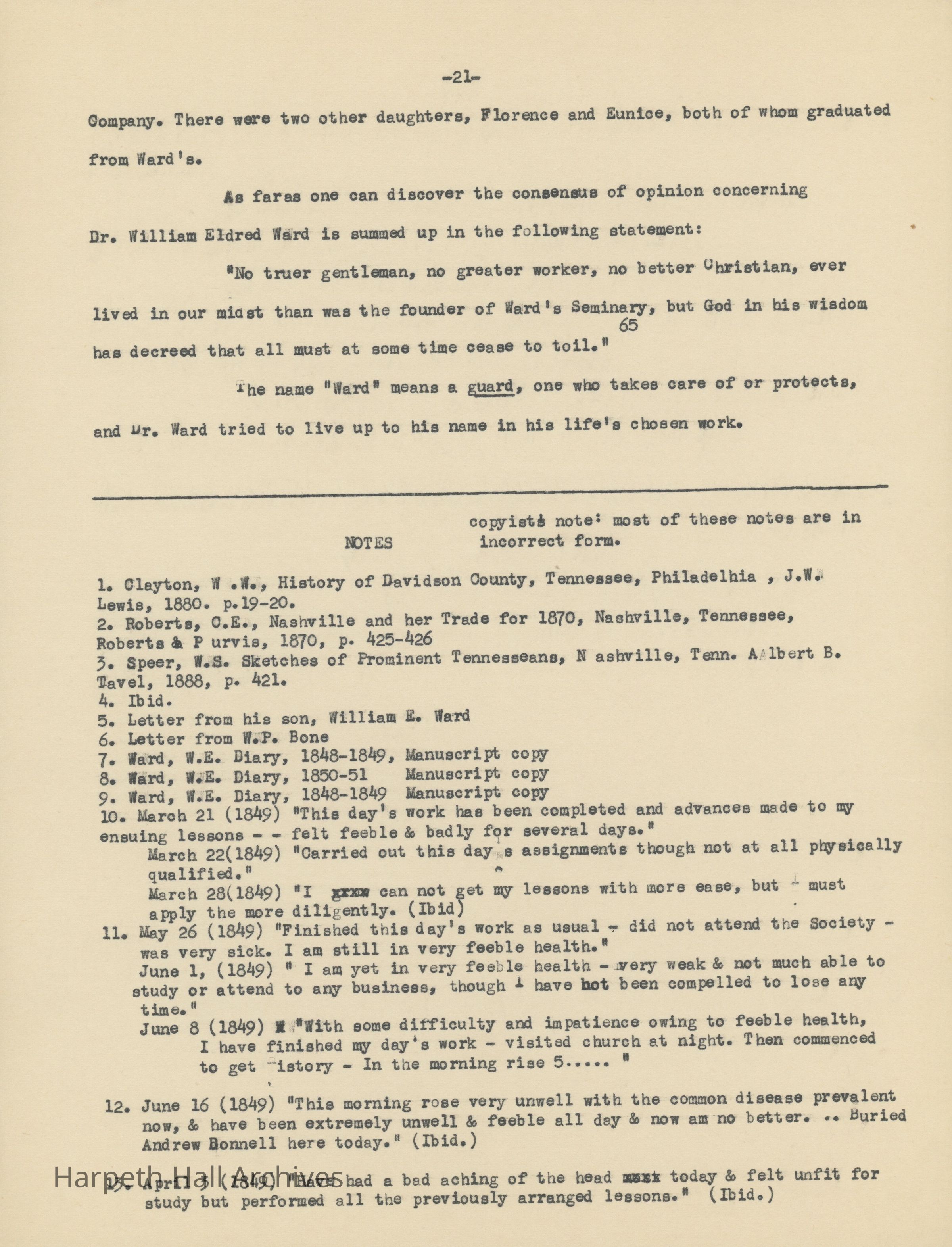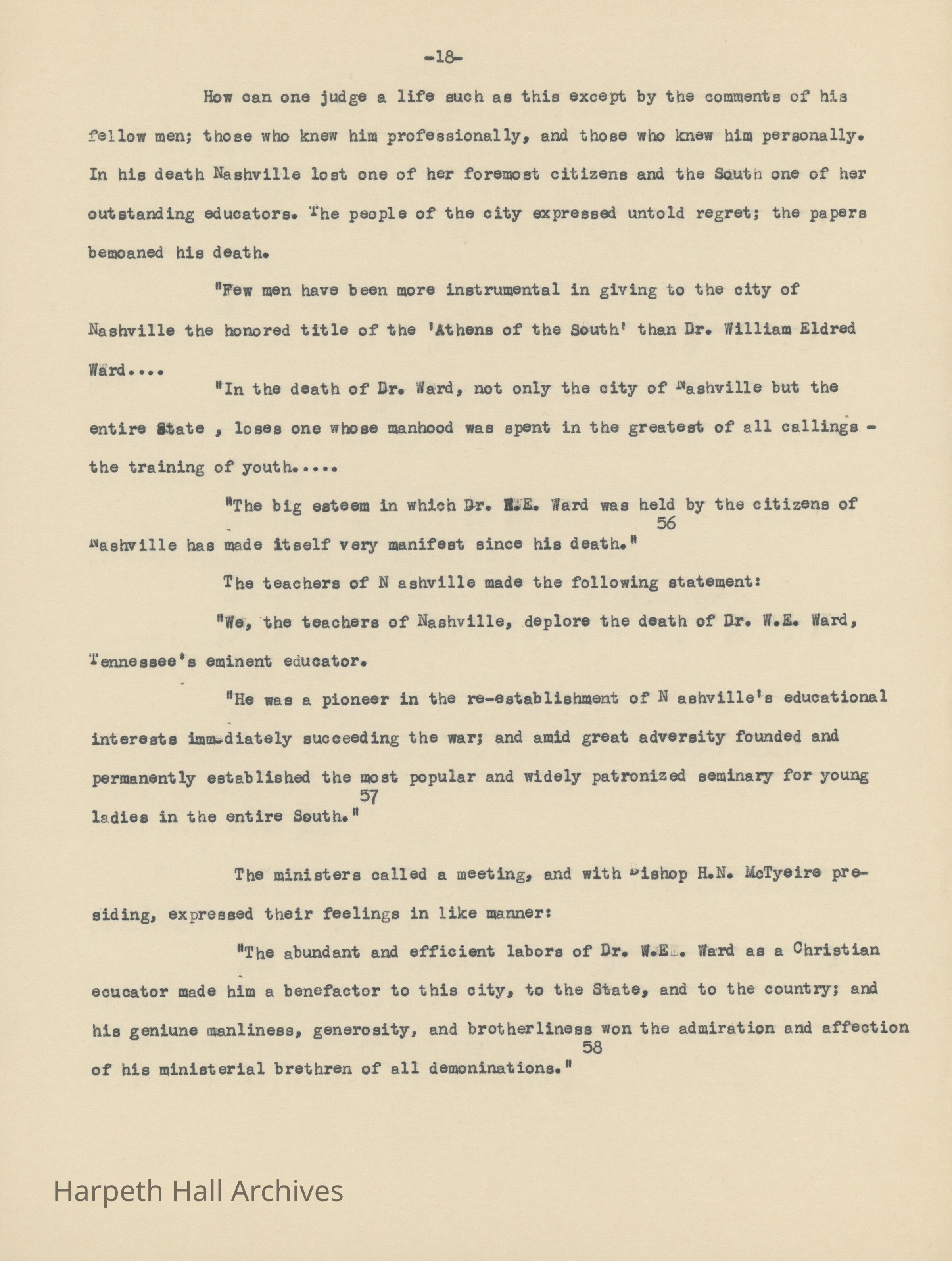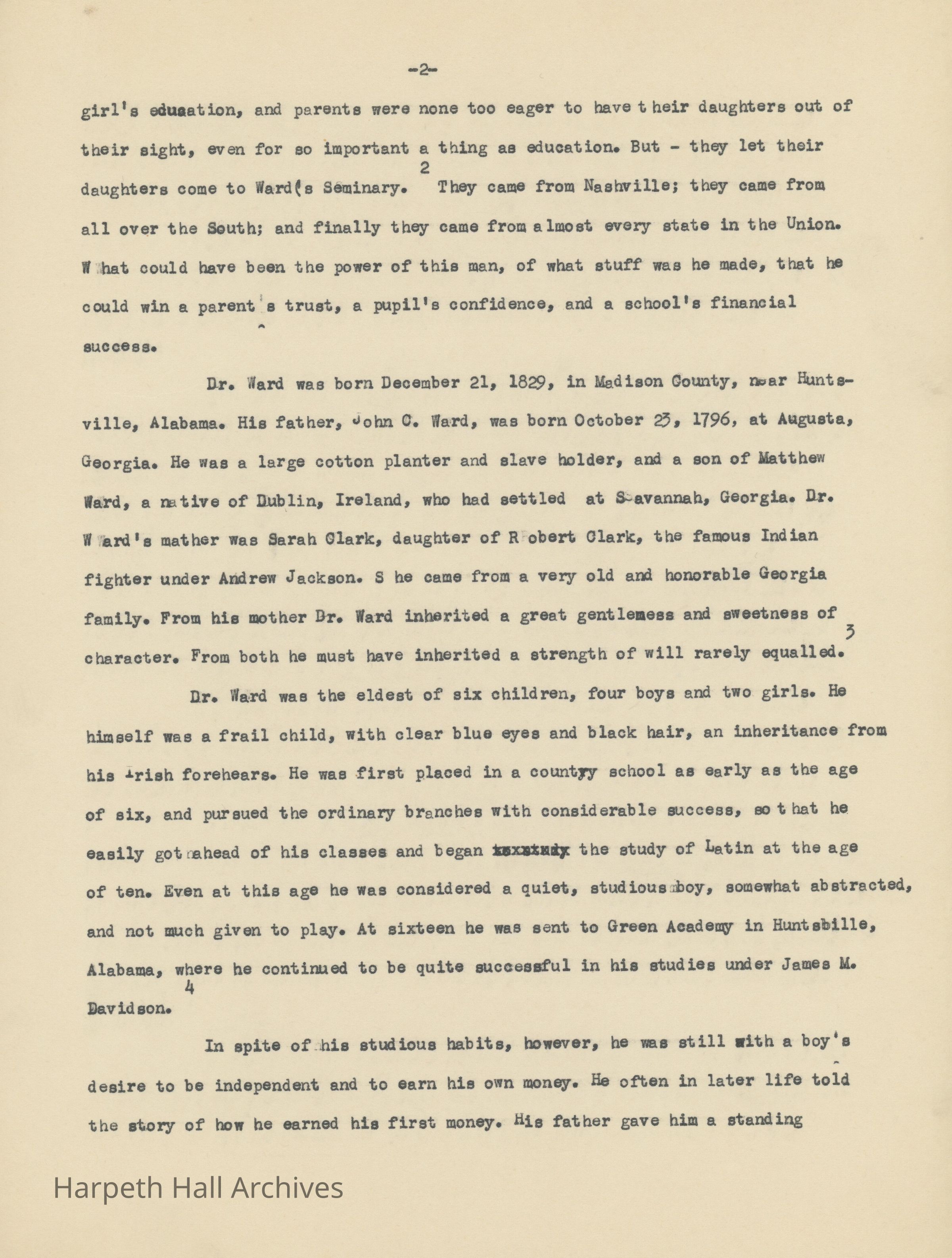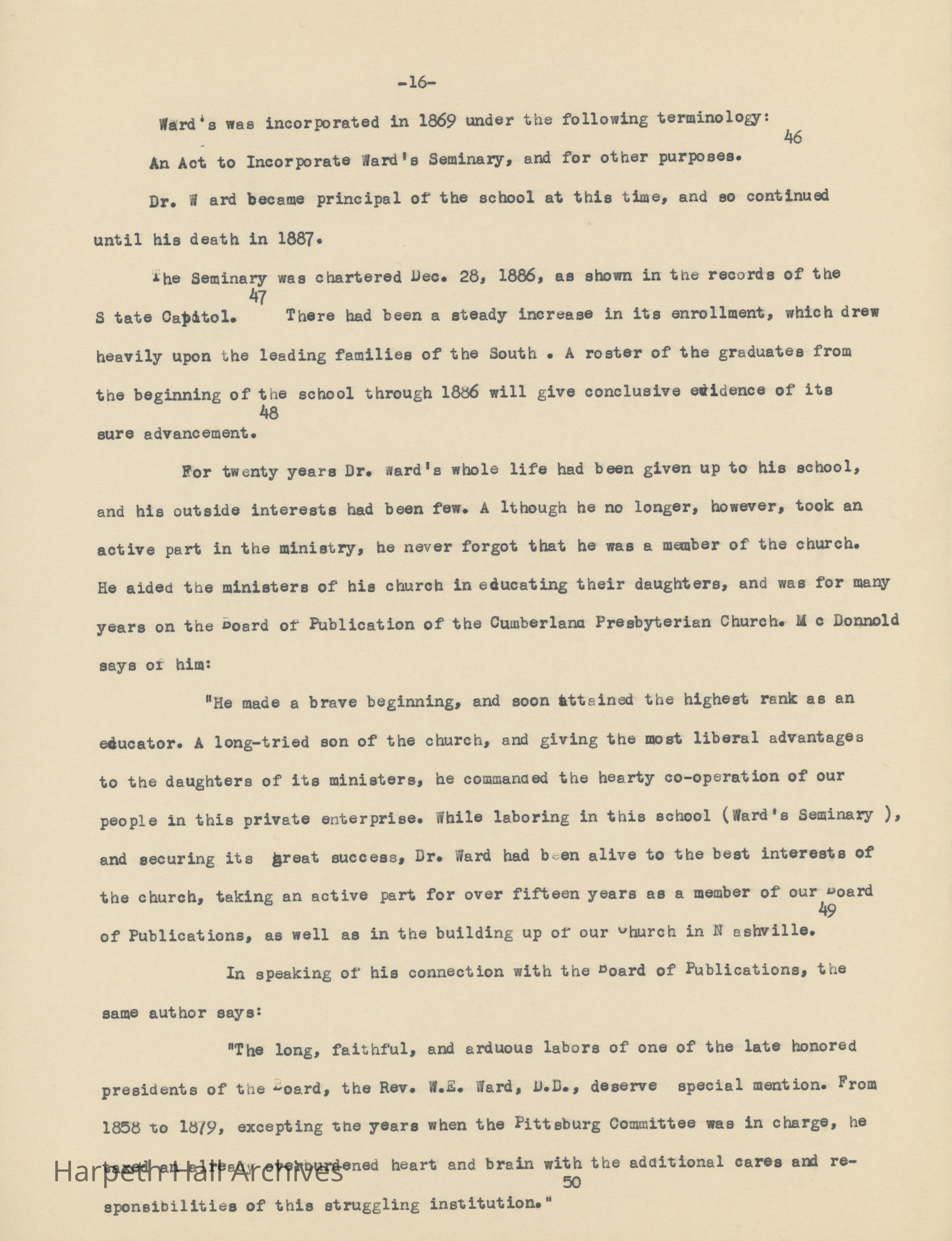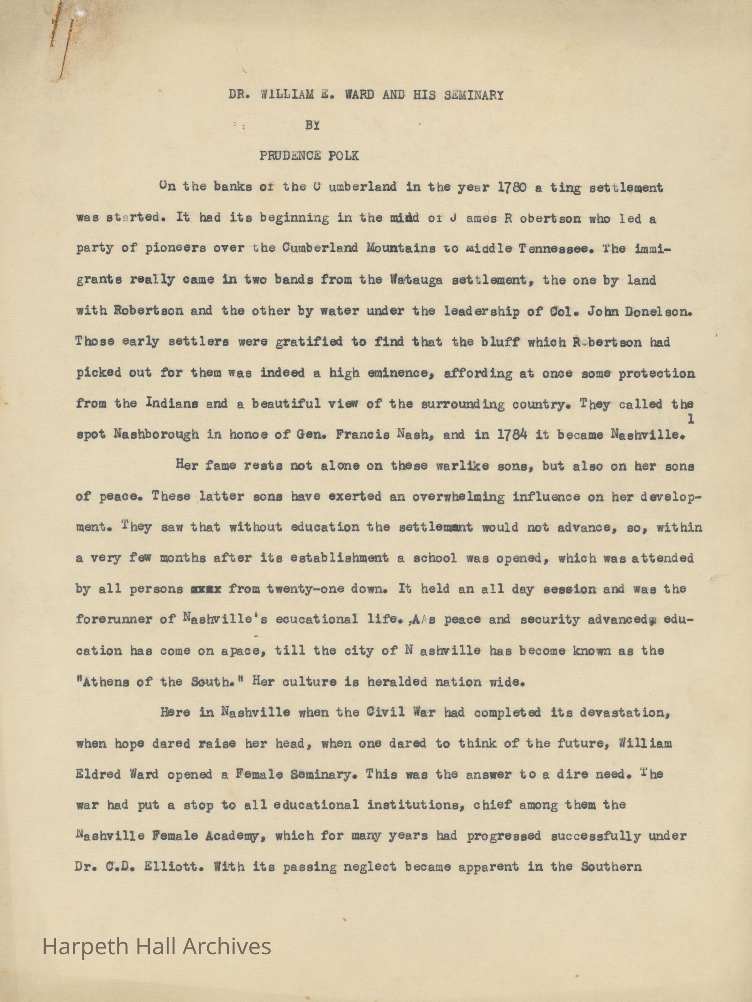 An essay about Dr. William E. Ward the creation of Wards Seminary written by Ward-Belmont Prudence Polk.Collection