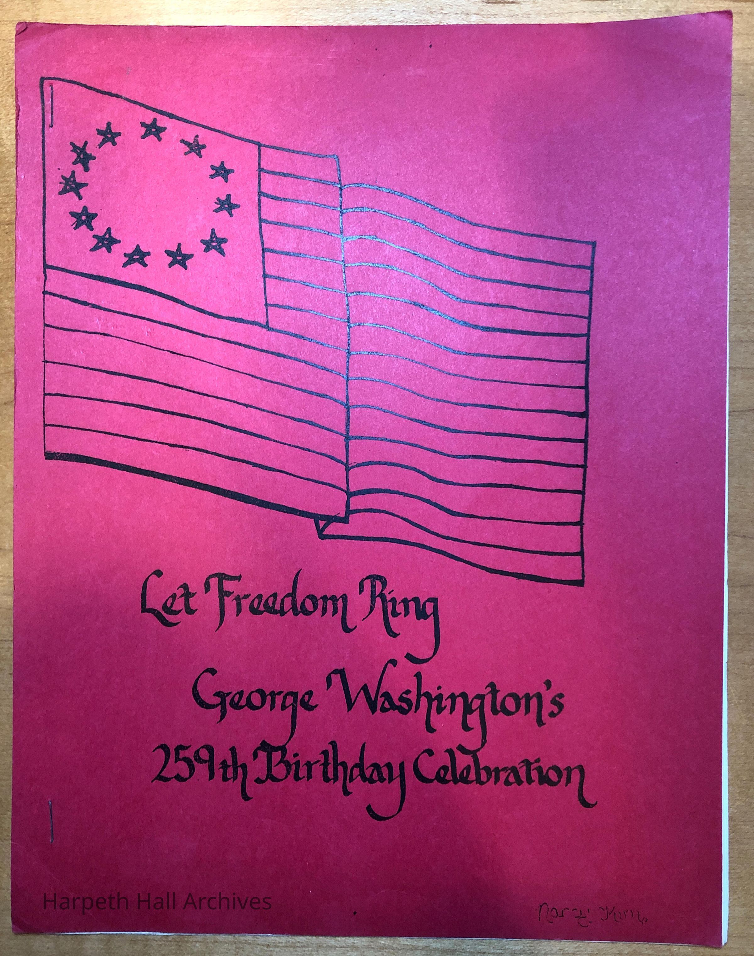 The 1991 program for the George Washington Day Celebration put on by the class of 1996 when they were in the seventh grade. The celebration was dedicated to the men and women serving in the United States Armed Forces. George Washington was played by eighth grader Katherine Wray (1995) and Martha Washington was played by eighth grader Lacey Galbraith (1995). Front cover design by Nancy Kim (1996).Context