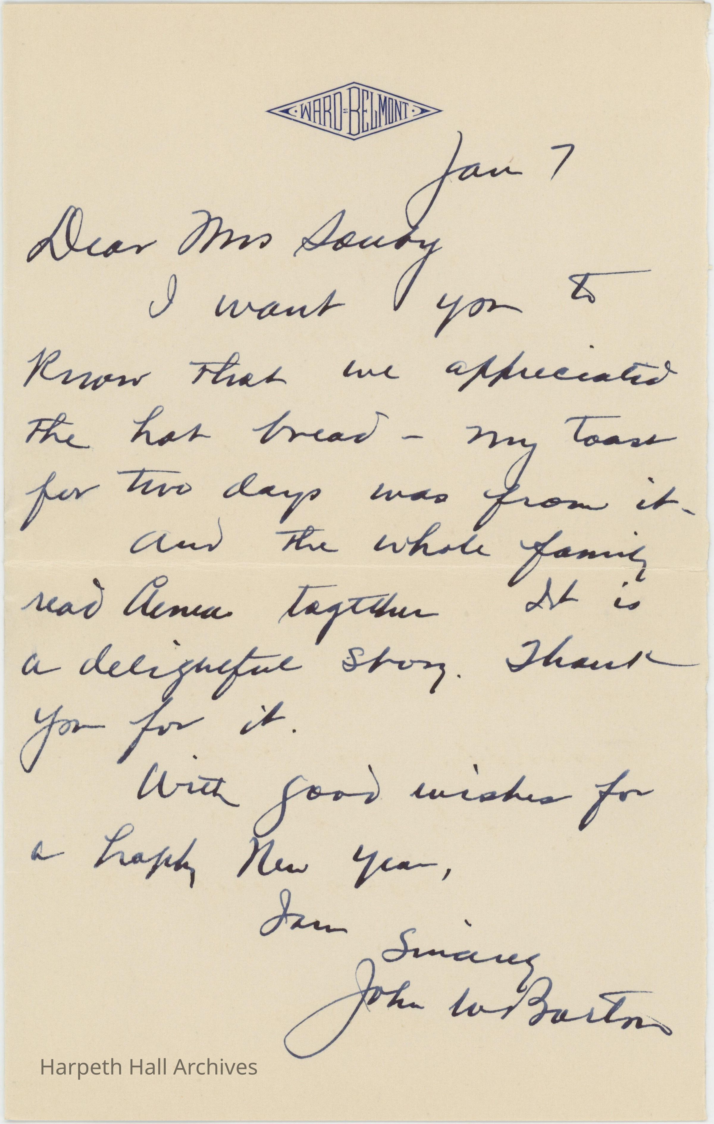 A thank-you letter to Mrs. Souby from Dr. John W. Barton on January 7th.Context