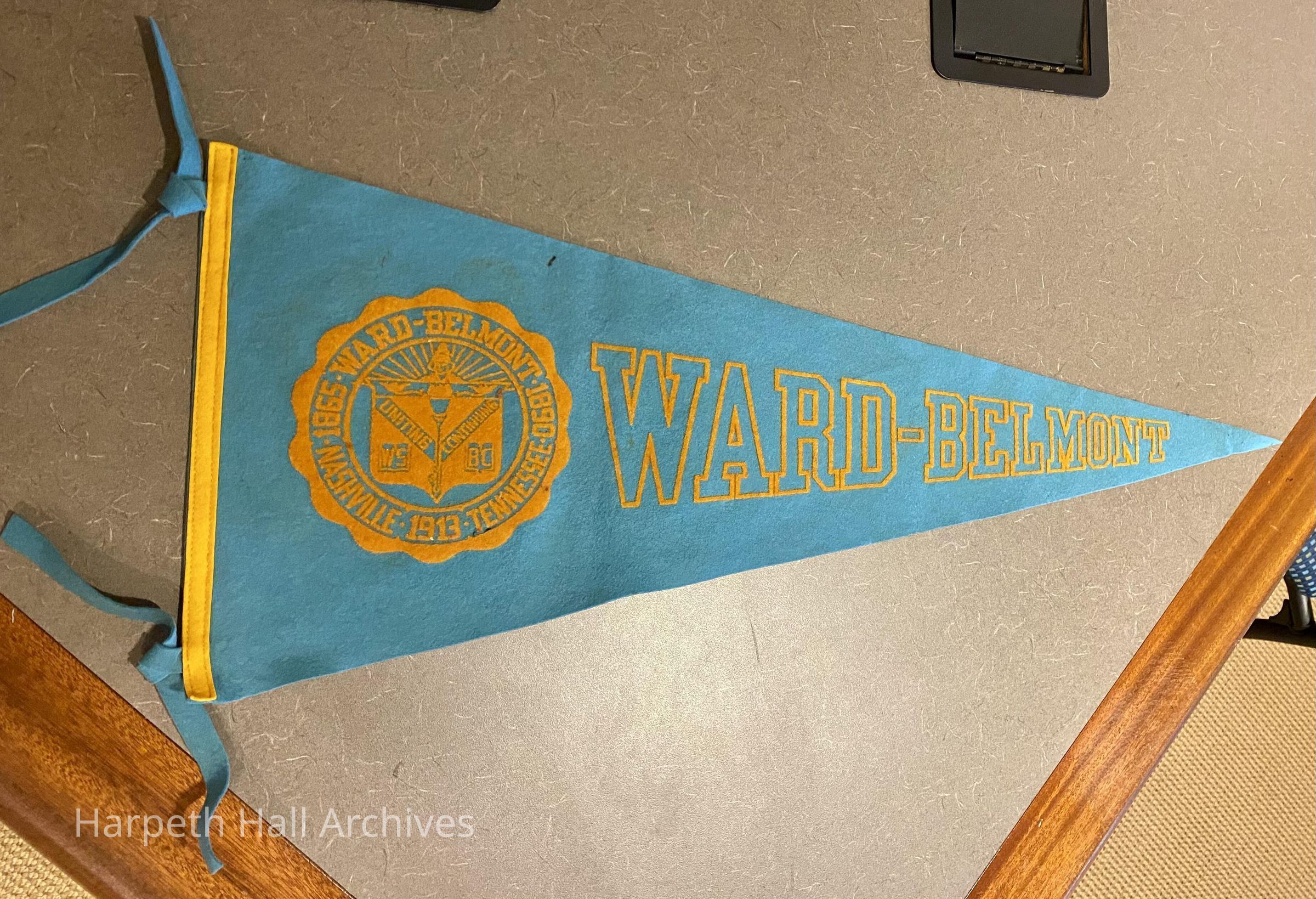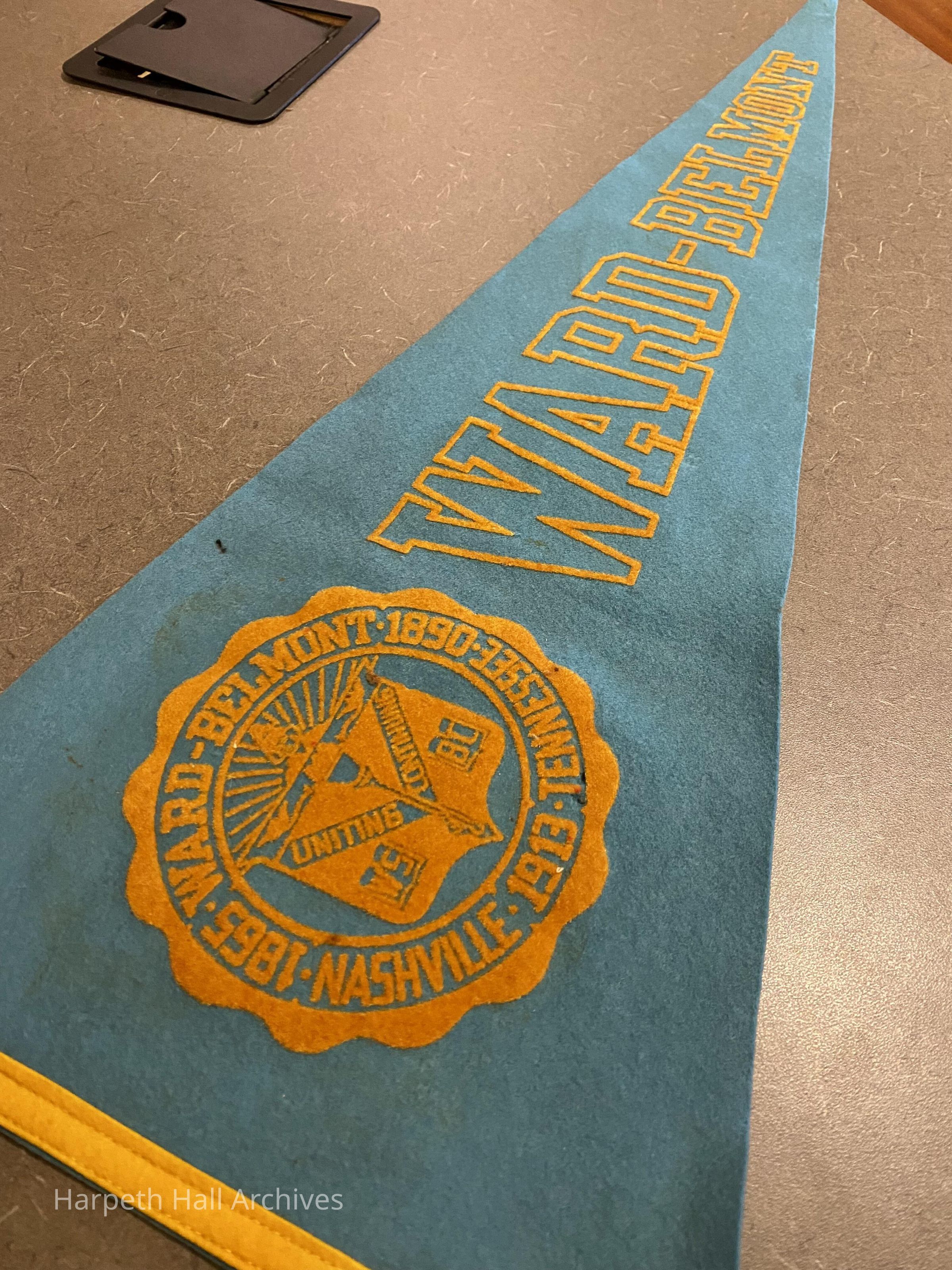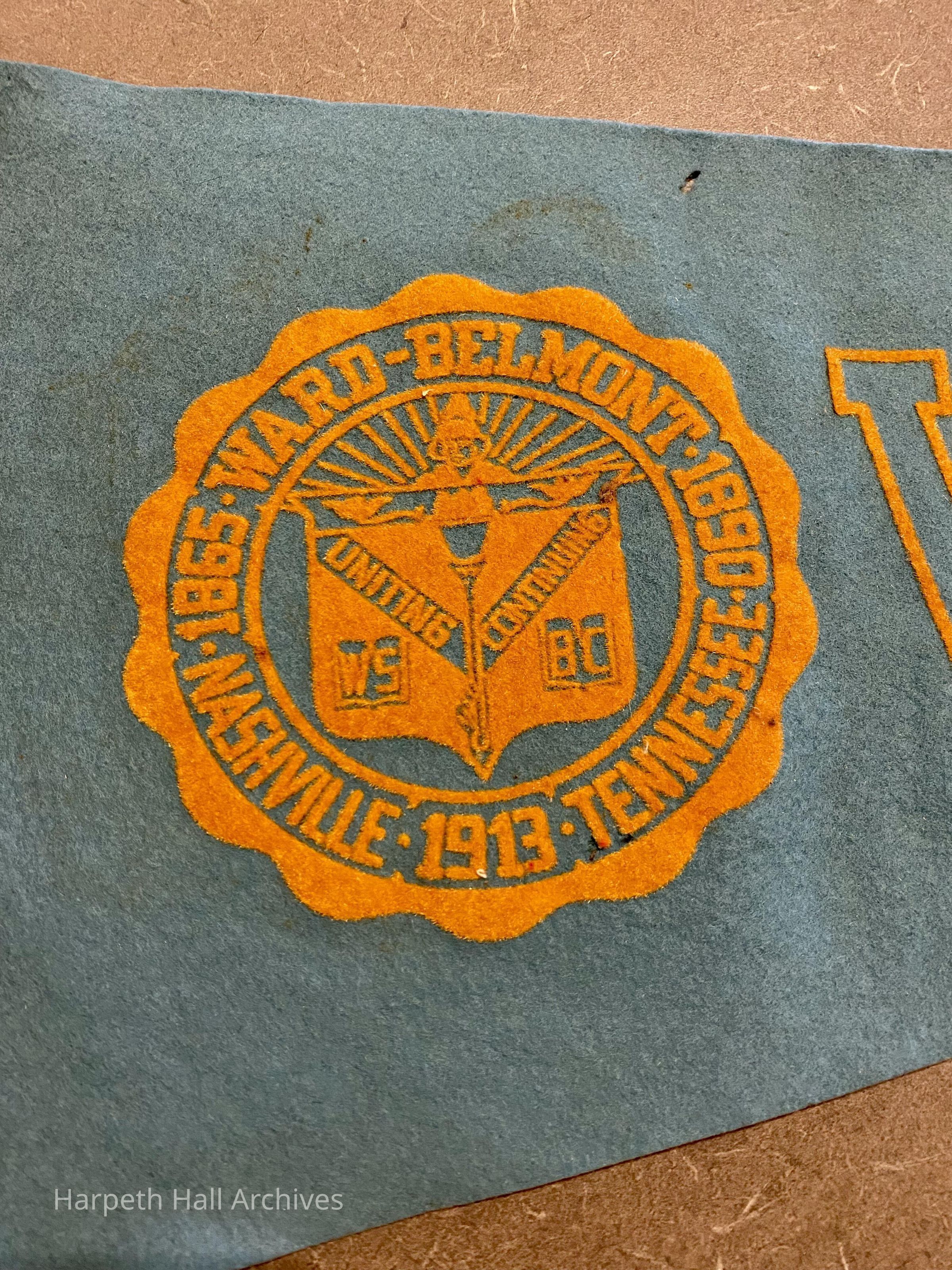 A blue and orange/yellow Ward-Belmont pennant. Inscribed on the school seal are "Ward-Belmont," "Nashville Tennessee," and the years 1865 (inaugural year of Ward Seminary for Young Ladies), 1890 (inaugural year of Belmont College for Young Women), and 1913 (inaugural year of Ward-Belmont College). The inner seal is inscribed with WS (Ward Seminary) and BC (Belmont College), with the words "uniting" and "continuing" indicating the merging of these two institutions to form Ward-Belmont College.Context