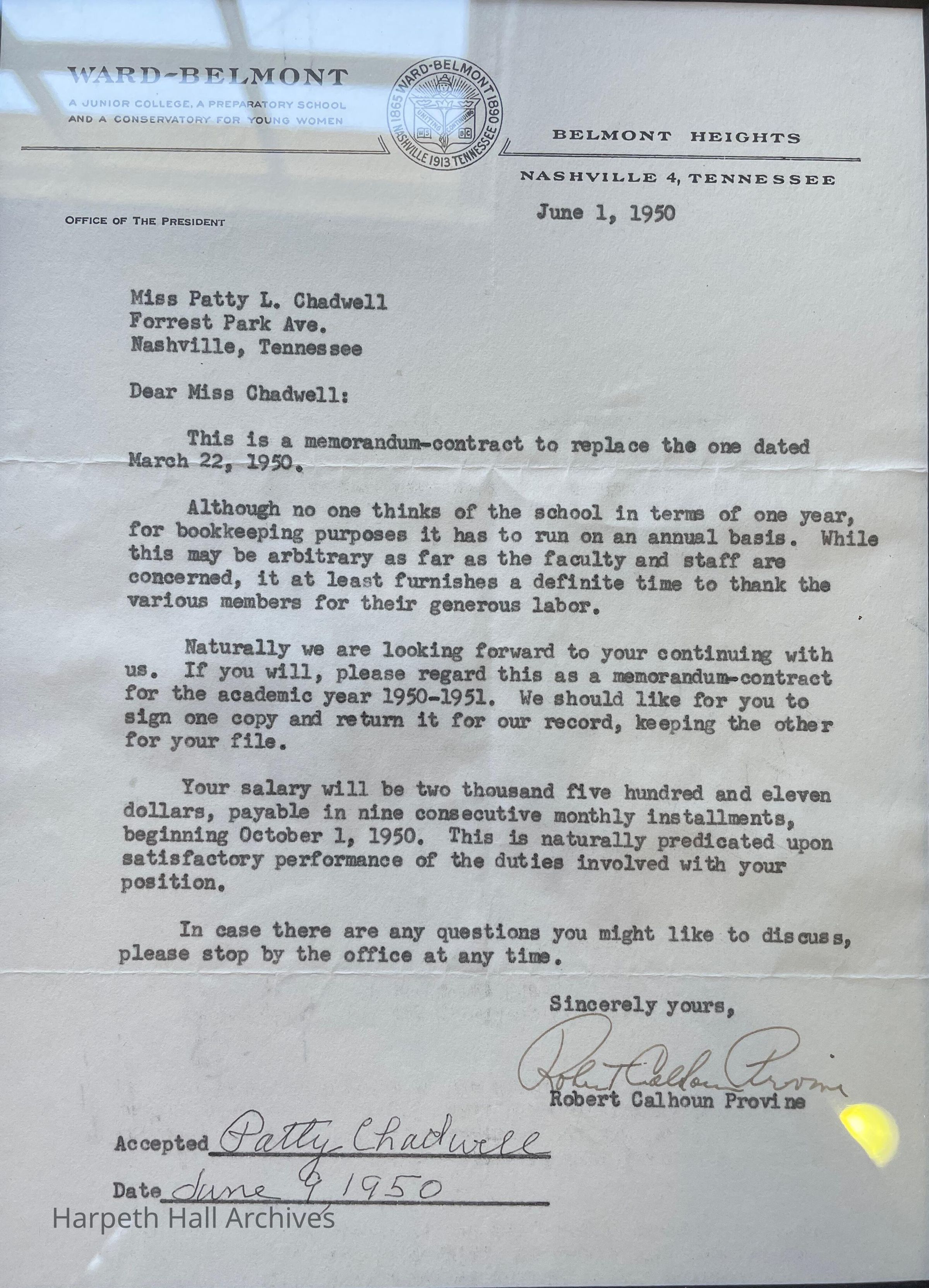 A letter written to Ms. Patty Chadwell on June 1,1950 from Robert Calhoun Province reinstating her salary for the following yearCollection