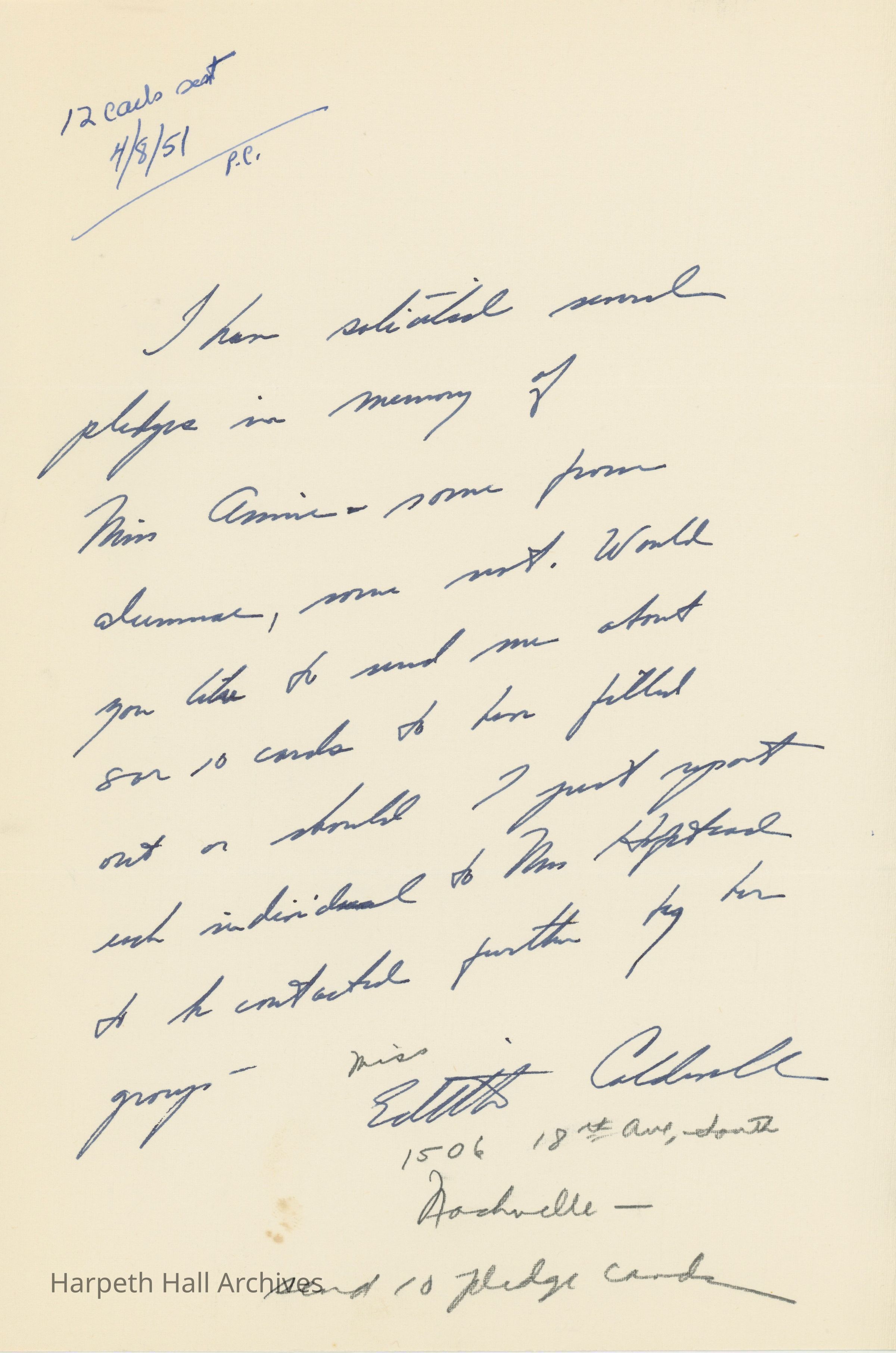 Letter Requesting Pledge Cards, April 1951Entry/Object ID