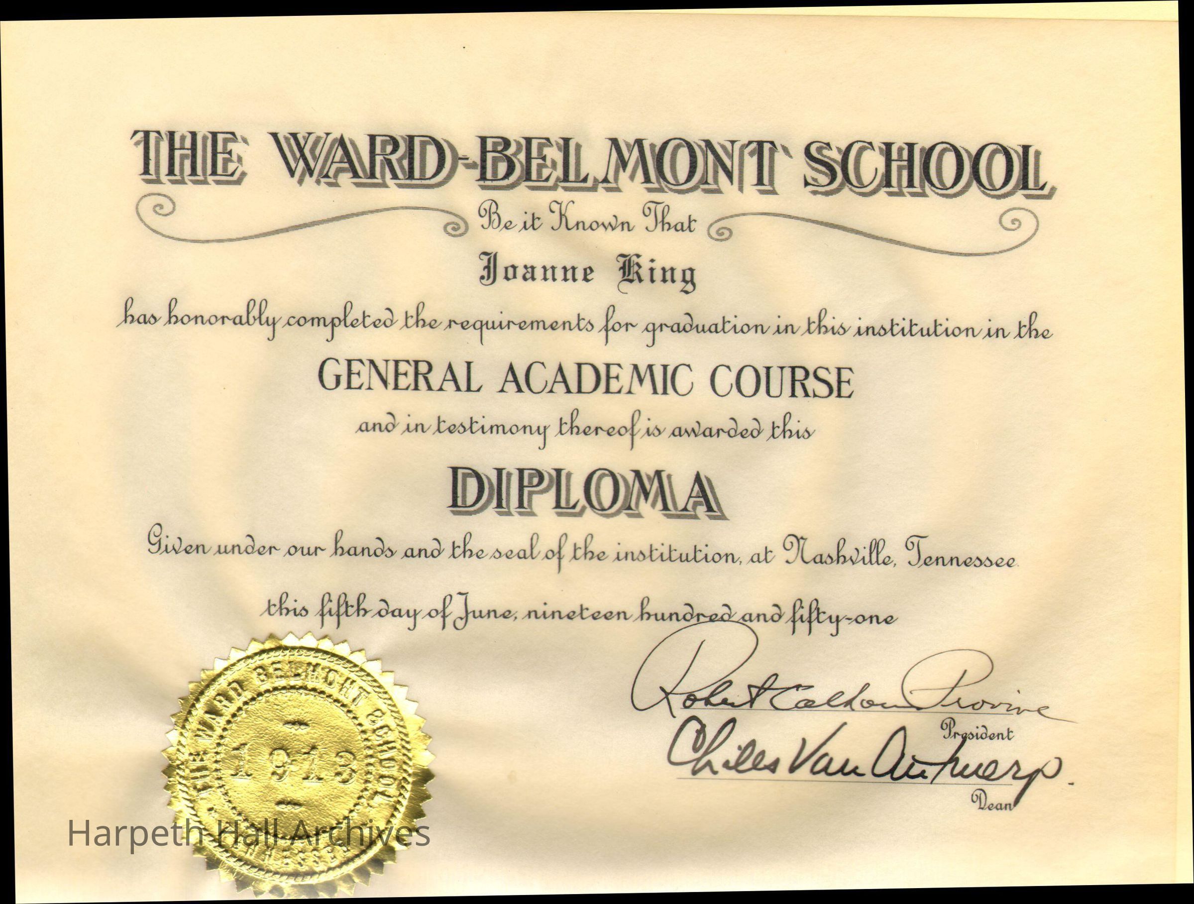 Academics, Artifacts, Award, Education, Schools, Social & Personal Activity, Academics, Artifacts, Award, Education, Schools, Social & Personal Activity, 1951, Alumnae, Class of 1951, Graduation, Diploma, Ward-Belmont