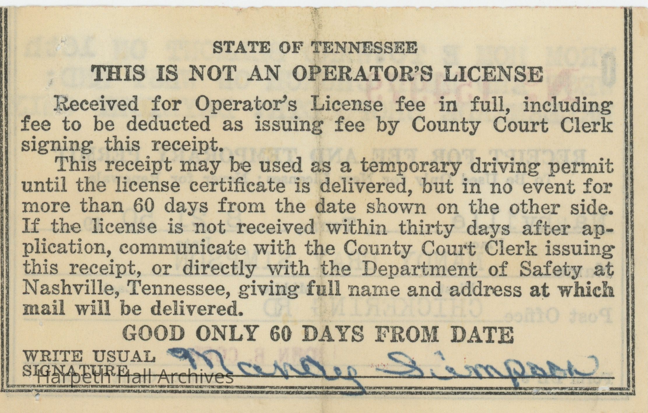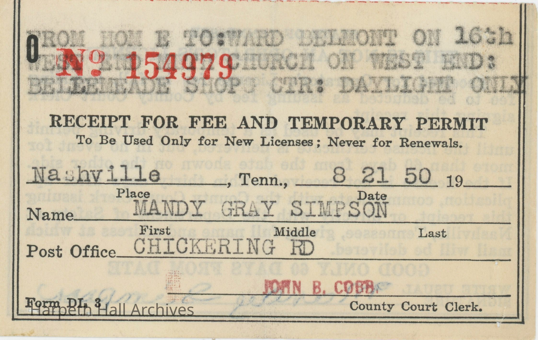 A temporary driving permit for Mandy Gray Simpson, a Ward-Belmont alumna and Harpeth Hall graduate (CO 1954).