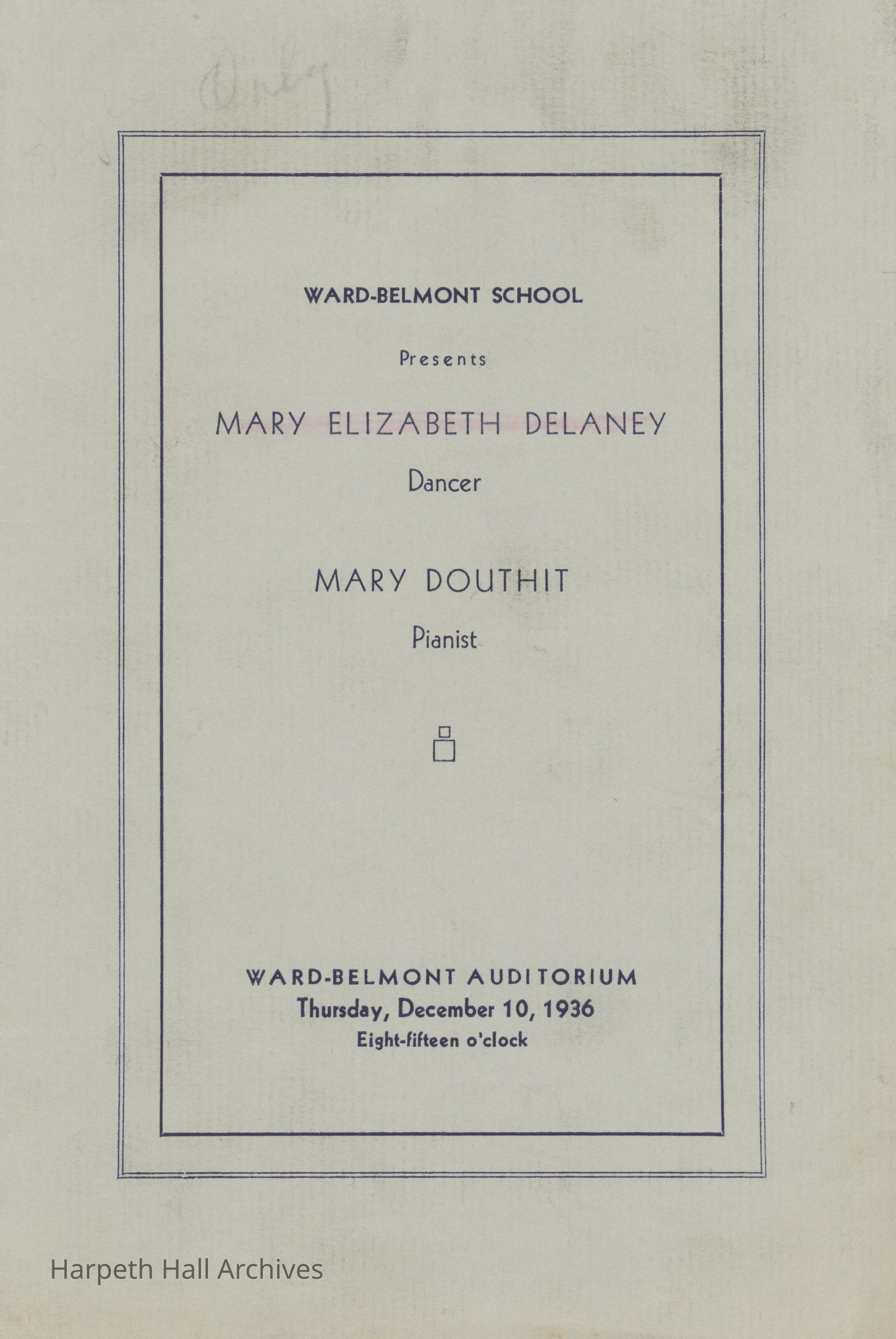 A program for a recital presented by Ward-Belmont School, featuring Mary Elizabeth Delaney (dancer) and Mary Douthit (pianist). Held at the Ward-Belmont auditorium on Thursday, December 10, 1936, at 8:15. The recital consisted of three parts.Context