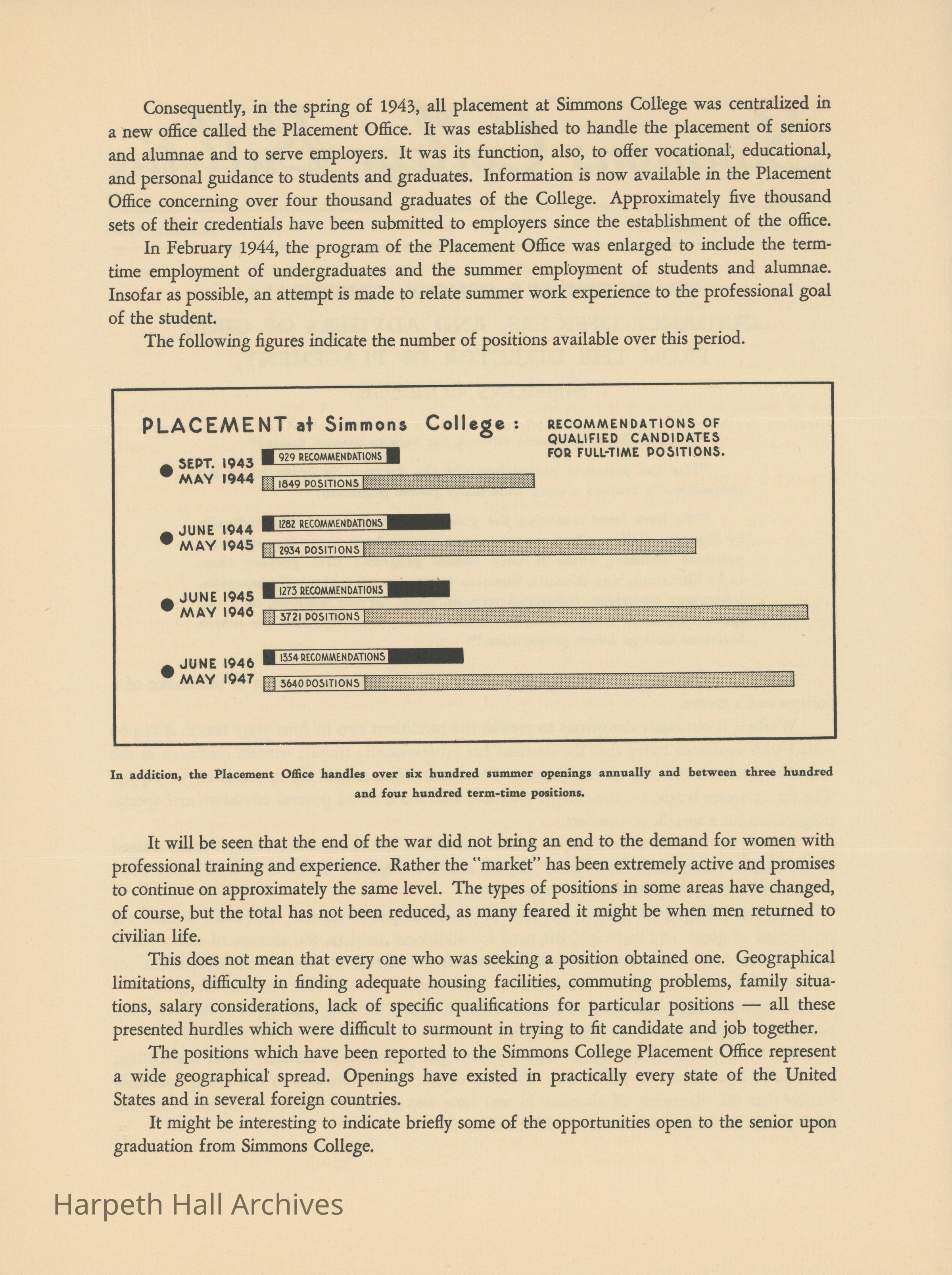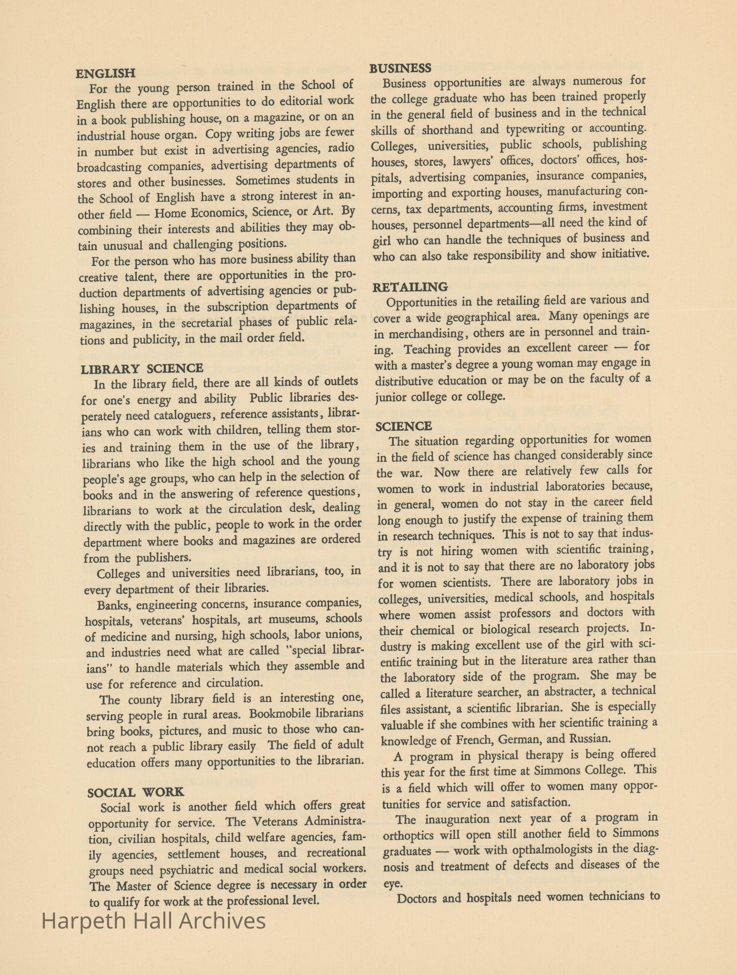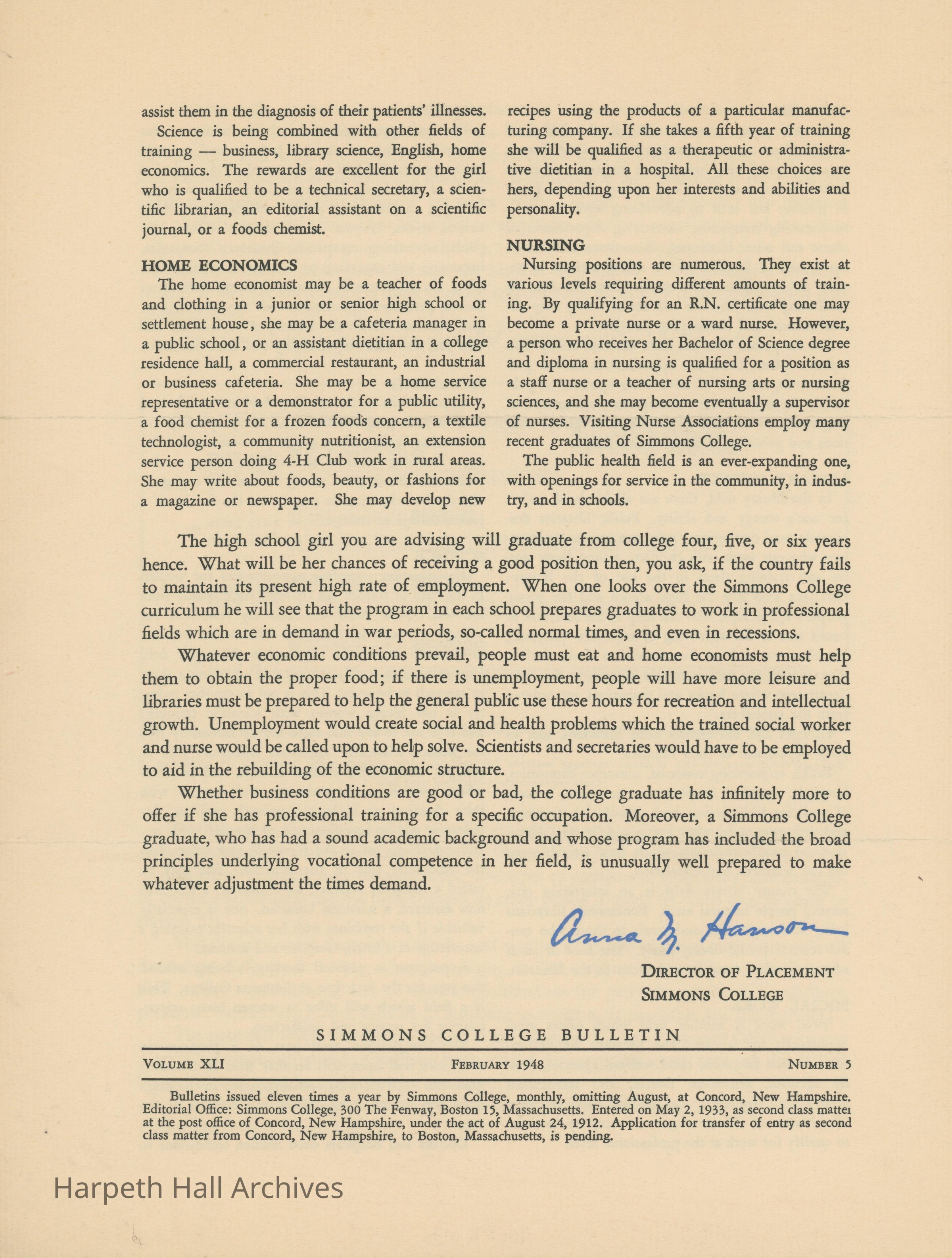 The Simmons College Bulletin that is sent to secondary school principals, guidance officers, and advisers of girls from the Director of Placement at Simmons College. The bulletin is dated February of 1948.Collection