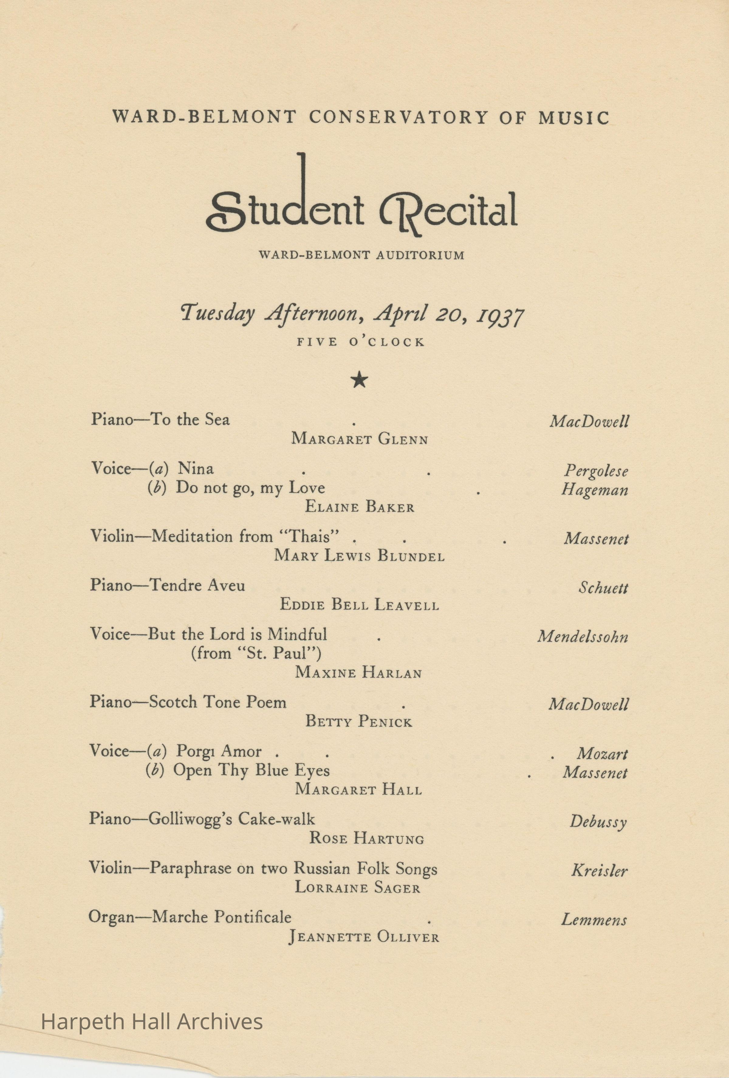 The program for the Ward-Belmont Conservatory of Music Student Recital on April 20th, 1937. 10 students performed during this recital.Collection