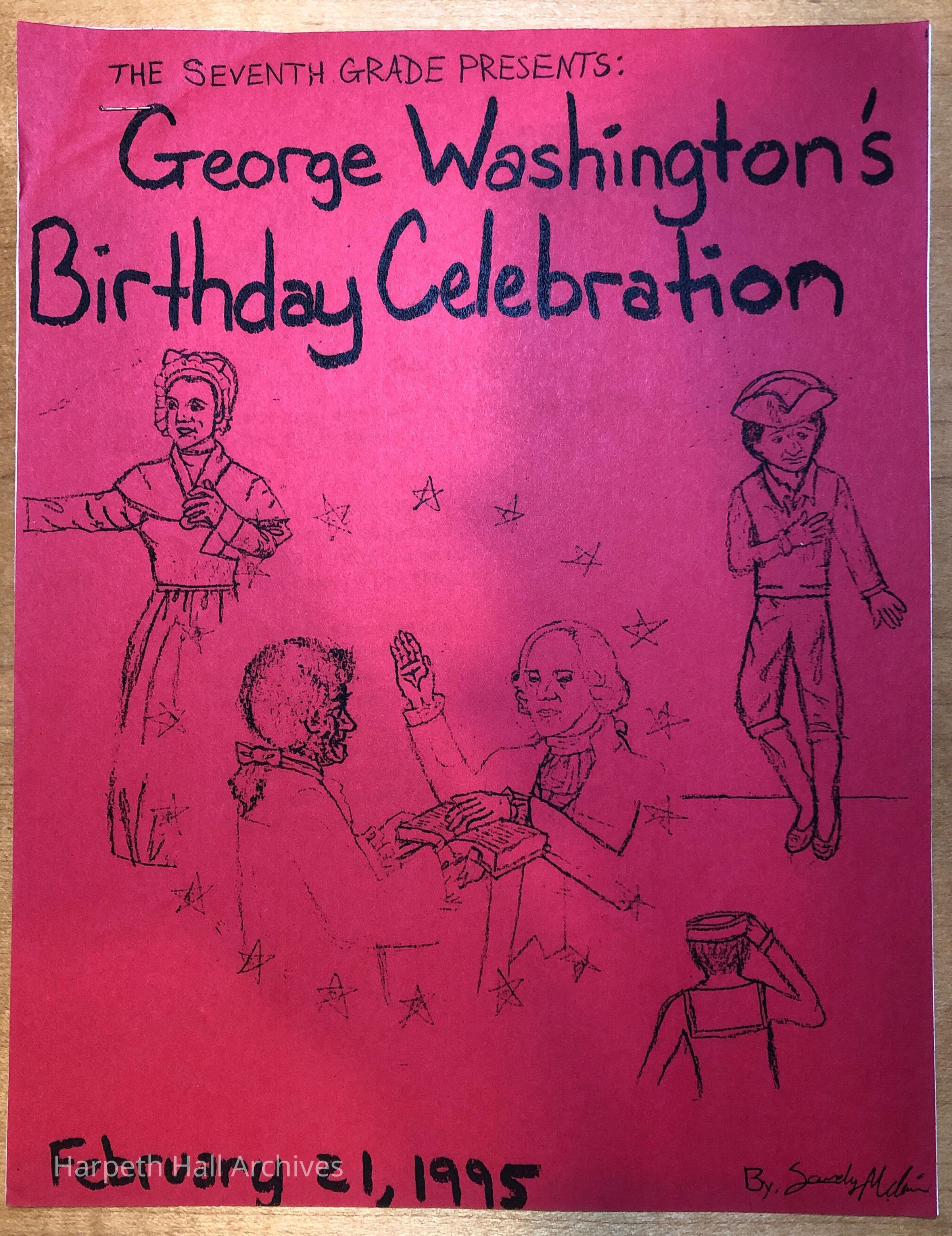 The 1995 program for the George Washington Day Celebration put on by the class of 2000 when they were in the seventh grade. The celebration was dedicated to Susan Russ. George Washington was played by eighth grader Mary "Kathryn" Frazier (1999) and Martha Washington was played by eighth grader Kathryn "Katy" Manier O'Shea (1999). Front cover design by Sandy McCain Cawthon (2000).Context