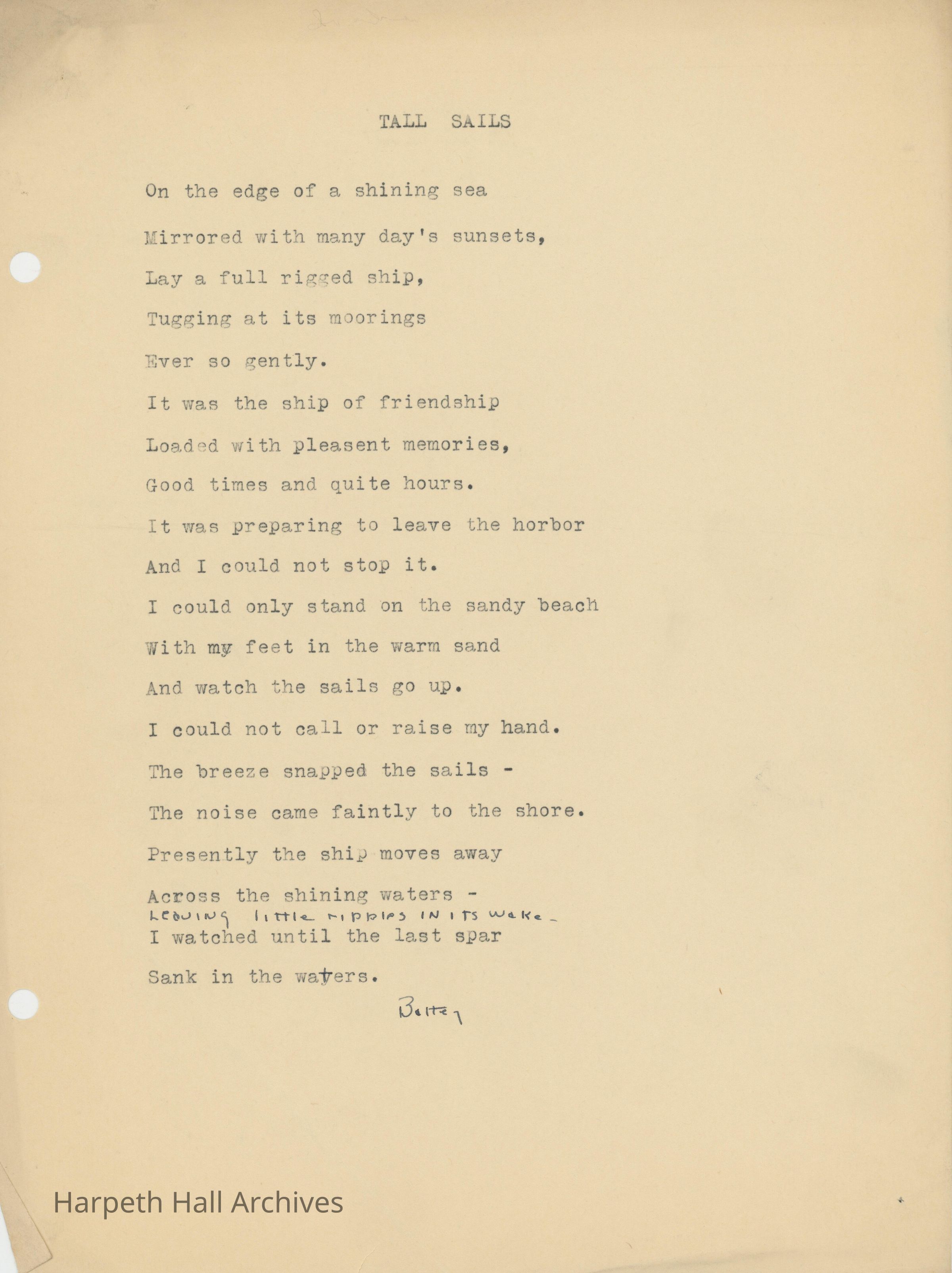 A poem entitled "Tall Sails" written by a Ward-Belmont student during the 1934-1935 schoolyear.