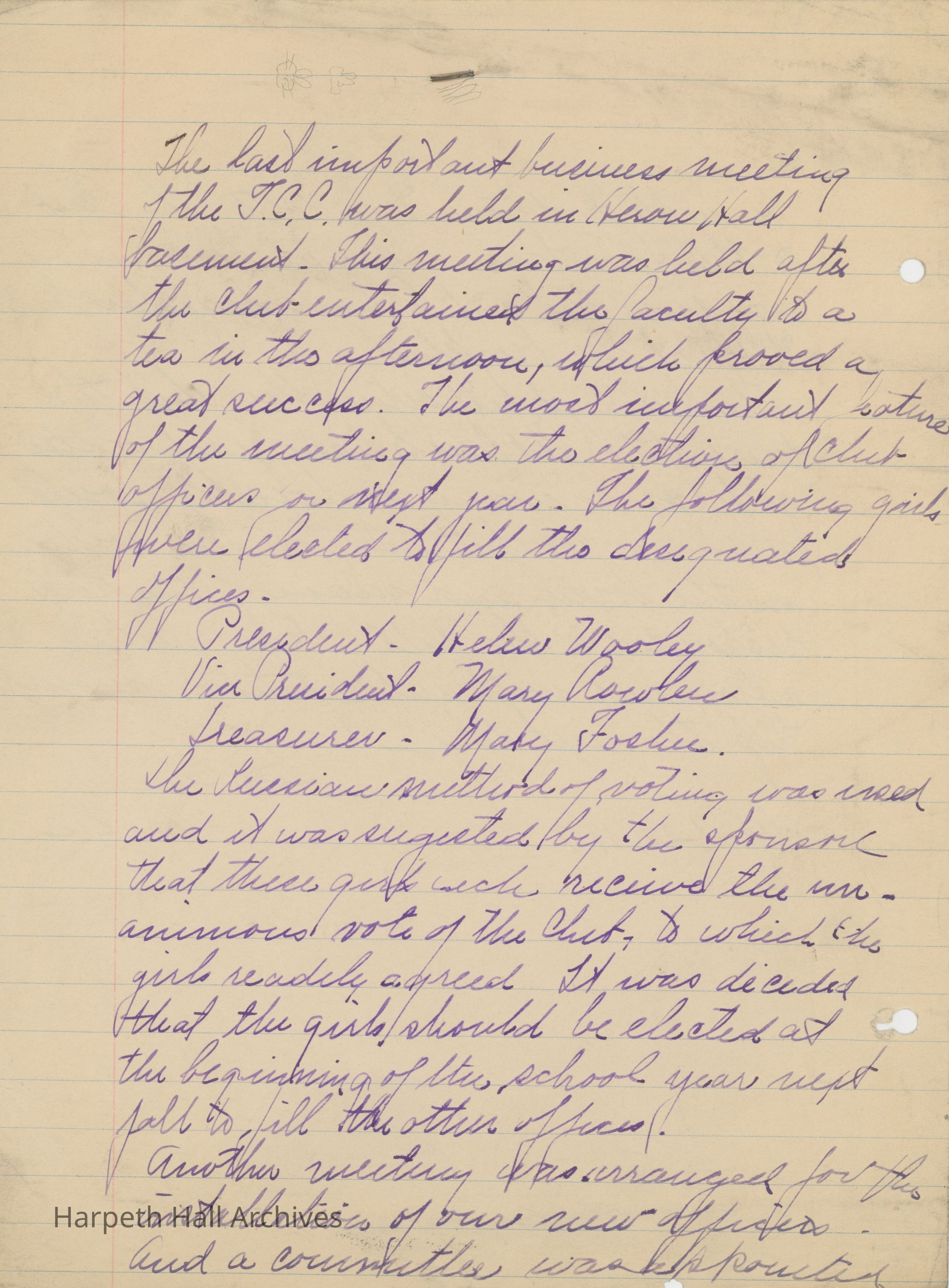 "The last important business meeting of the T.C.C. was held in Heron Hall basement. This meeting was held after the club entertained the faculty to a tea in the afternoon, which proved a great success. The most important nature of the meeting was the election of club officers for next year. The following girls were elected to fill the designated offices. President - Helen Wooley. Vice President - Mary Rowlen. Treasurer - Mary Foshee. The [illegible] method of voting was used and it was suggested by the [illegible] that these girls each received the unanimous vote of the club, to which the girls readily agreed. It was decided that the girls should be elected at the beginning of the school year next fall to fill the other offices. Another meeting was arranged for the installation of our new officers."