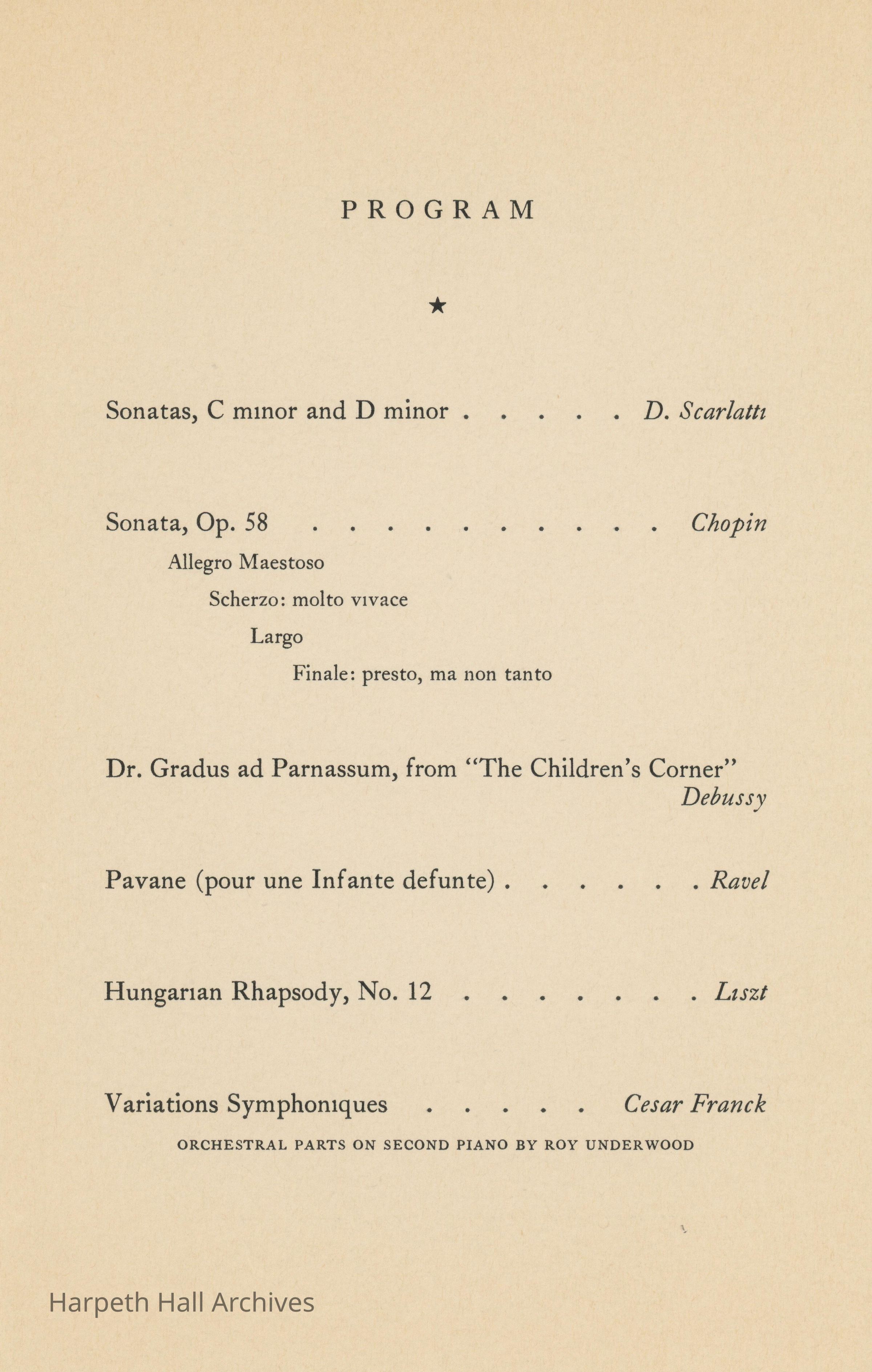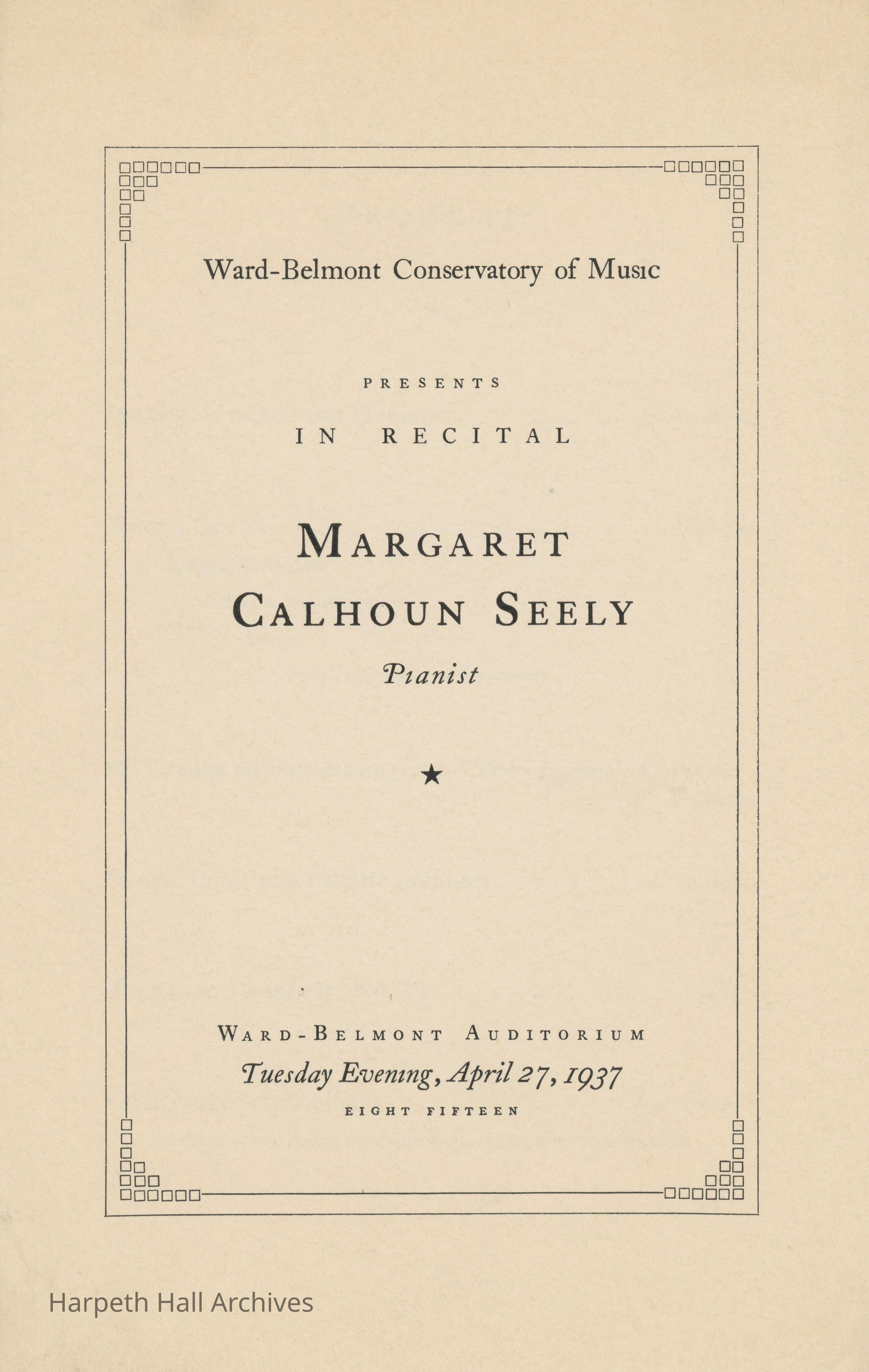 The program for Margaret Calhoun Seely's Piano Recital on April 27th, 1937. Margaret Calhoun Seely was a student of the Ward-Belmont Conservatory of Music.Collection