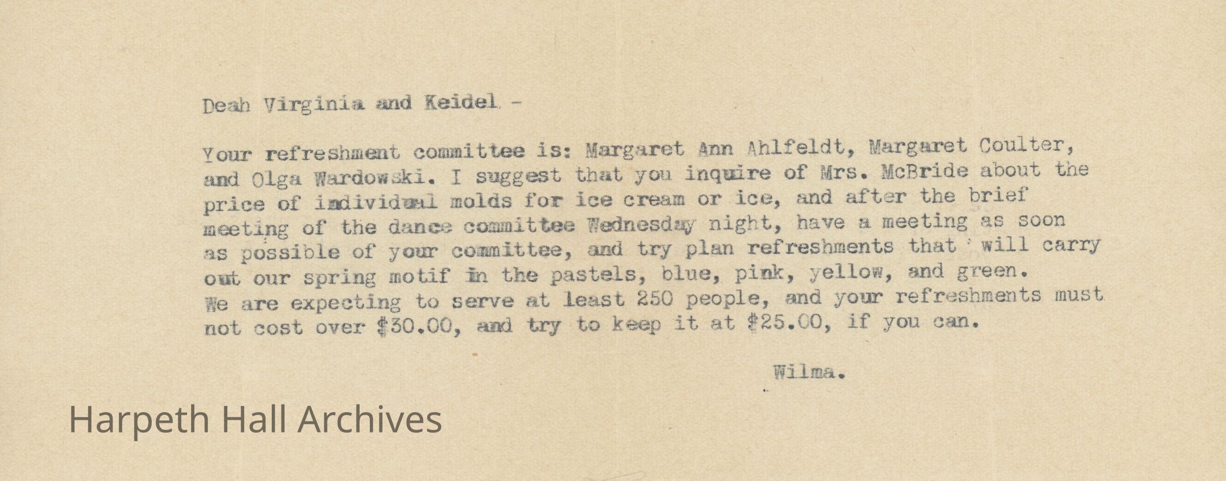 A letter regarding refreshment details including the committee, cost, and theme.