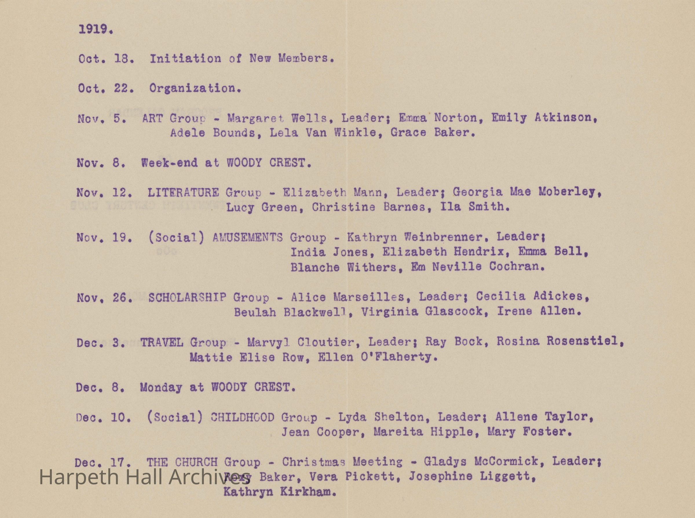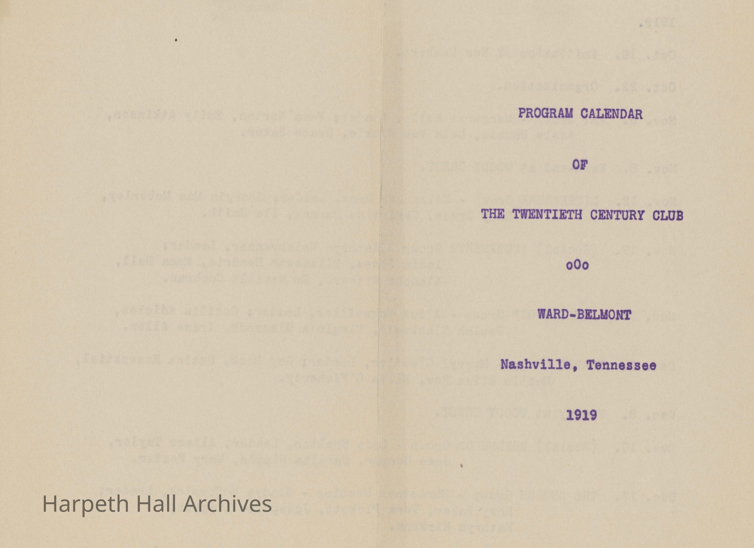 A program calendar for the Twentieth Century Club of Ward-Belmont in Nashville, Tennessee in the year 1919. Eleven events are noted in the program, spanning from October 18 to December 17.Context
