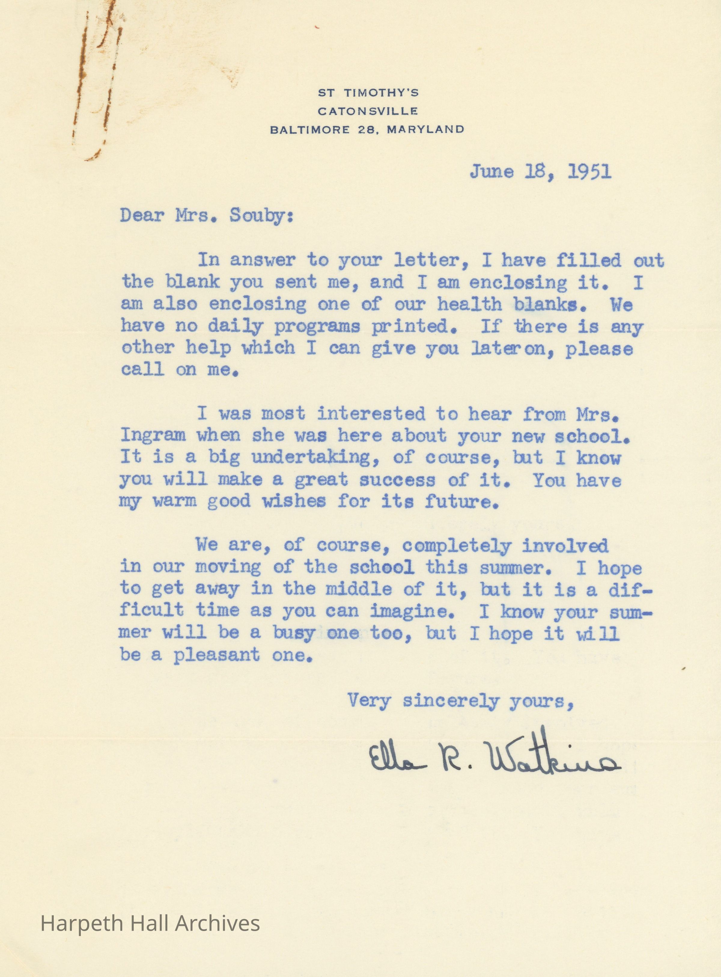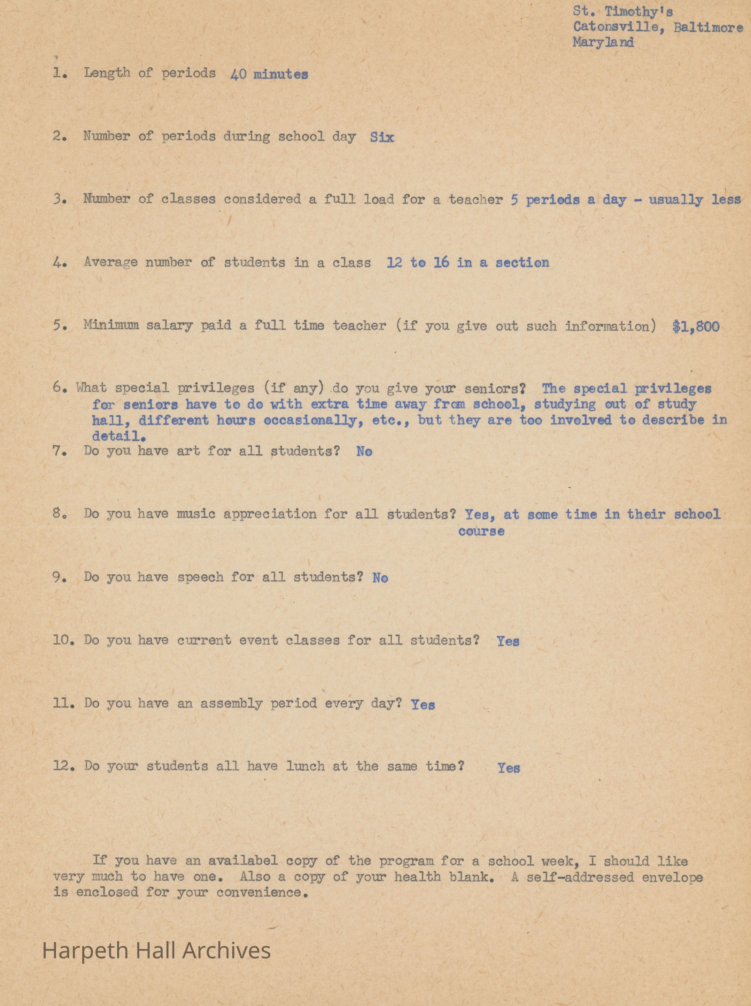 Letter and questionnaire to Susan Souby from St. Timothy's Girl's School in Maryland. The letter notes of the busy summer Mrs. Souby has ahead of her as she assumes the role of Harpeth Hall's incoming principal. The questionnaire answers Mrs. Souby's questions about the structure and atmosphere of St. Timothy's School.Context